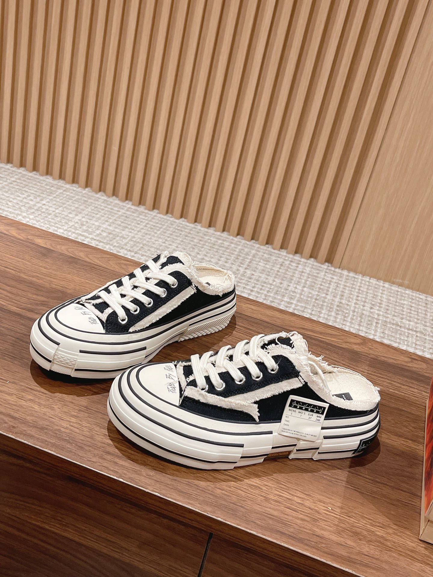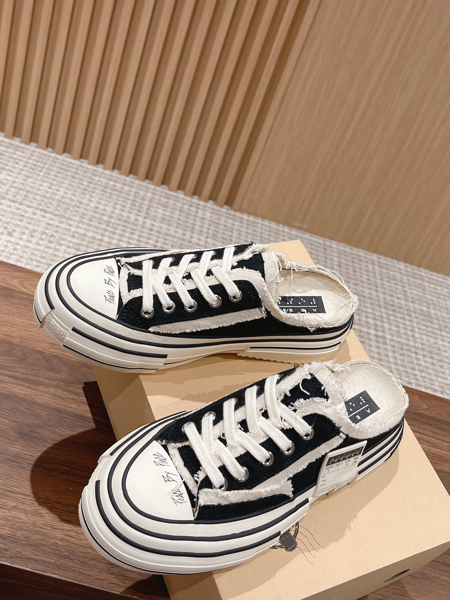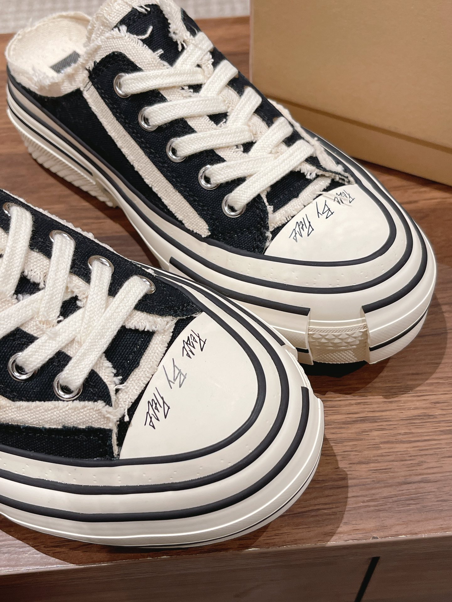 [Top Version] Guan-produced | xVESSEL Certified. Wu Jianhao x Vessel Hobbit Vulcanized Canvas Couple Shoes —— This canvas shoe features a cutting-edge design, combining three pairs into one, with frayed detailing on the laces and tongue. The Hobbit series 𝙭𝙑𝙀𝙎𝙎𝙀𝙇 claims to be the world's first cork vulcanized shoe, full of artistic and retro vibes. At the same time, the shoe's design carries a strong sense of deconstruction and reassembly, which is why it looks like a canvas shoe yet feels very sci-fi and spatial. The midsole is filled with cork, perfectly blending traditional handmade leather shoe craftsmanship with vulcanized shoe techniques. The upper design also follows the deconstruction and reassembly style, taking coolness to the extreme.