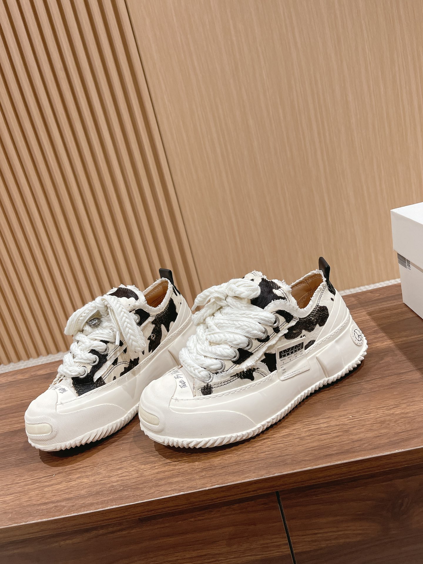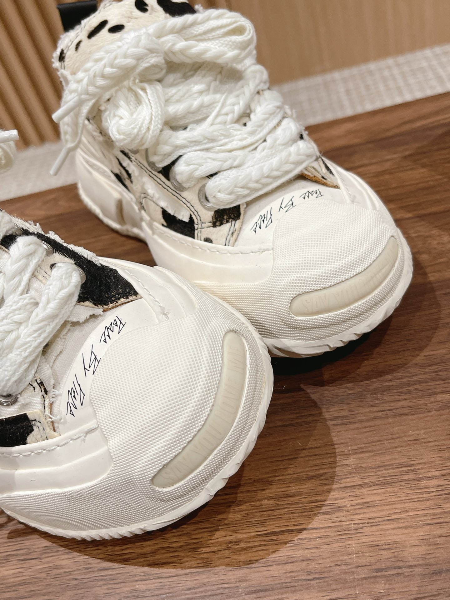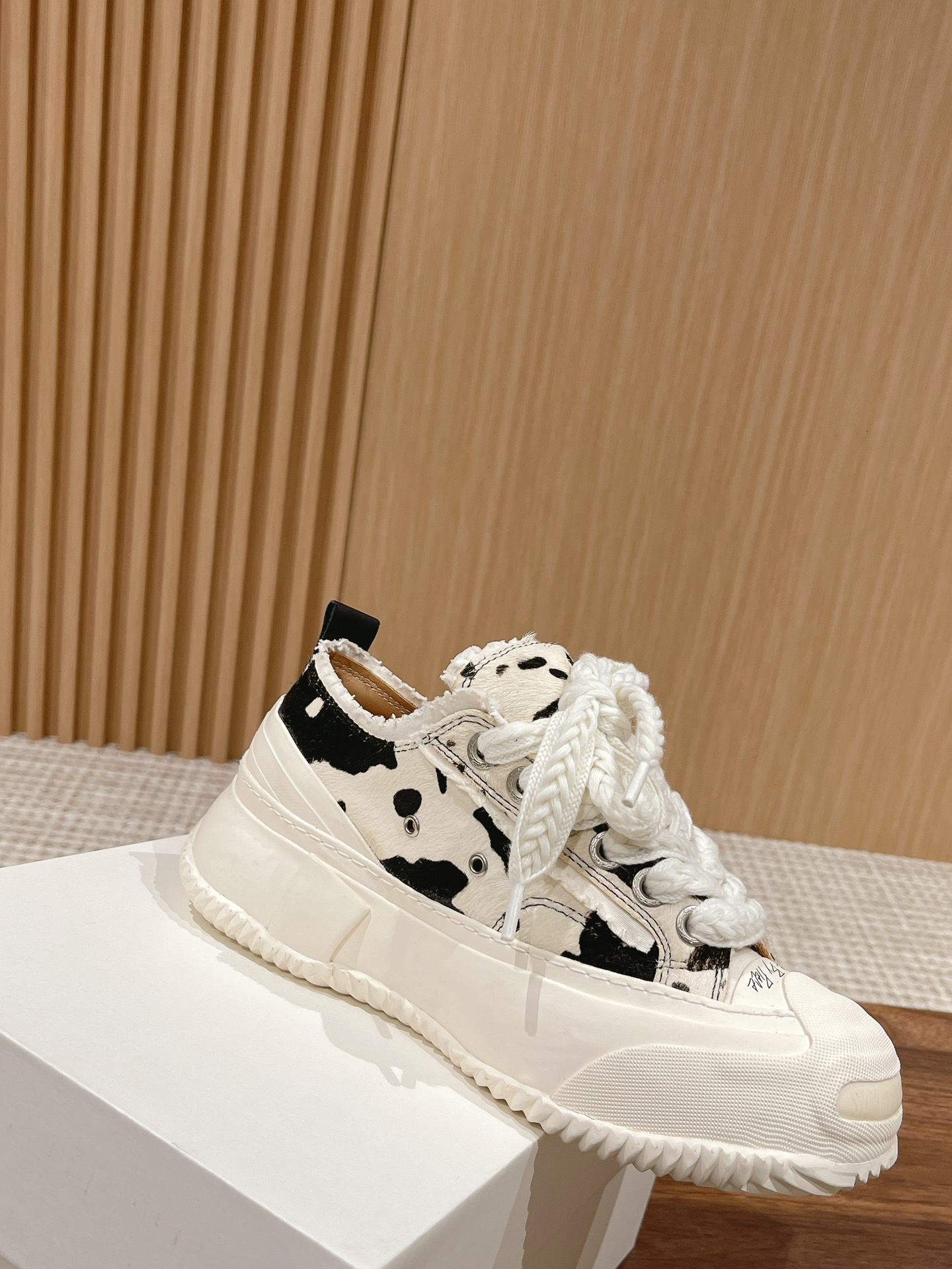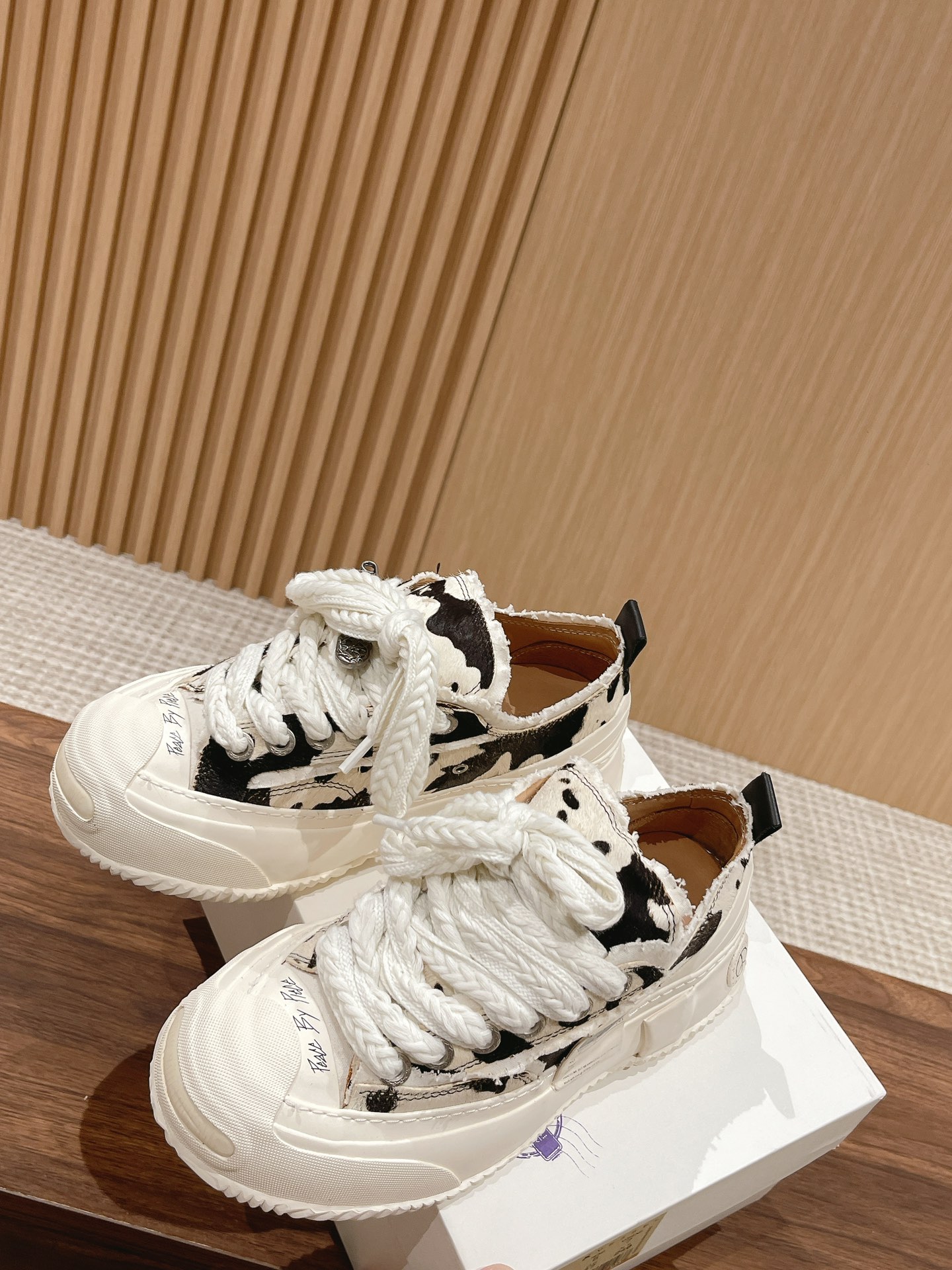 Upper is washed canvas, lining is cowhide ~ Custom molded combination sole………… Deconstructed style, smiley face embroidery, large pin accessory, photosensitive letters on toe cap, full of details, looks incredibly good on feet, adds height and makes legs look slimmer