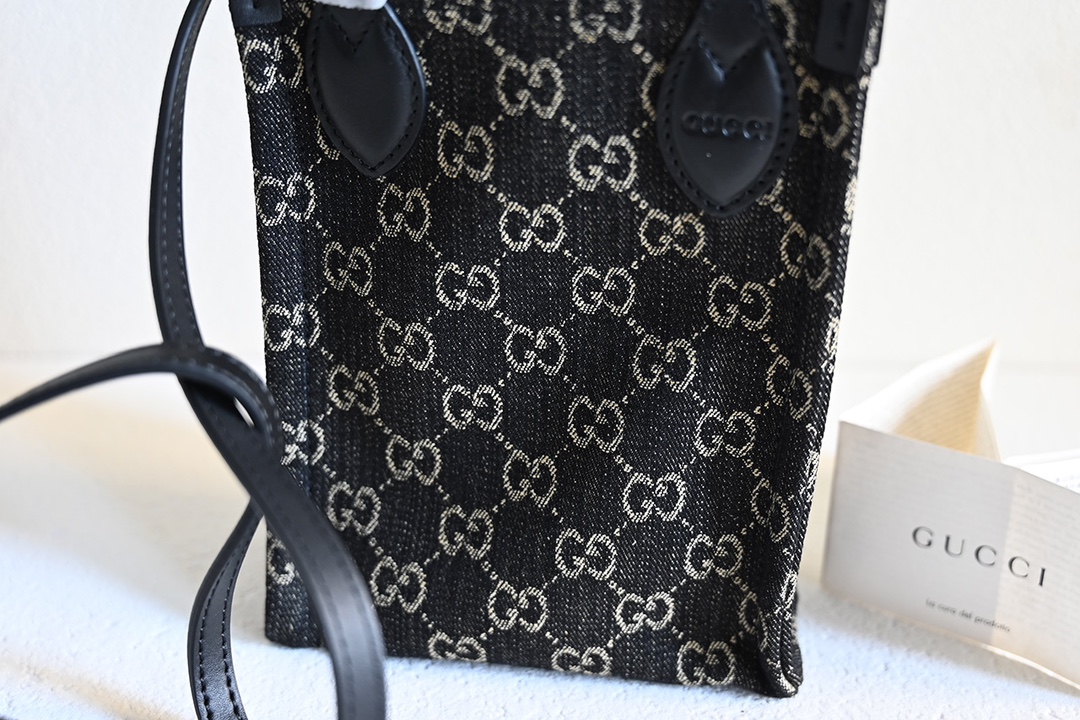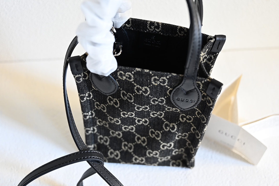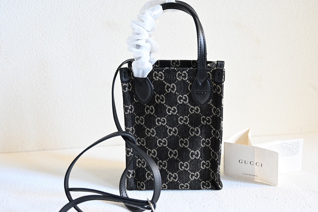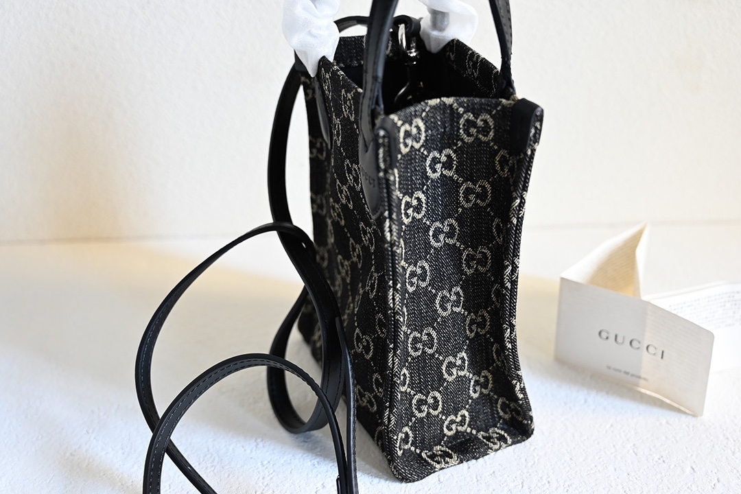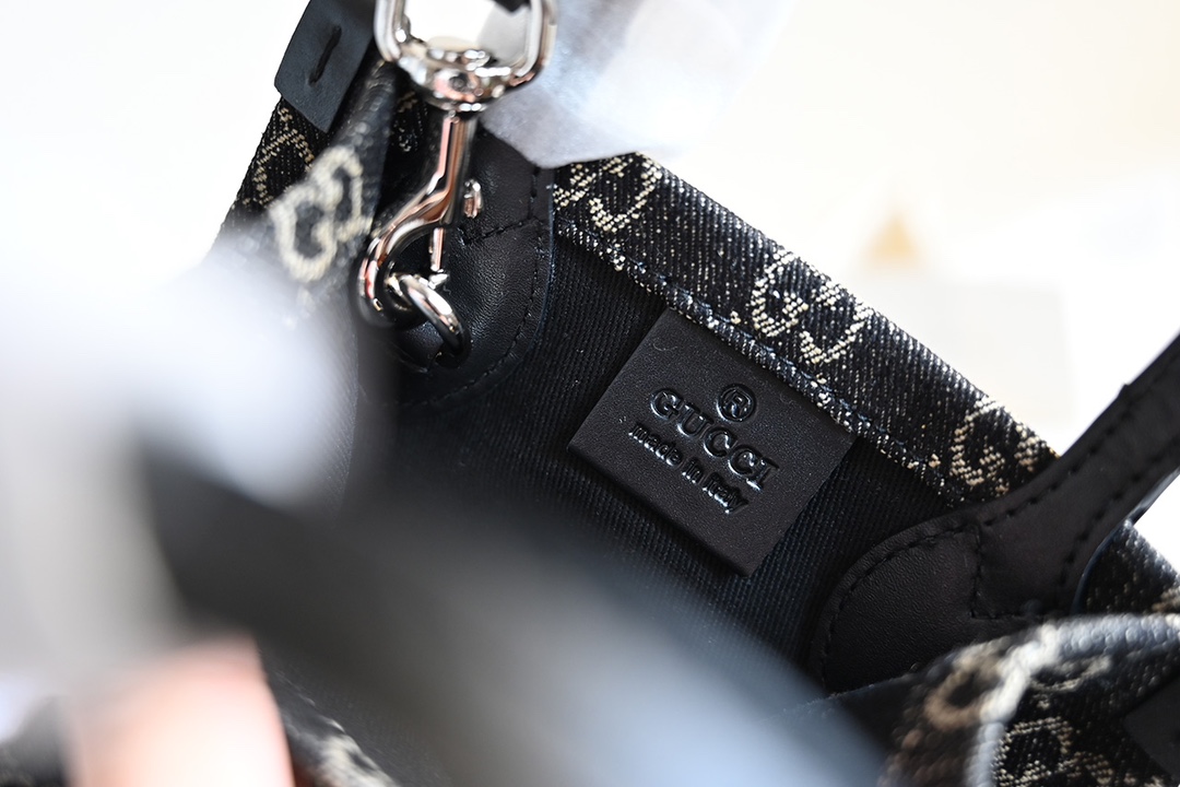 GG Small Tote Bag. In the 2024 Early Spring Collection, the Ophidia series introduces multiple shoulder bags, tote bags, and handbags, meticulously crafted from GG black denim and skillfully integrated with silver-toned metallic accessories to create a contrasting charm. Made from black and gray GG denim with black leather trim, this product is a Gucci Tag selection item. It supports NFC technology, offering an innovative digital experience. Handle: 12 cm (height) detachable shoulder strap.