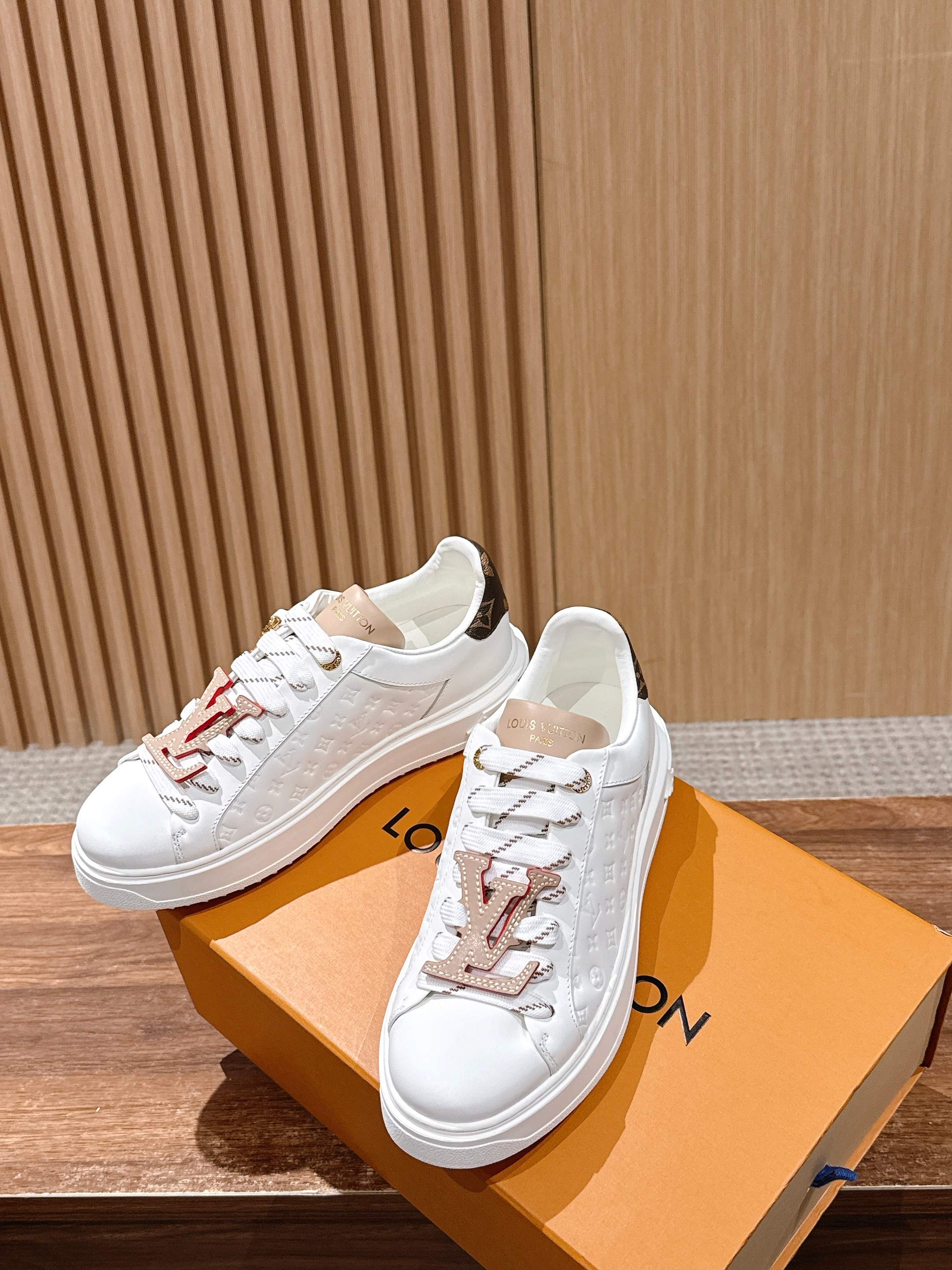 [Top Version] Louis Vuitton # New LV pattern printed classic thick sole sneakers, new design. This Time Out sneaker features soft calf leather embossed with a mini Monogram pattern, refreshing the classic L,V design. 3D logo accents, thick ribbed outsole, and engraved eyelets add exquisite details. Size: 35-39 (40/41 custom order)