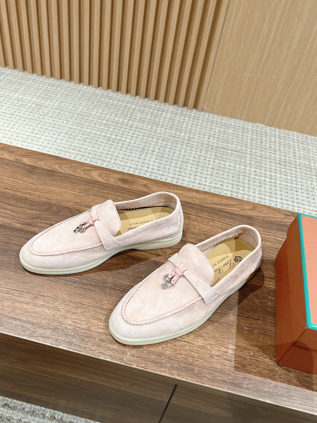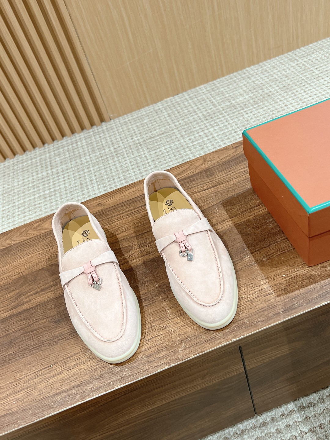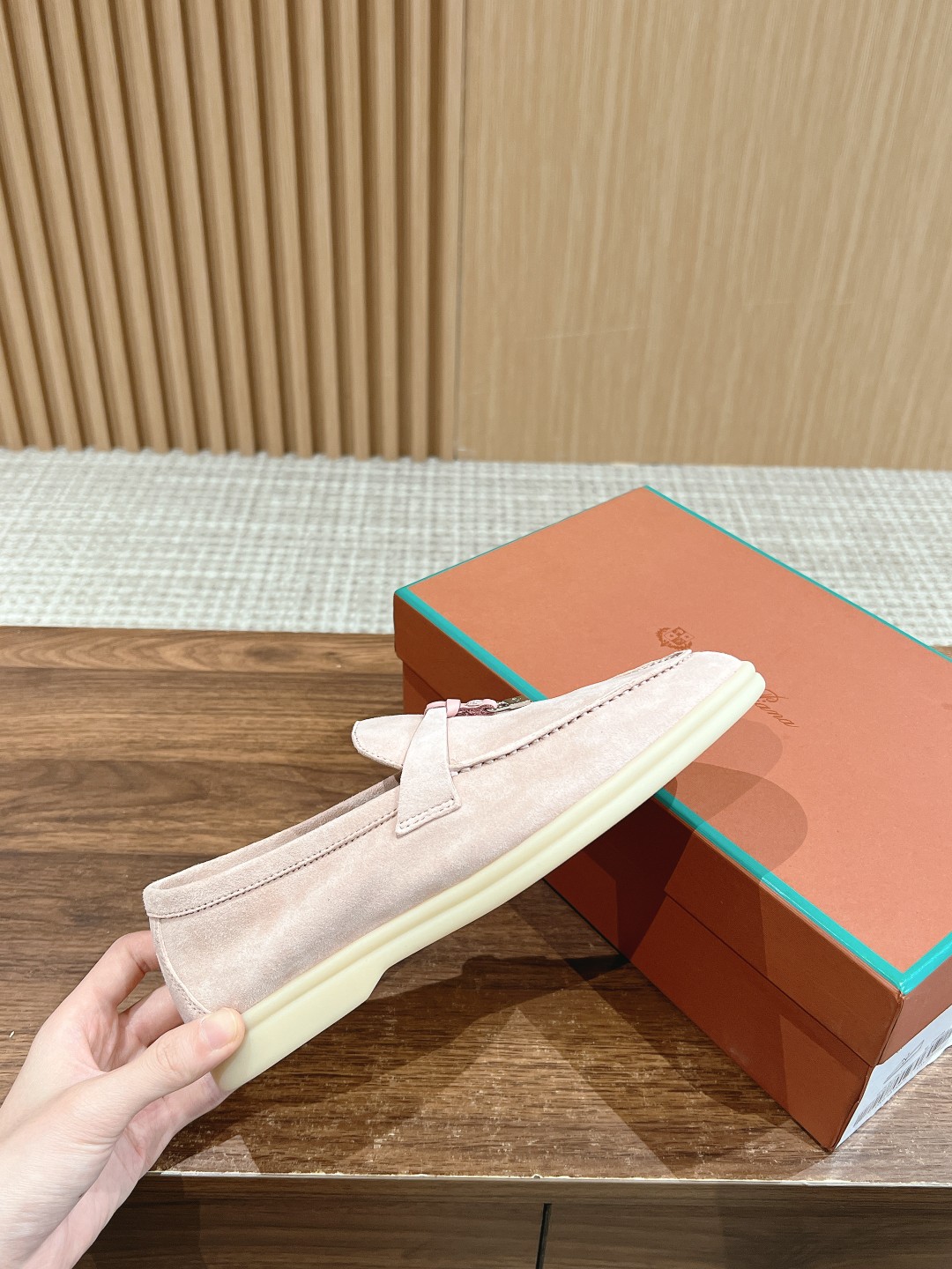 Fabric is imported lamb suede, cowhide lining, light-colored rubber sole. This is a common feature of all Loro Piana casual footwear.