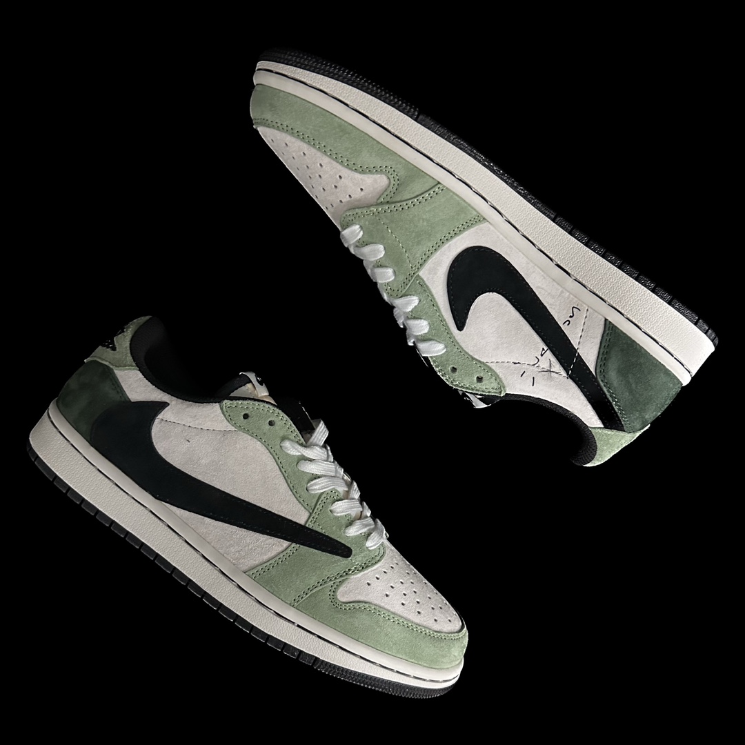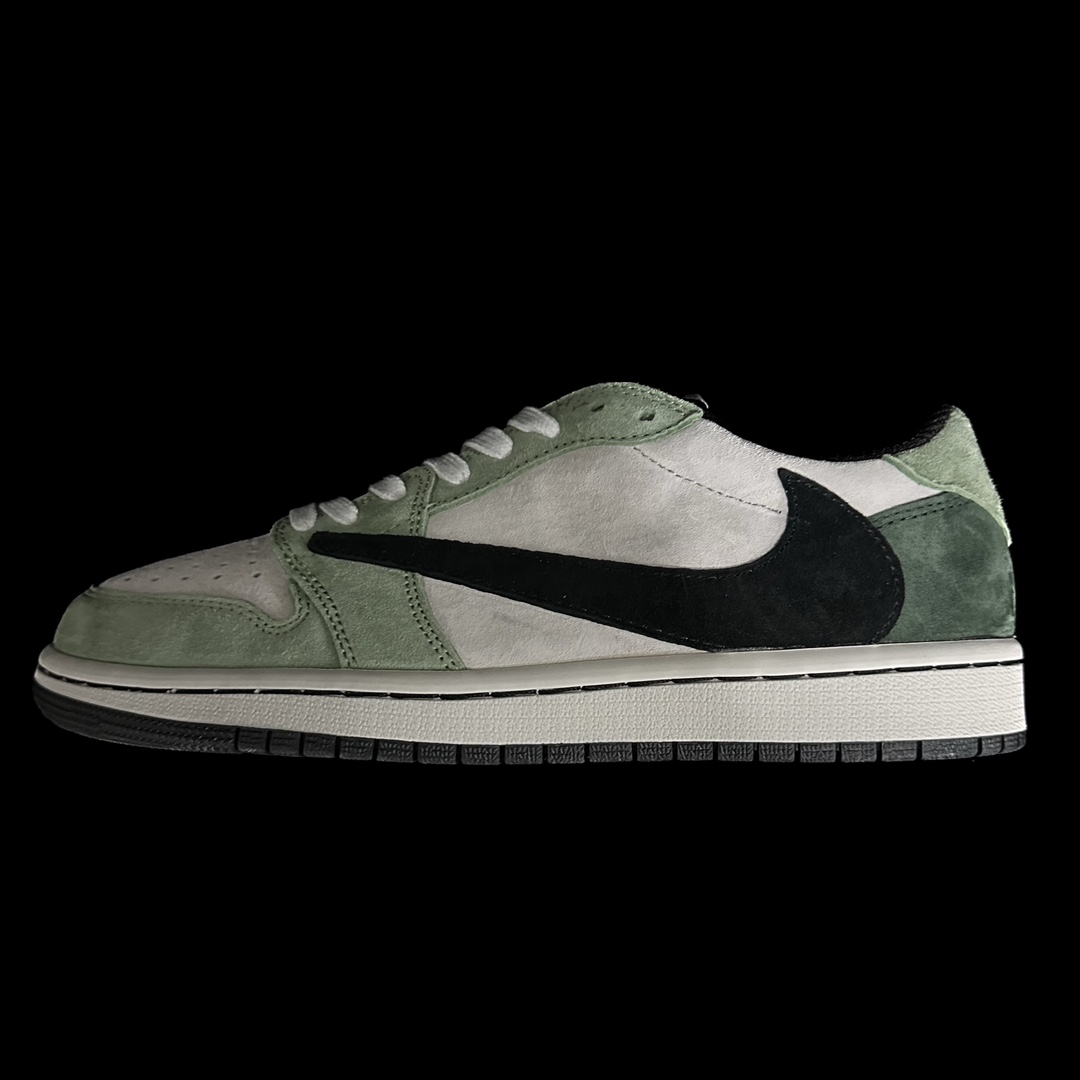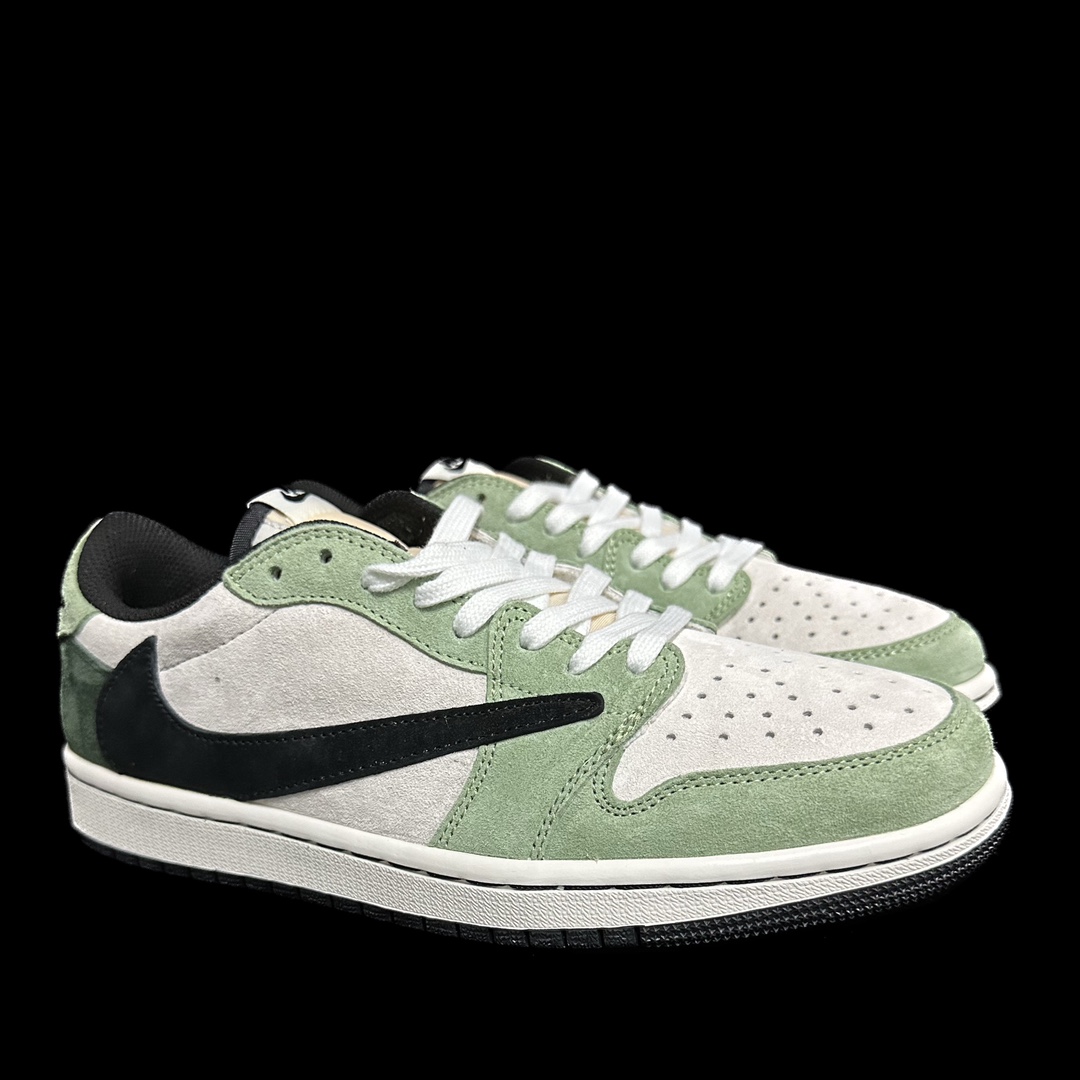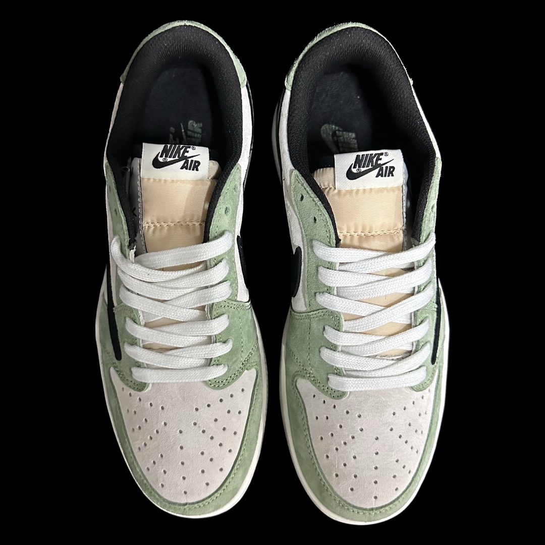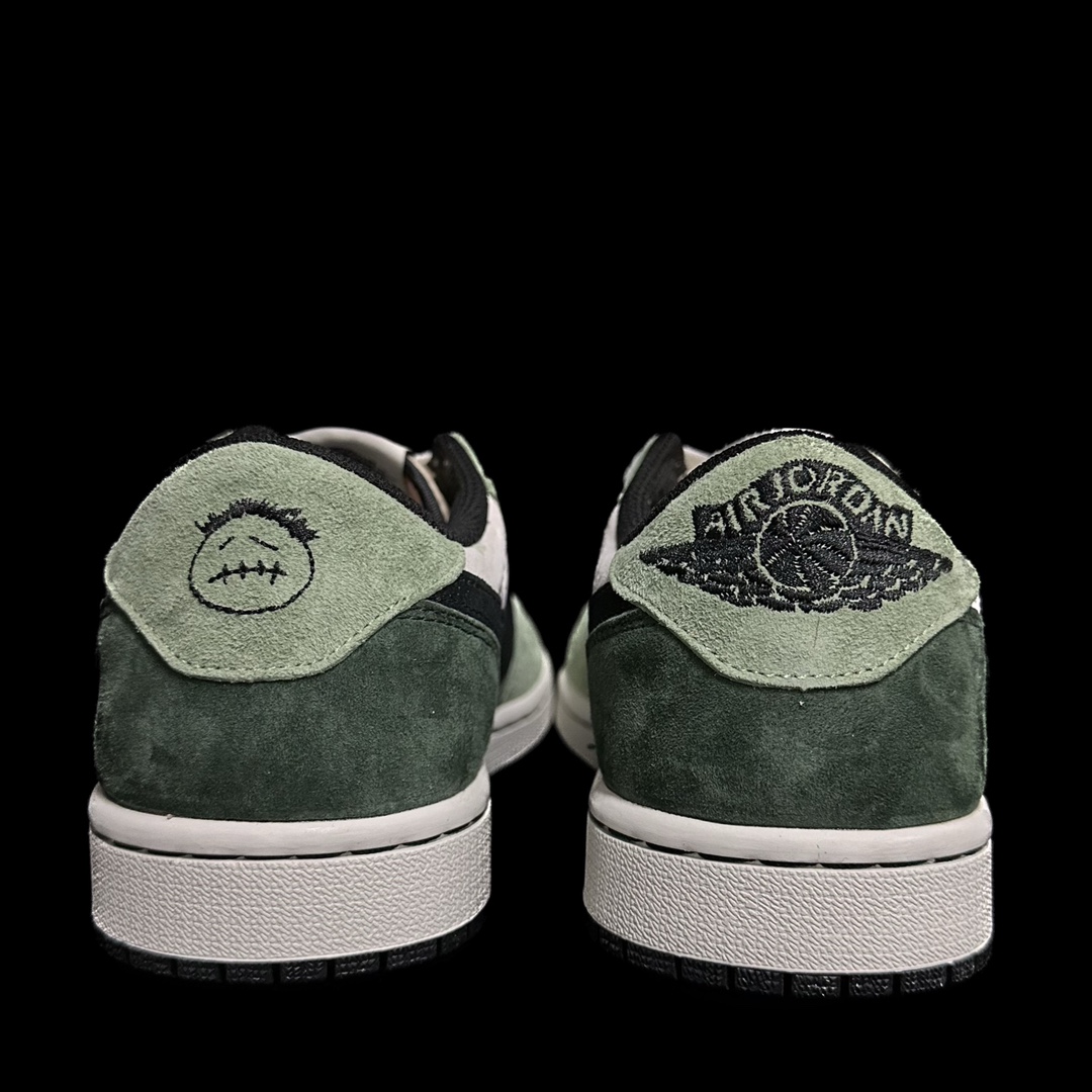 This design continues the overall style of the original collaboration, with the upper featuring Travis Scott's signature green. Paired with a white frame, it expresses the "Reverse Mocha" theme. The iconic reverse Swoosh on the side, laces, and midsole are all in a light gray, presenting a retro, vintage Vibe aesthetic. The left and right heels are embroidered with a black cactus jack face and the Wings logo respectively, highlighting the collaborative identity.