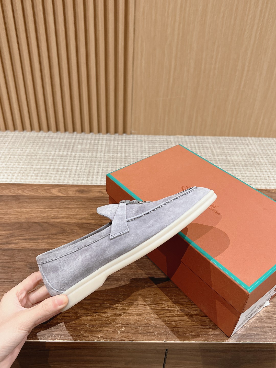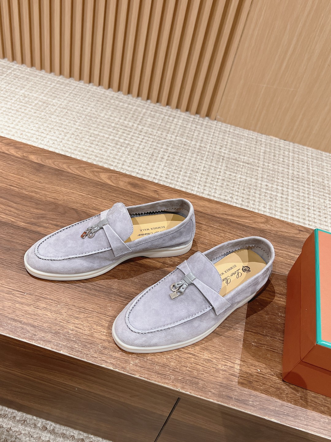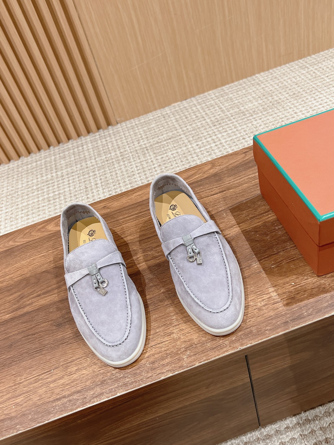 Fabric is imported lamb suede, cowhide lining, light-colored rubber sole. This is a common feature of all Loro Piana casual footwear.