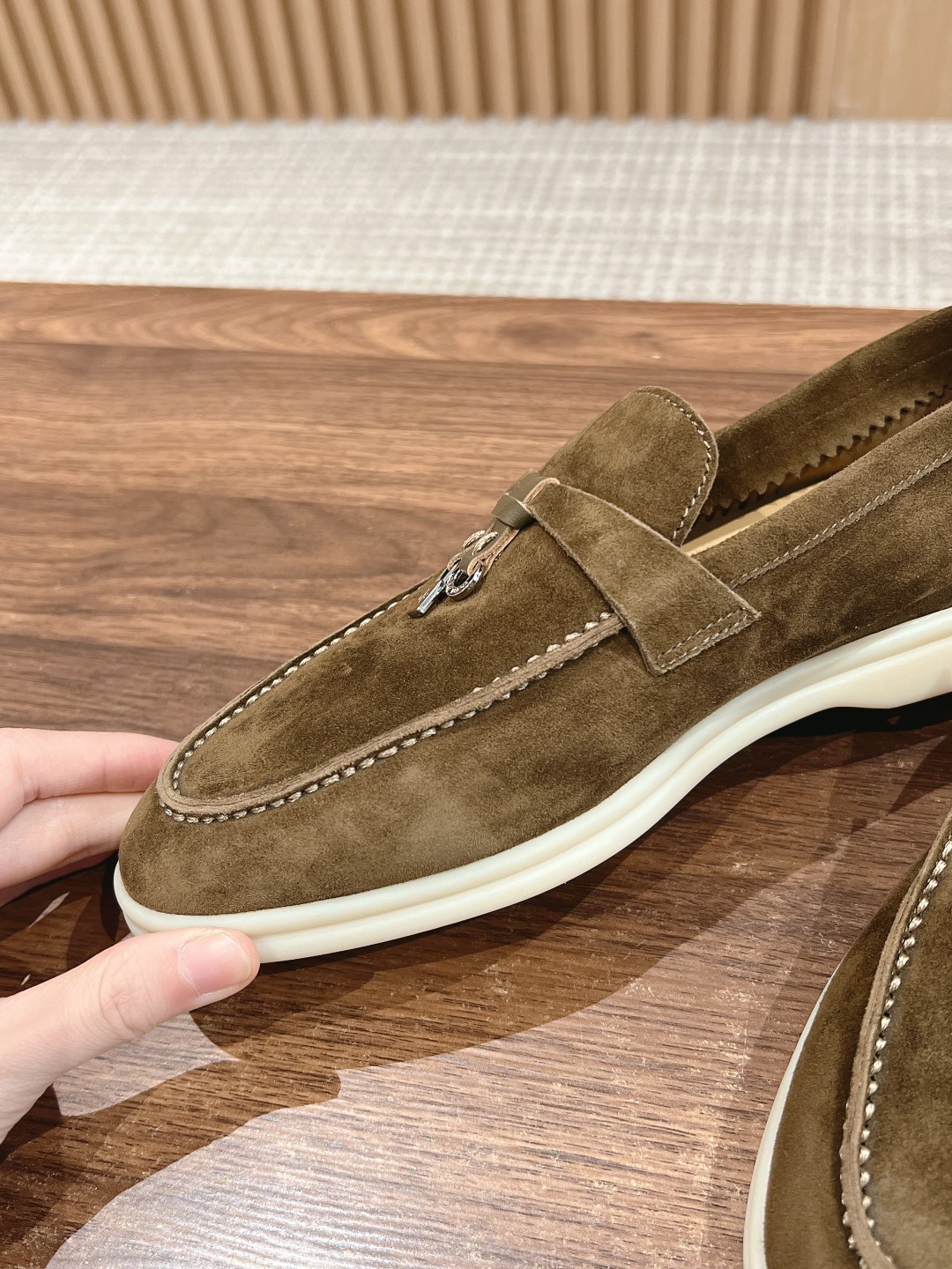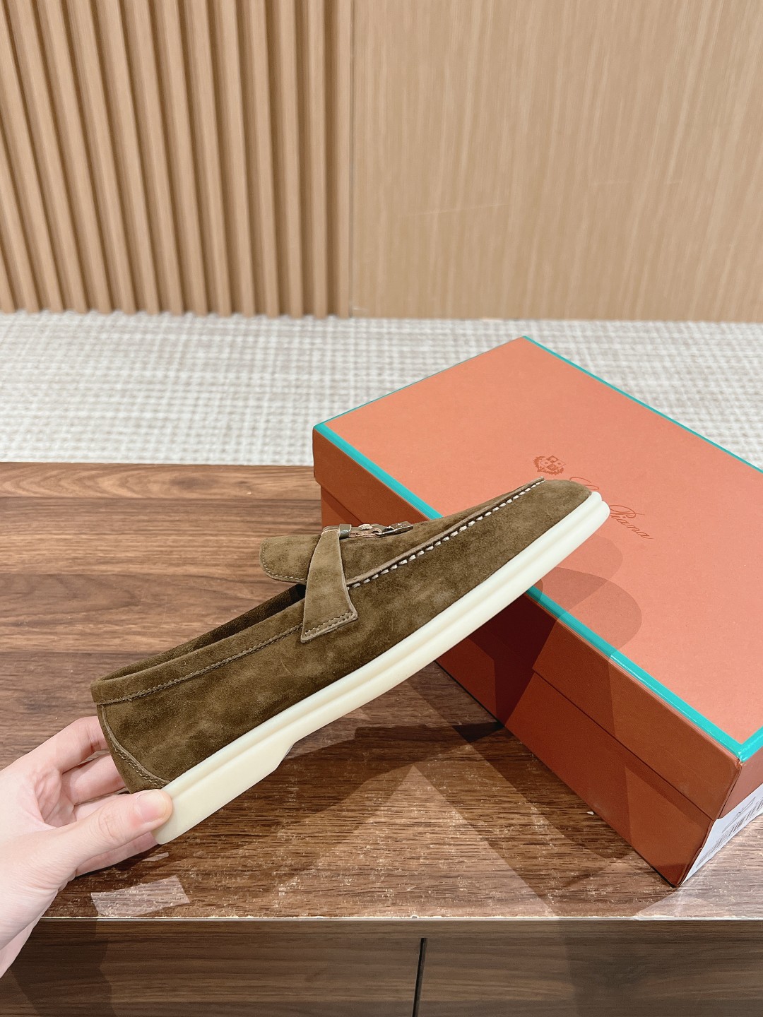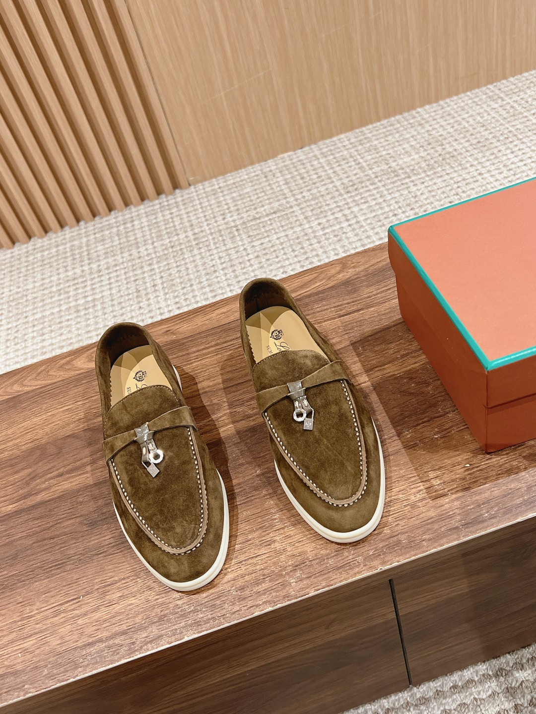 The fabric is imported lamb suede, with cowhide lining and light-colored rubber soles, which are common features of all Loro Piana casual shoes.