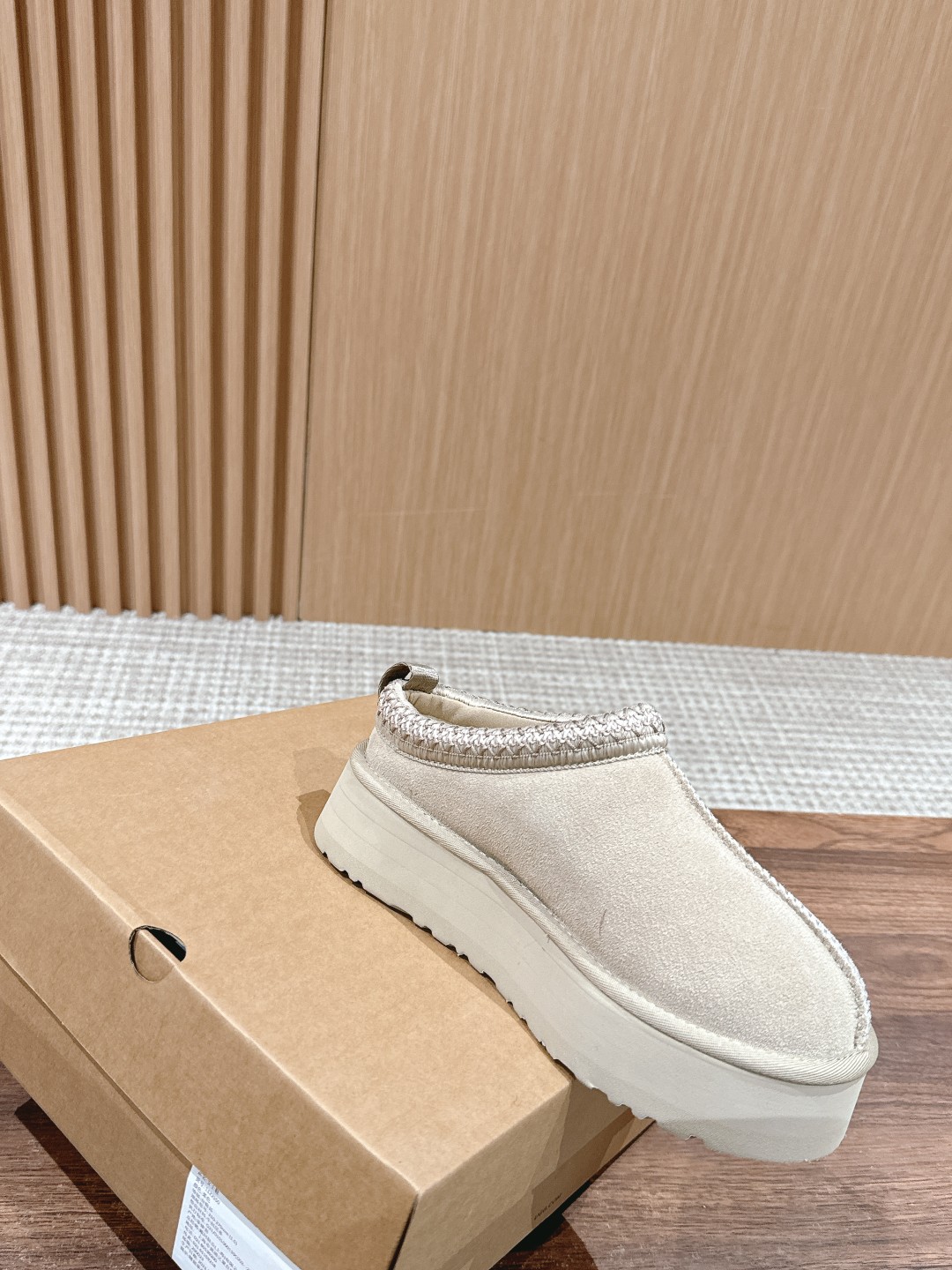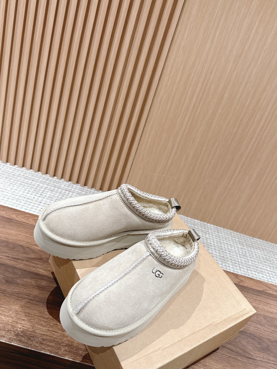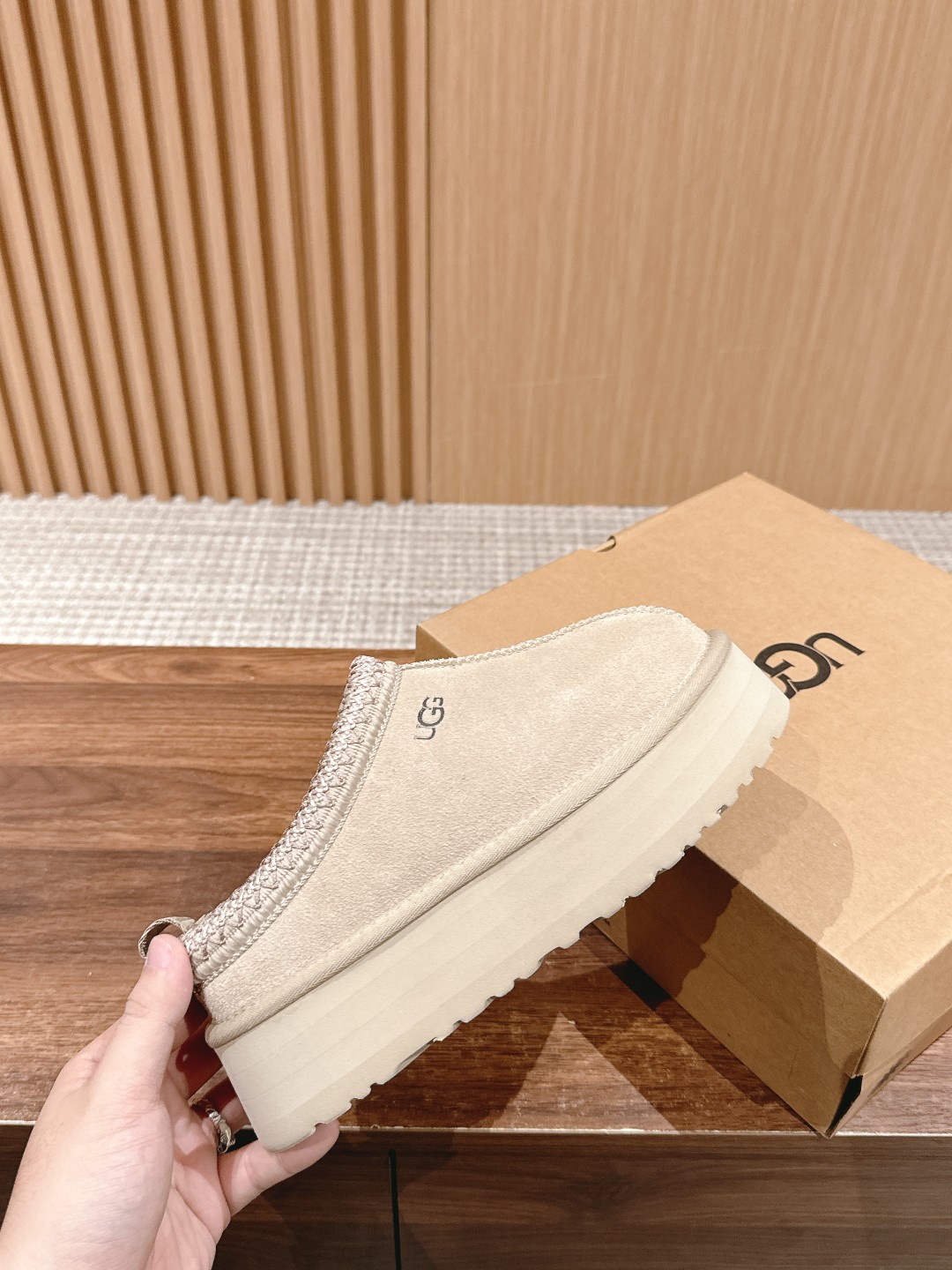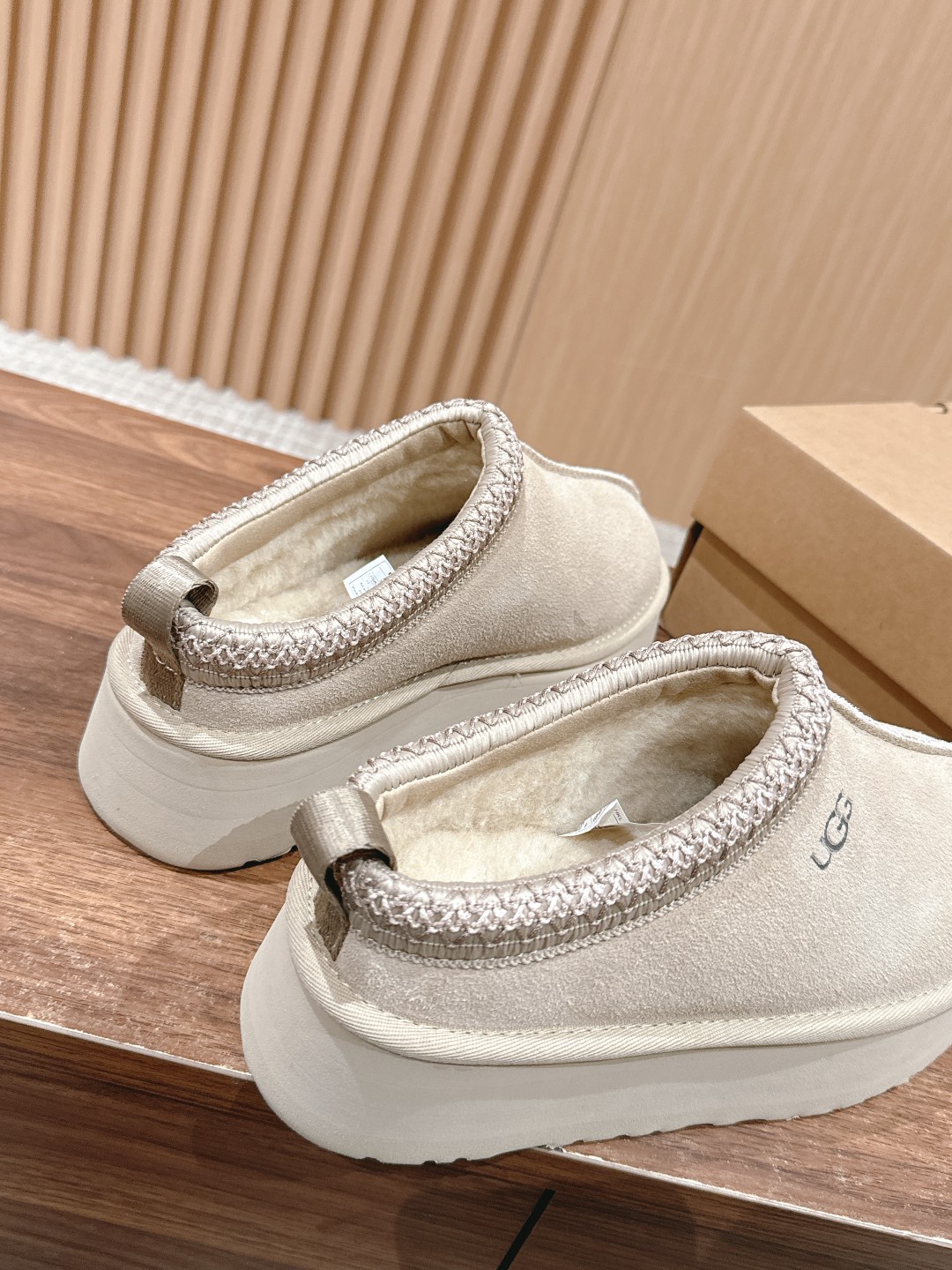 [Top Version] [Dongguan Production] UGG Tazz Suede #Autumn Winter New Product Tazz Platform Slippers. New furry slippers feature ethnic style woven embroidery, retro and stylish. Super comfortable slip-on design, worn by many celebrities. No need to say more about how popular it is on Instagram and Xiaohongshu—it sells out as soon as the season hits! Plush and substantial genuine shearling. PVC foam ultra-light sole, sole thickness approximately 4cm. Size: 35-39 (Size 40 is custom-made and non-returnable).