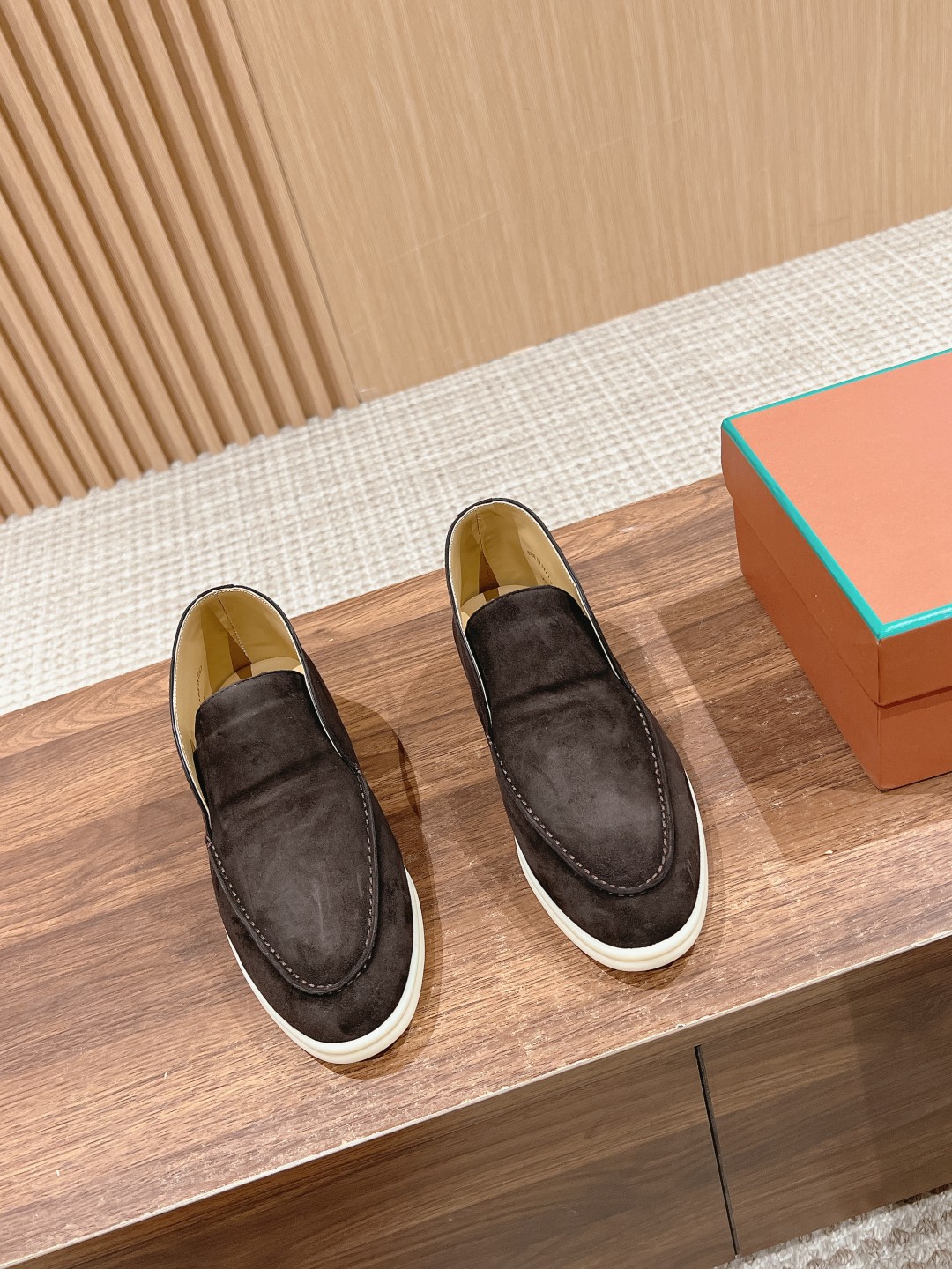 The fabric is imported lamb suede, with cowhide lining and light-colored rubber sole, which are common features of all Loro Piana casual shoes.