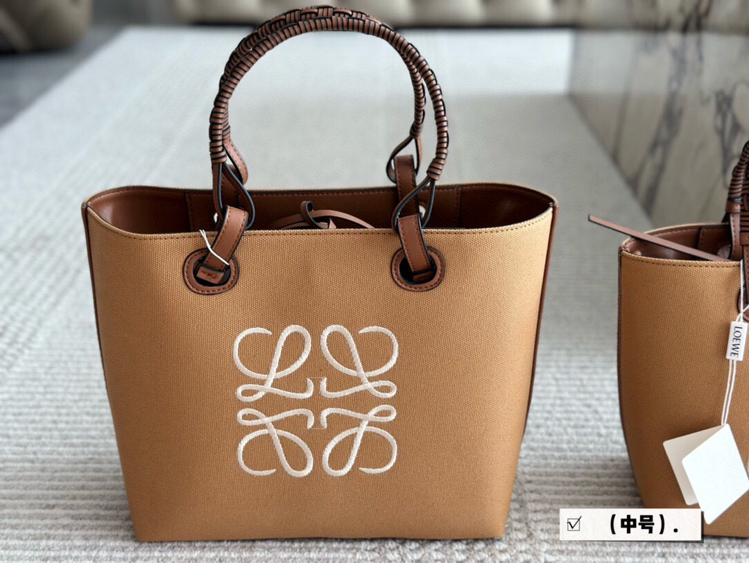 Loewe canvas tote bag, 23*22cm (S), 27*24cm (M). Durable brown leather and beige canvas. Spacious and practical for daily use.