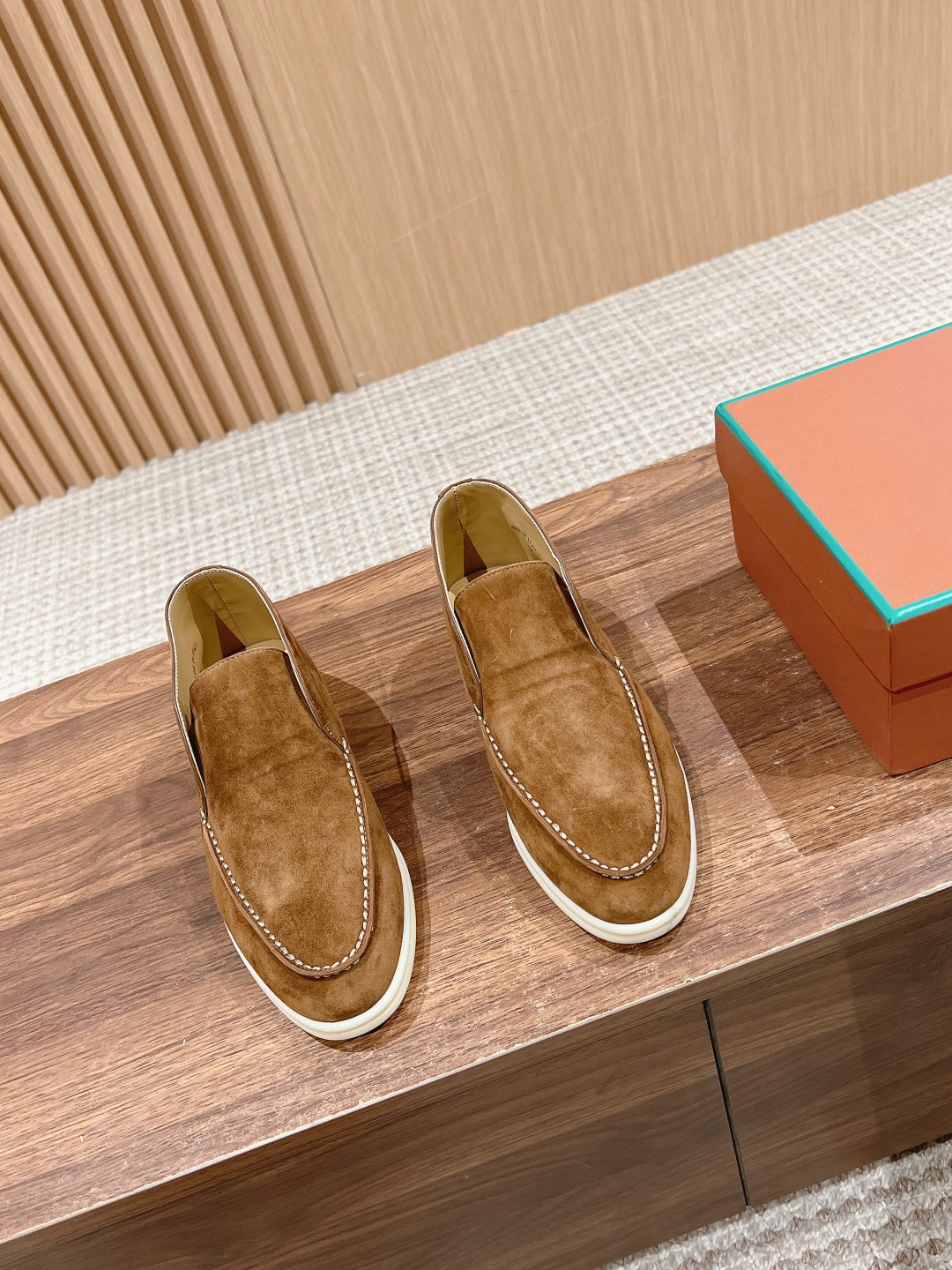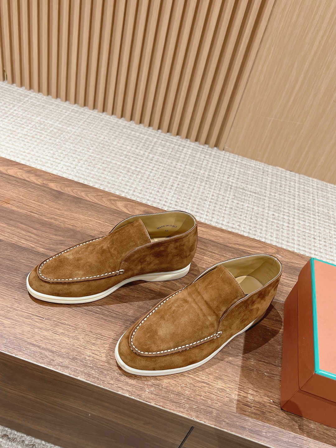 The fabric is imported lamb suede, with cowhide lining and light-colored rubber soles, a common feature of all Loro Piana casual footwear.