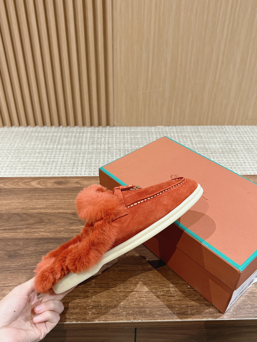 The fabric is imported lamb suede, lined with beaver fur, and the insole is made of cowhide. Light-colored rubber soles are a common feature of all Loro Piana casual footwear.
