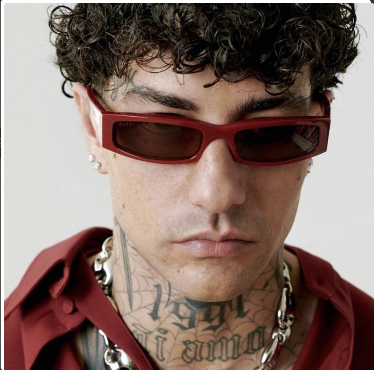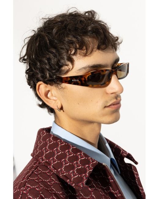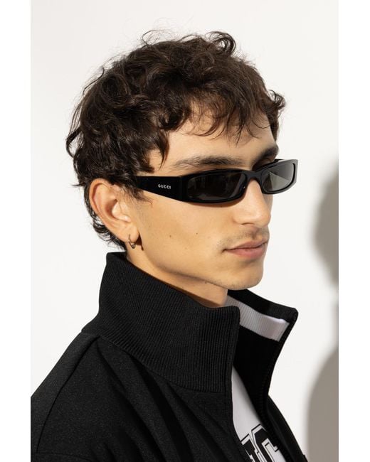 This rectangular frame sunglasses debuted on the autumn-winter men's fashion show, inspired by the 1990s wraparound style. The acetate frame and temples are adorned with the brand logo, and the stylish profile perfectly complements any look.