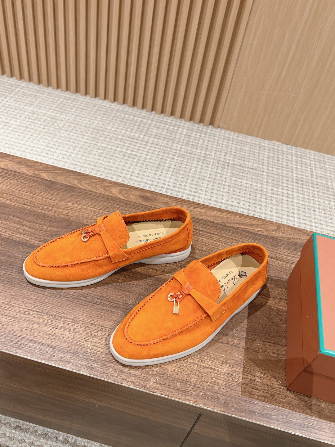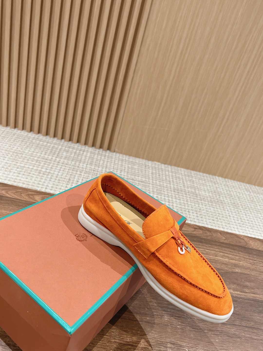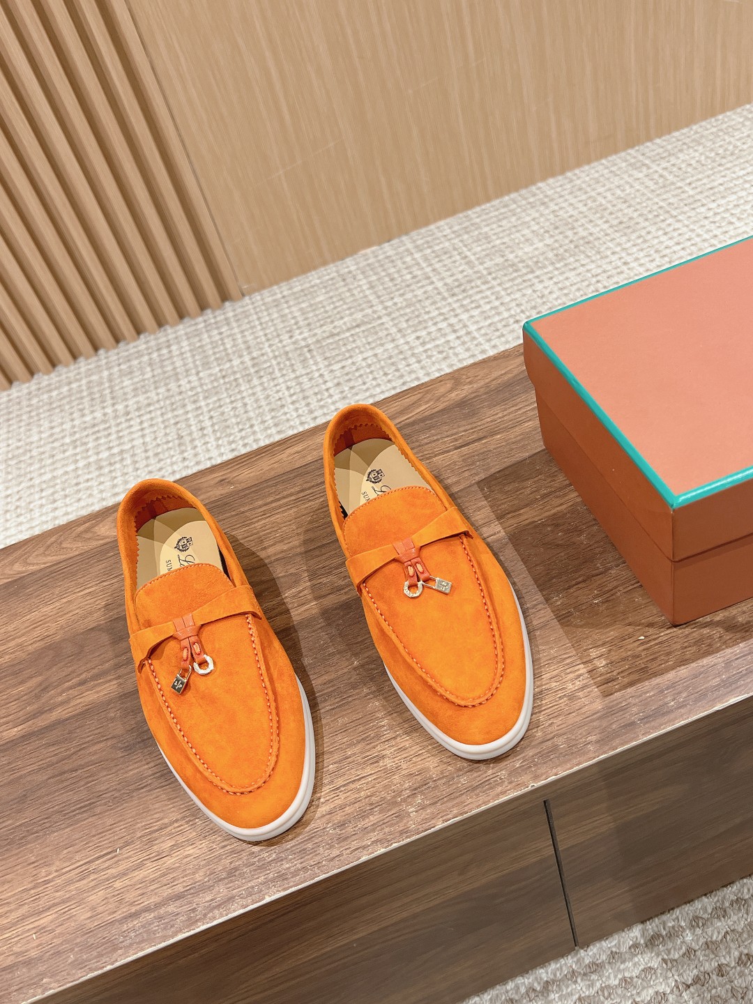The fabric is imported lamb suede, with cowhide lining and light-colored rubber sole, which are common features of all Loro Piana casual shoes.