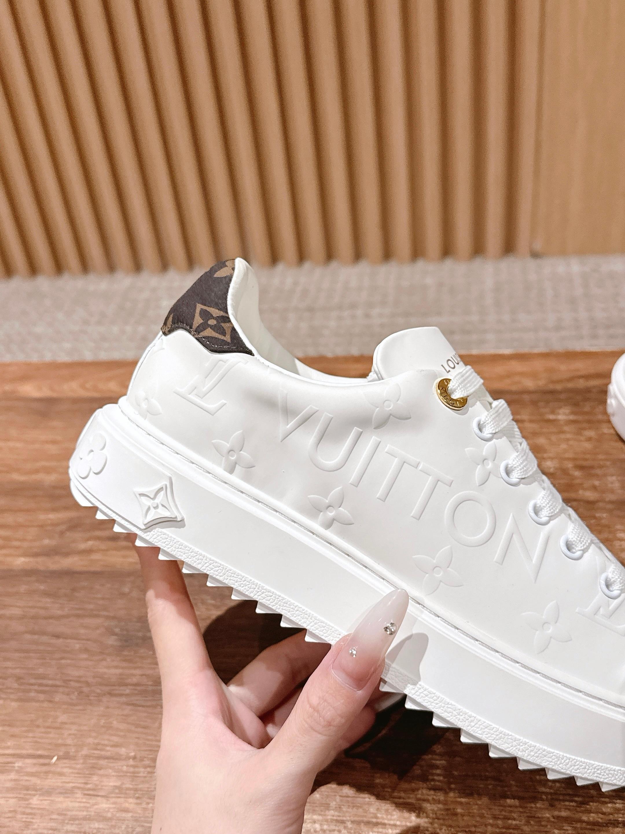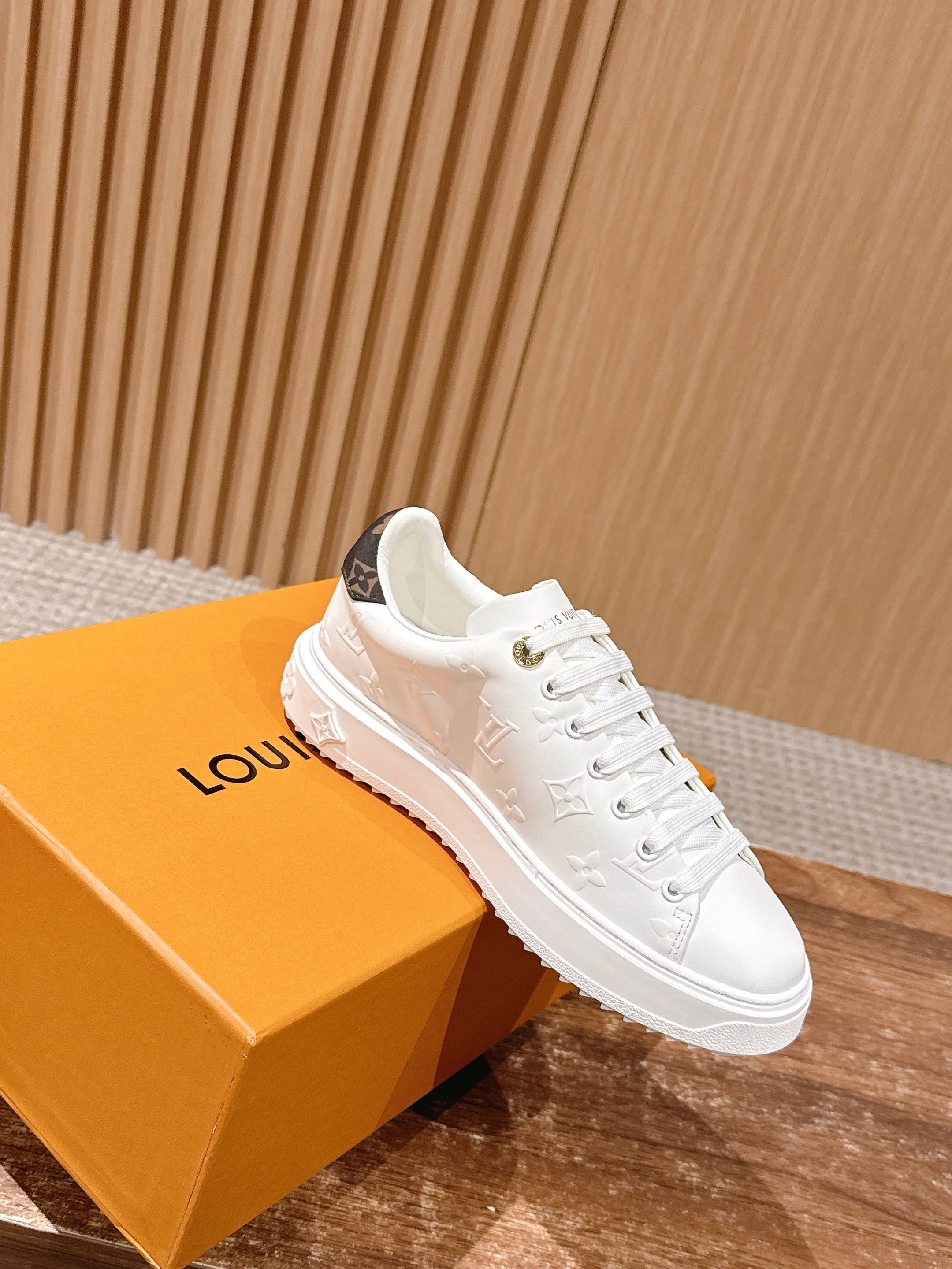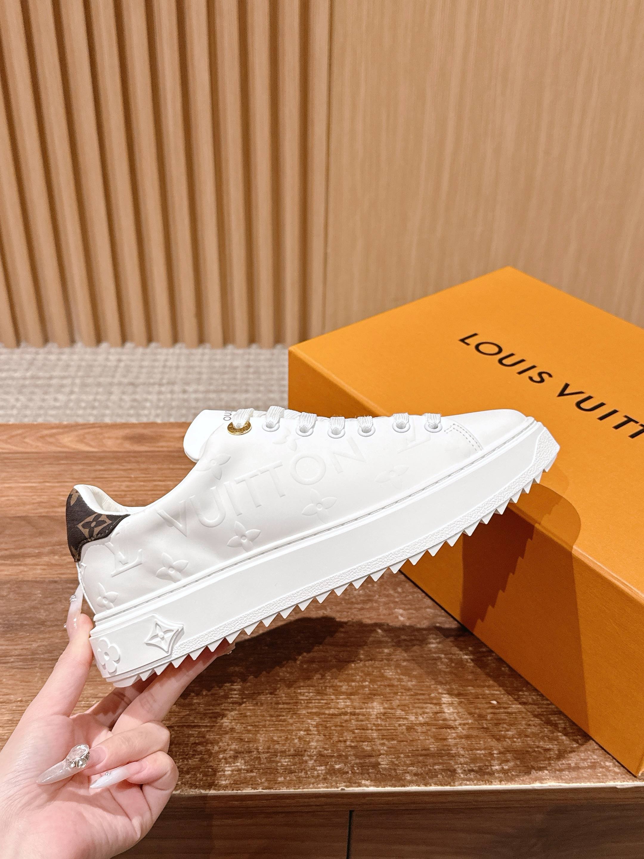 [Top Version] Louis Vuitton # New LV Pattern Printed Classic Platform Sneakers, New Design. This Time Out sneaker features soft calf leather embossed with a mini Monogram pattern, refreshing LV's classic design. Accented with 3D logos, a thick grooved outsole, and engraved eyelets for added精致细节. Size: 35-39 (40/41 custom-made)