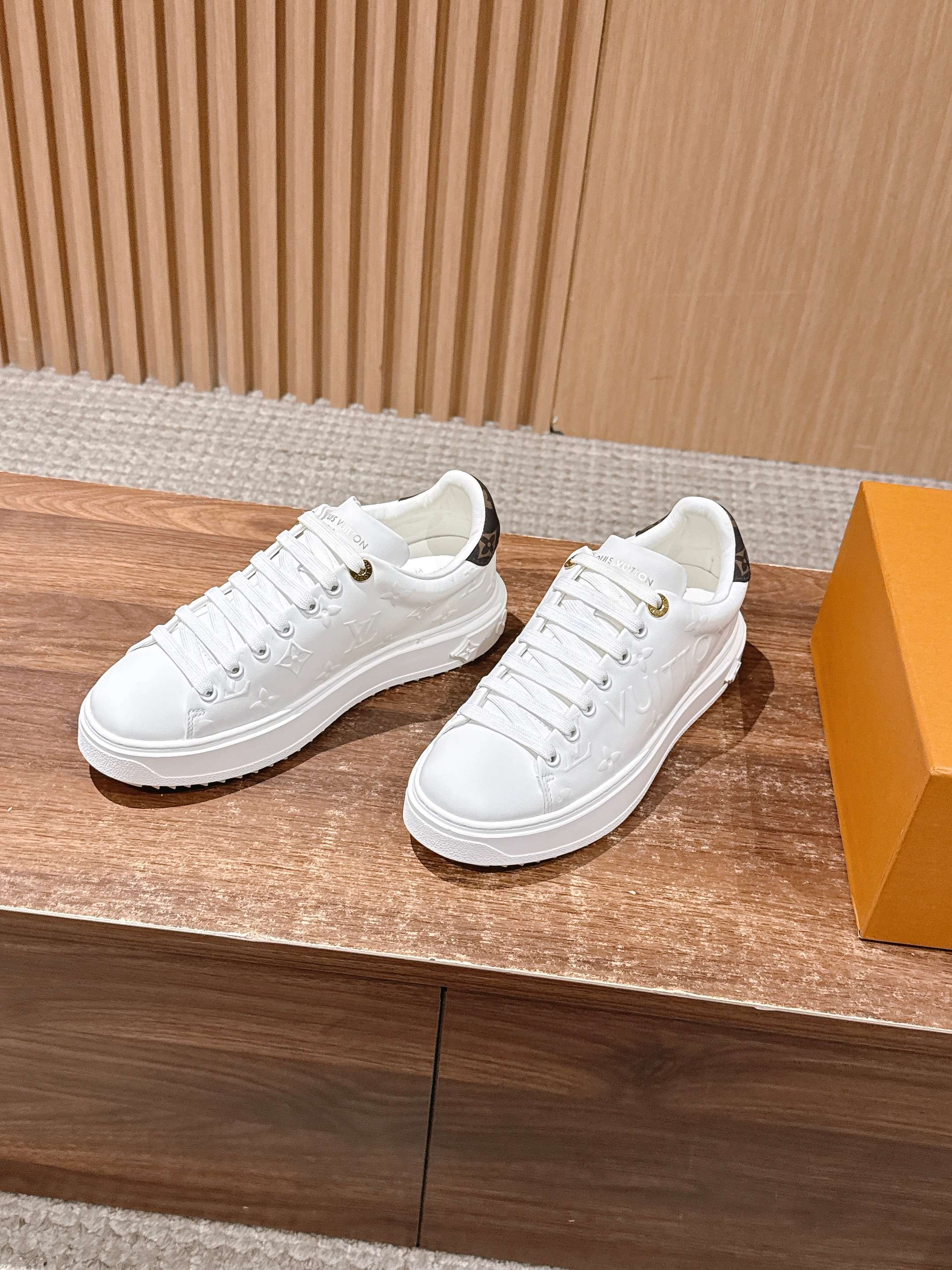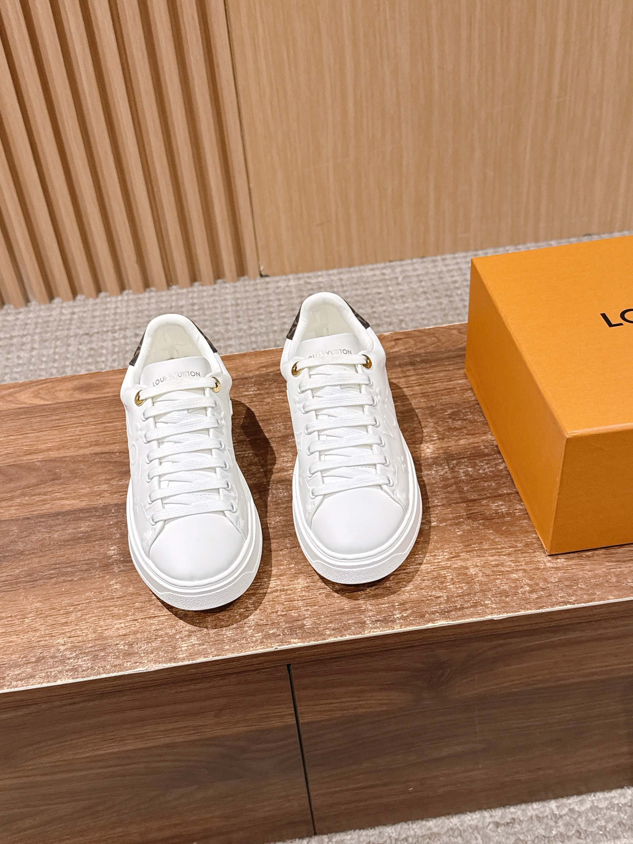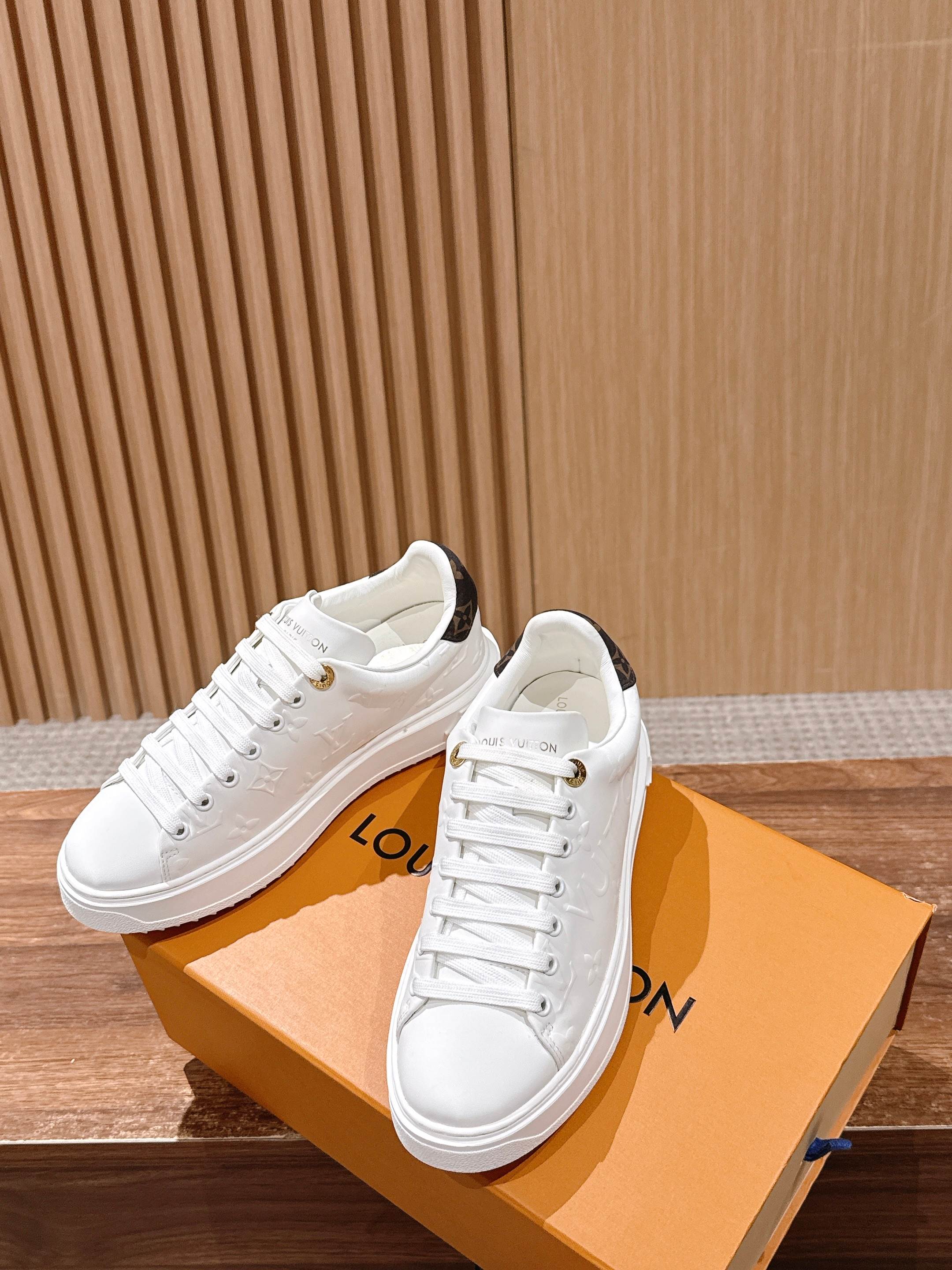 [Top Version] Louis Vuitton # New LV Pattern Printed Classic Platform Sneakers, New Design. This Time Out sneaker features soft calf leather embossed with a mini Monogram pattern, refreshing LV's classic design. Accented with 3D logos, a thick grooved outsole, and engraved eyelets for added精致细节. Size: 35-39 (40/41 custom-made)