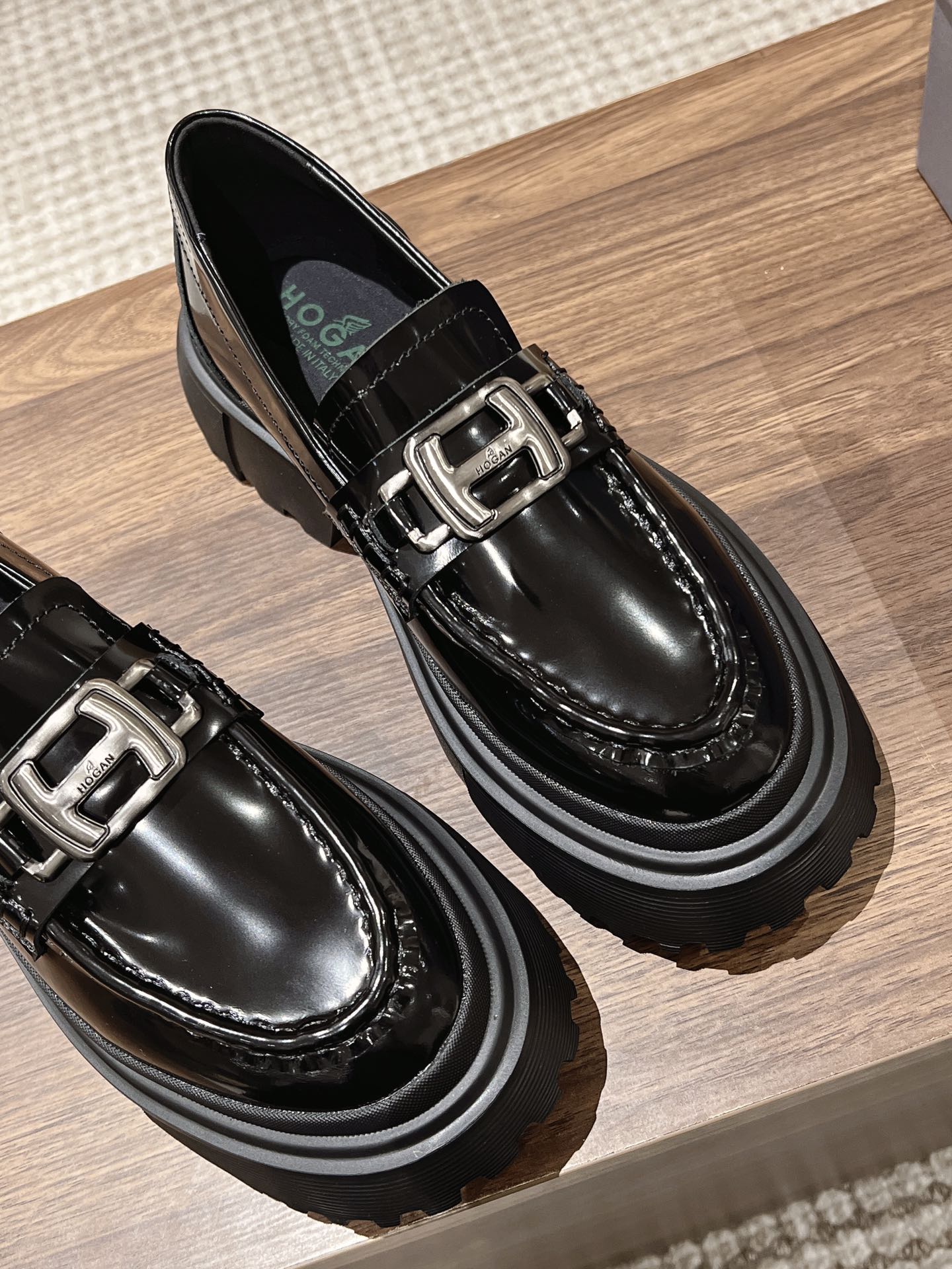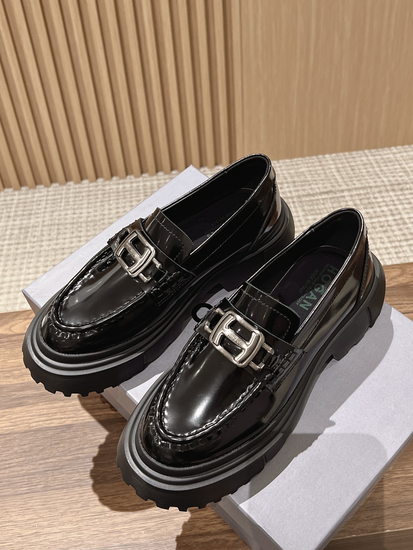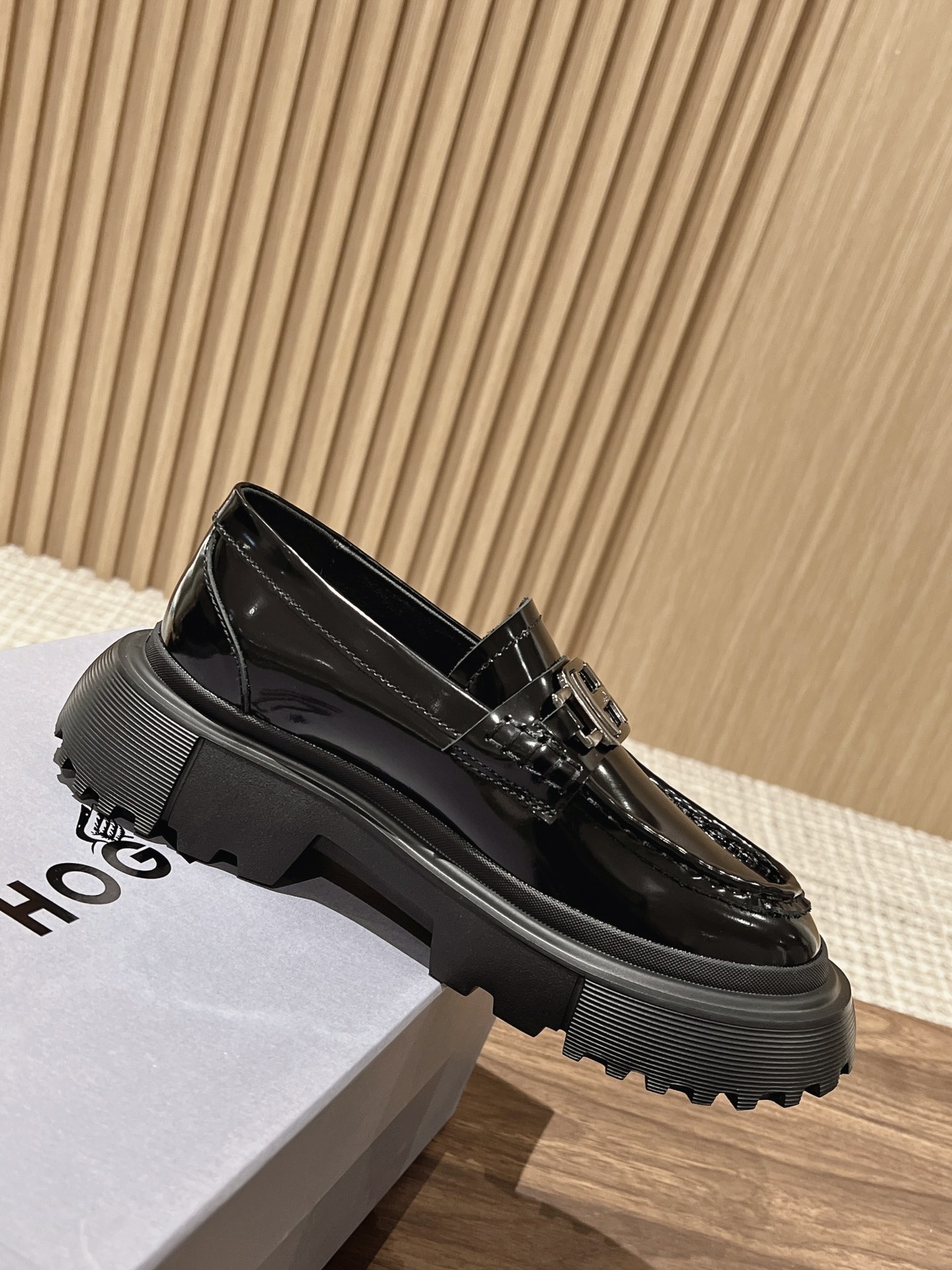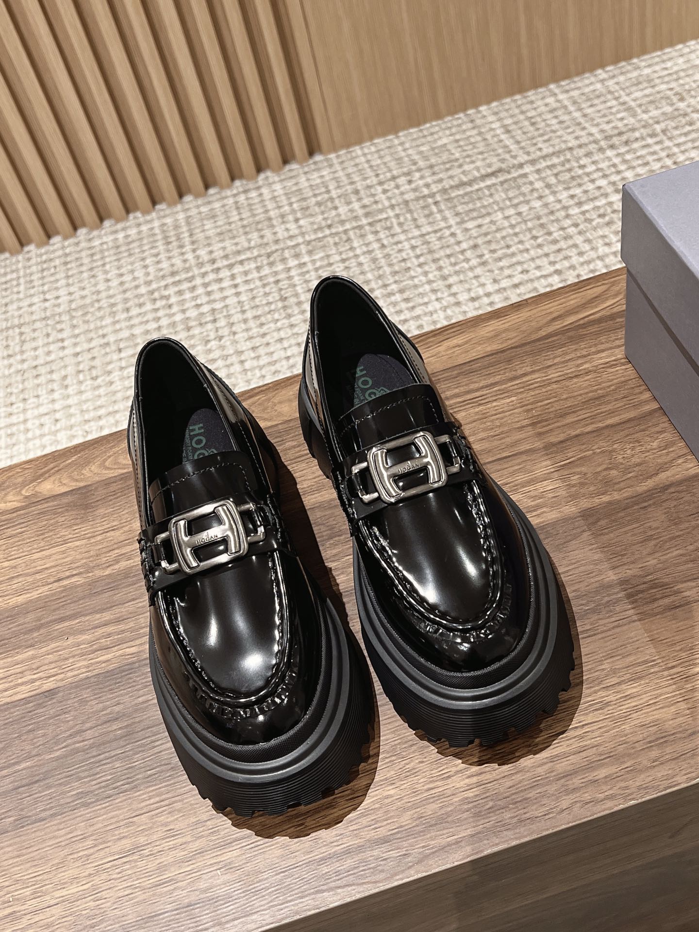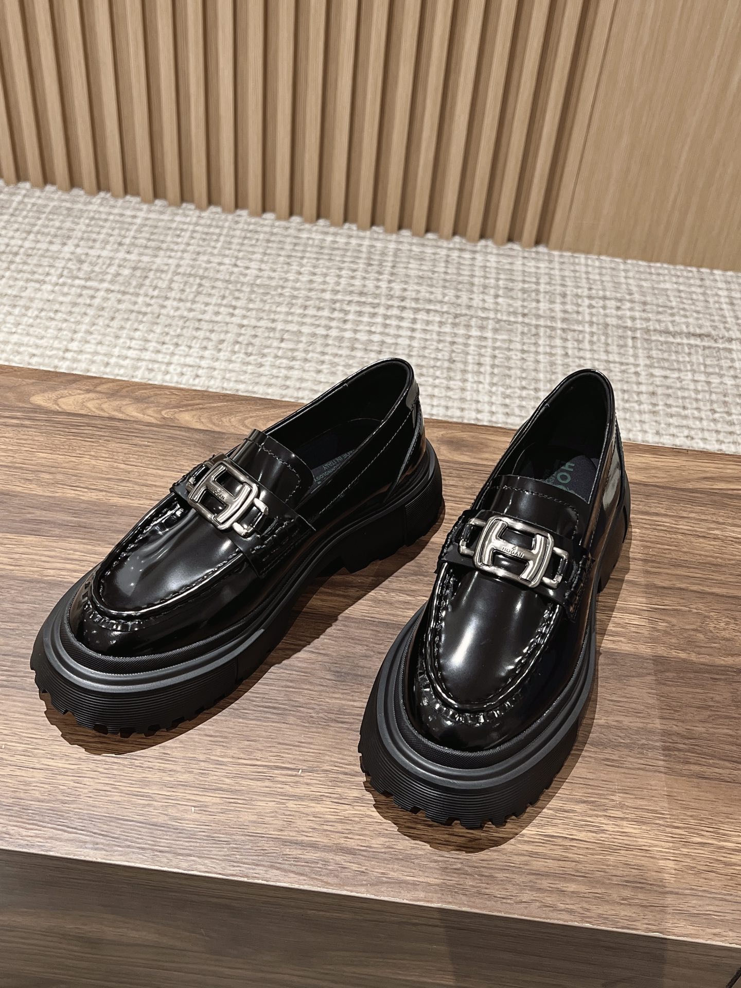 [Top Version] Hogan Hogan 22 Autumn/Winter New H619 Series Lace-up Loafers Thick Sole Original Purchase Development Production This women's winter loafers are made of patent leather, featuring a non-slip thick sole design incorporating military elements, with an H-shaped stripe on the bottom for a rugged, individualistic look. The sole contrasts with the elegant design of the upper. Adorned with exquisite horizontal stripe decorations, the artificial fur lining provides warmth and comfort, while the memory foam insole gently wraps the feet, making it an excellent choice for creating a fashionable urban style. Comes with exquisite boutique packaging. Original custom imported open-edge pearl cowhide material Imported soft lambskin lining Original mold ultra-light rubber foam sole 5CM thick sole Size: Women's 35-40