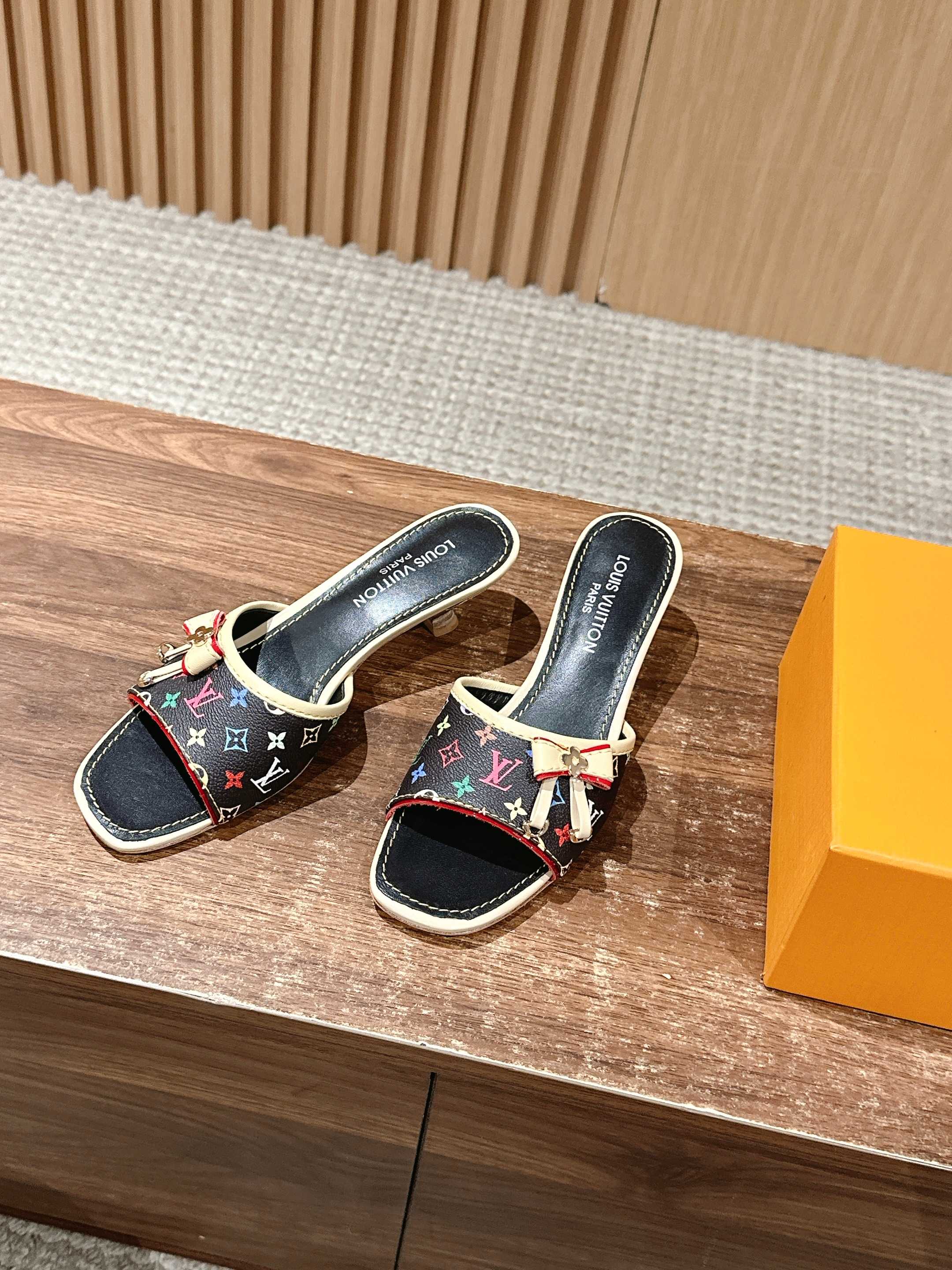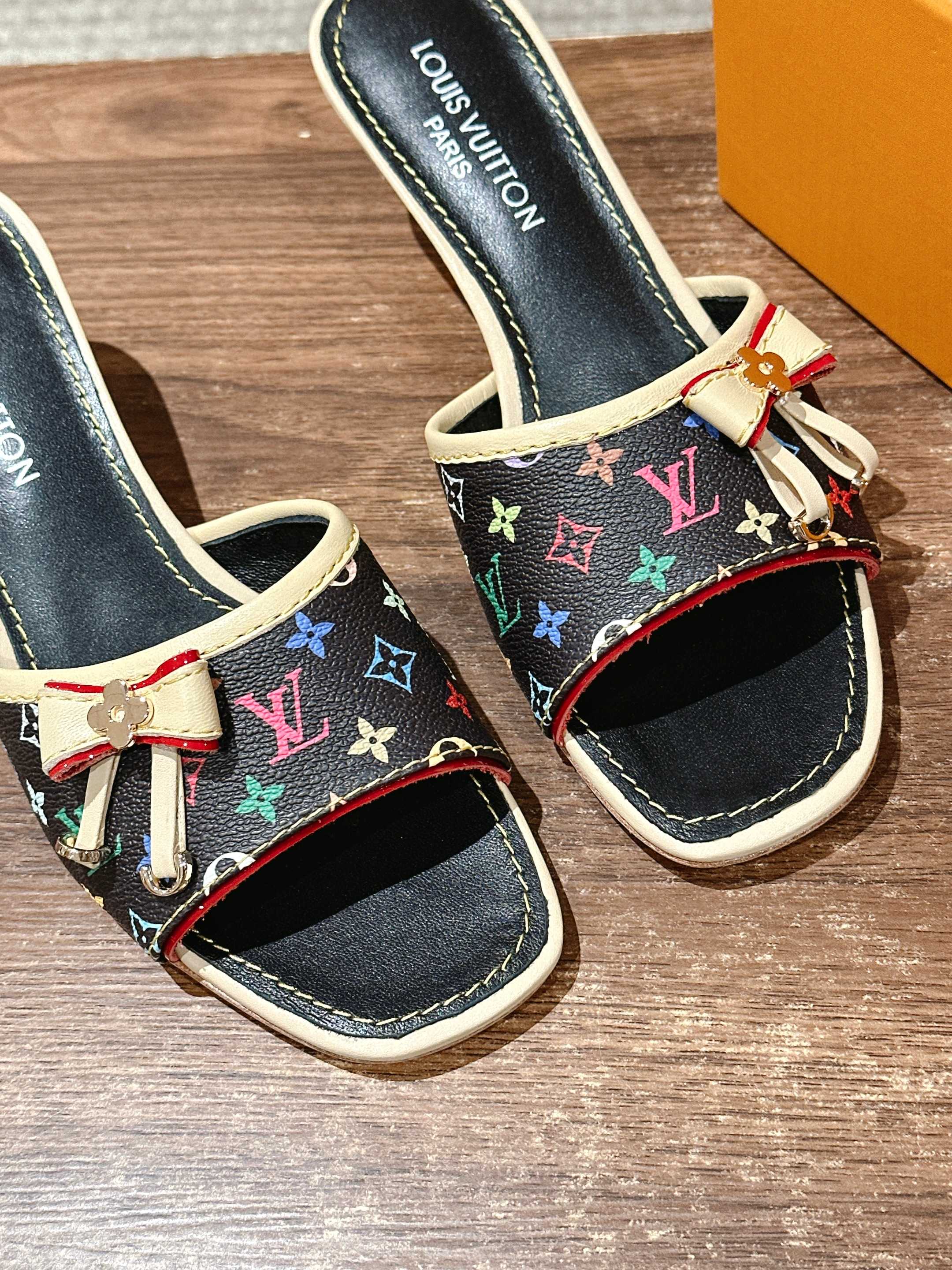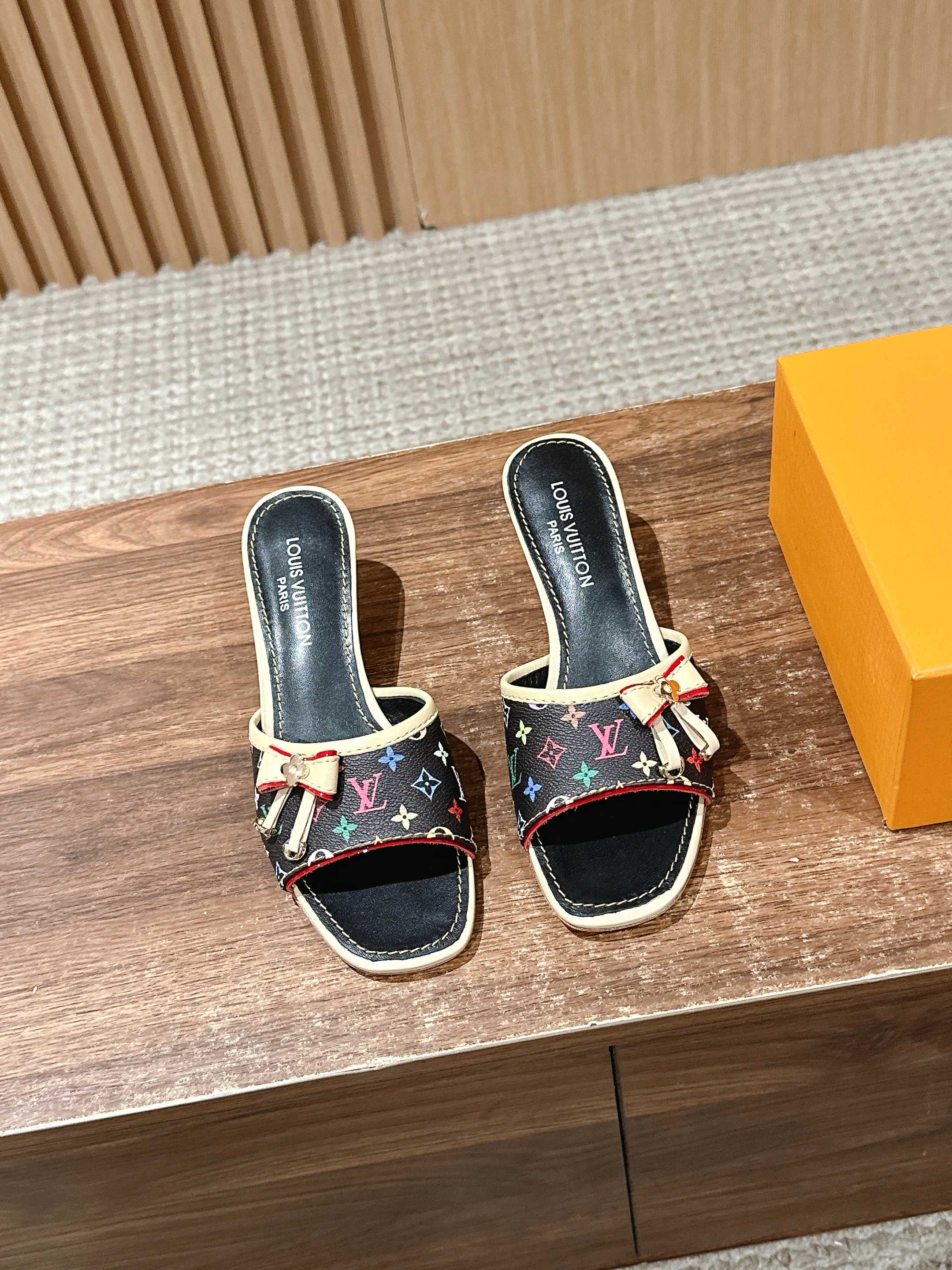 [Top Version] Louis Vuitton Revival 2025/SS New Denim Series Small Butterfly Kitten Heel Slippers Printed Slippers Lambskin Lining Genuine Leather Sole