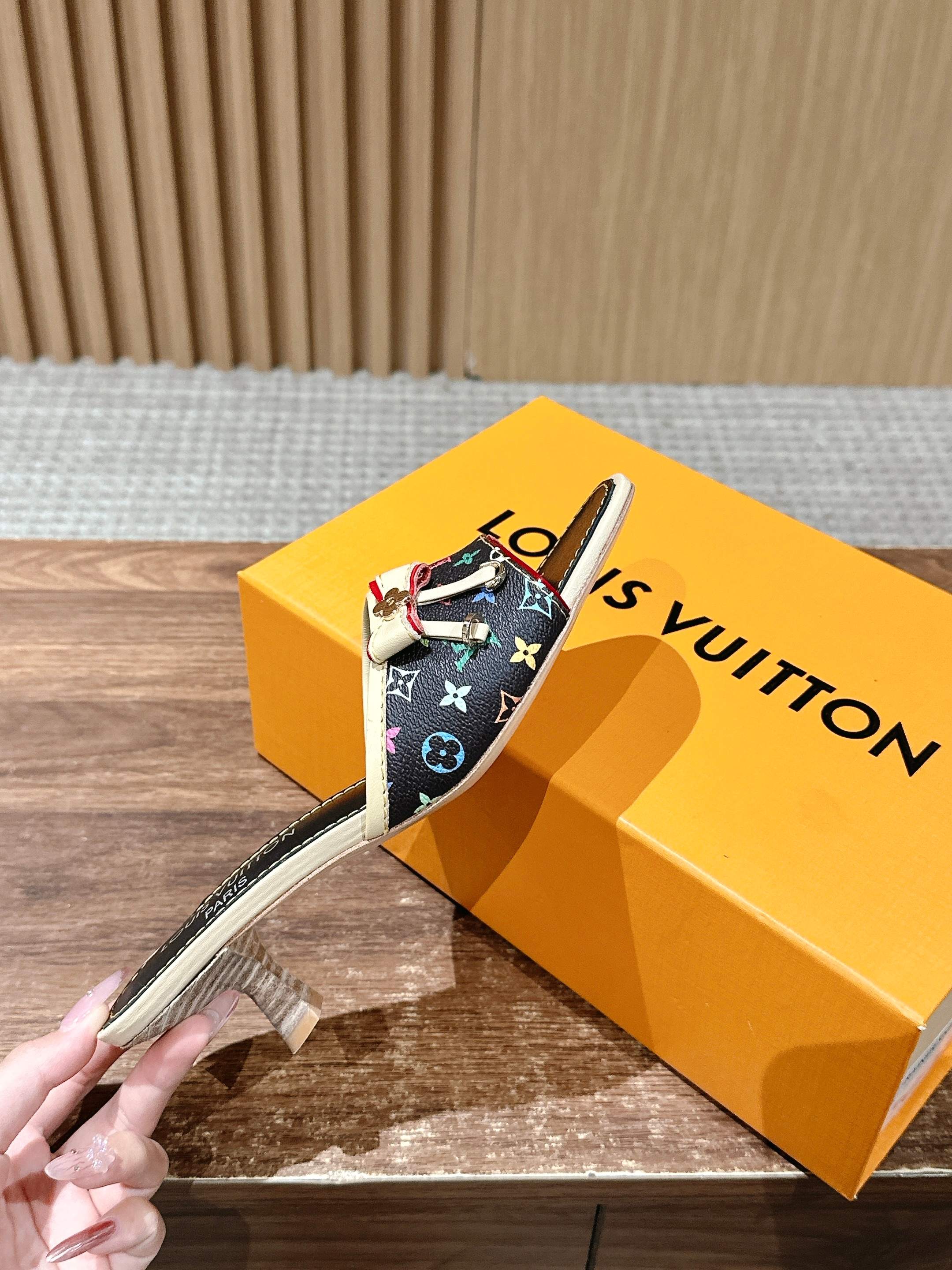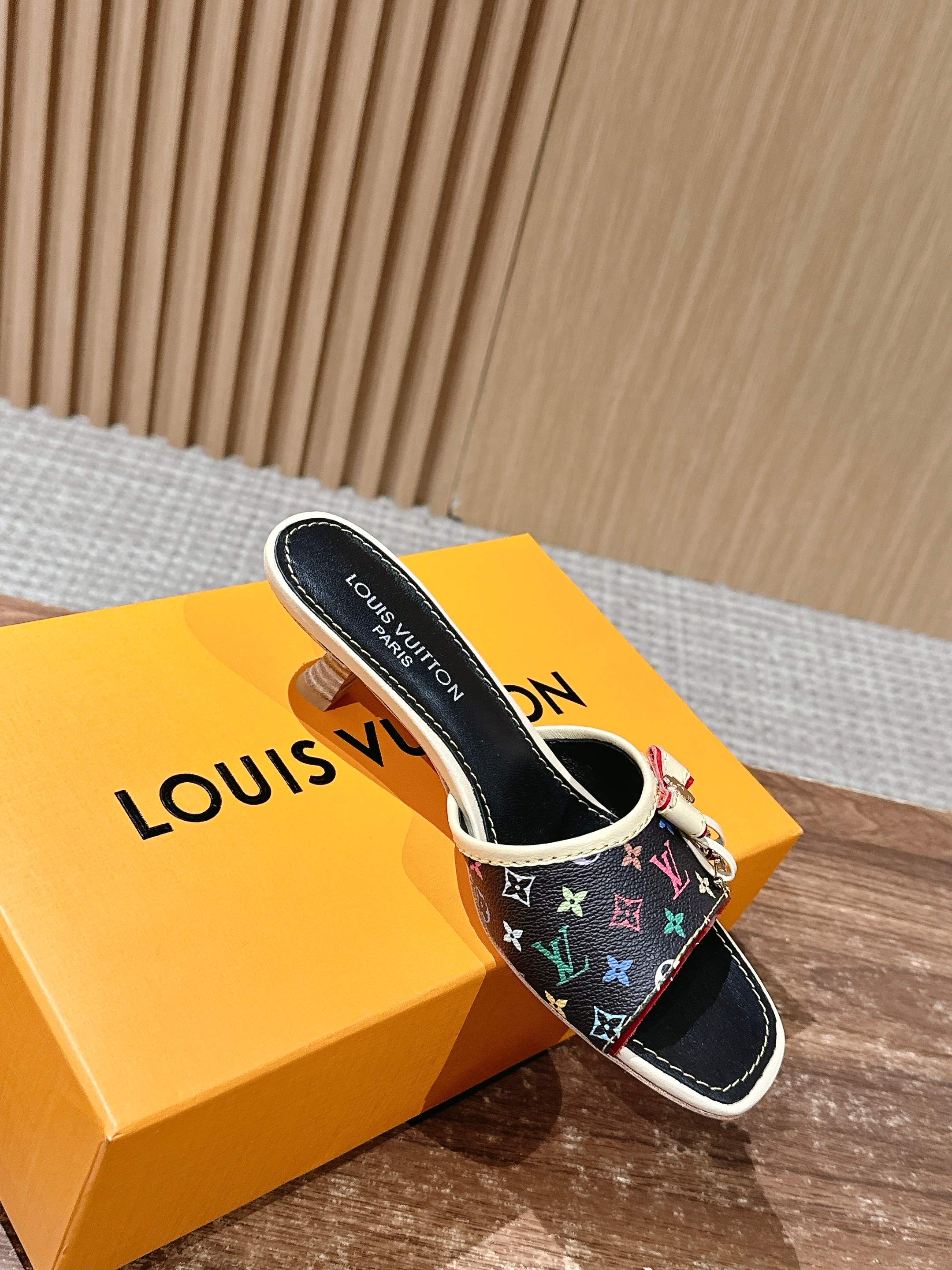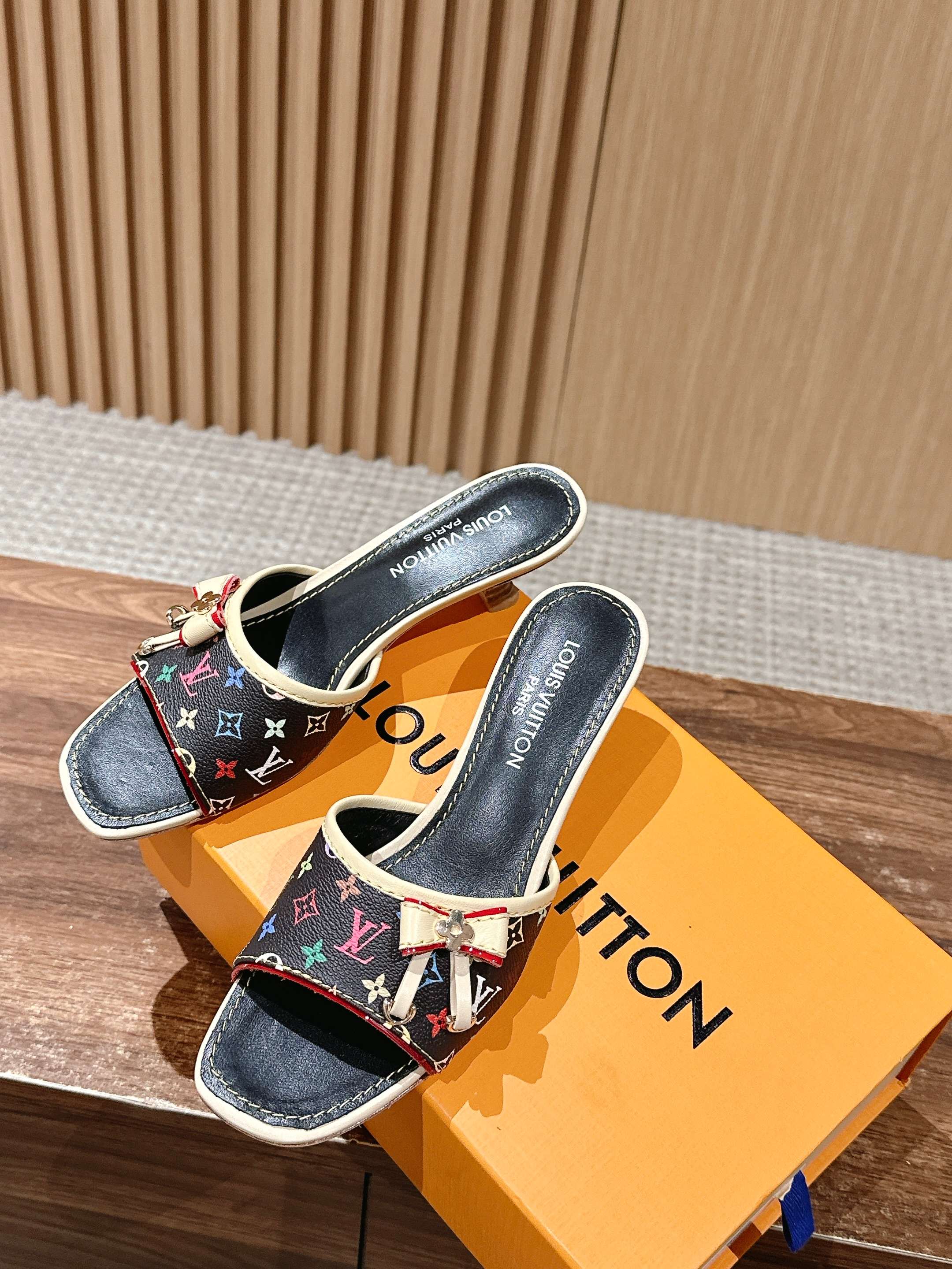 [Top Version] Louis Vuitton Revival 2025/SS New Denim Series Small Butterfly Kitten Heel Slippers Printed Slippers Lambskin Lining Genuine Leather Sole