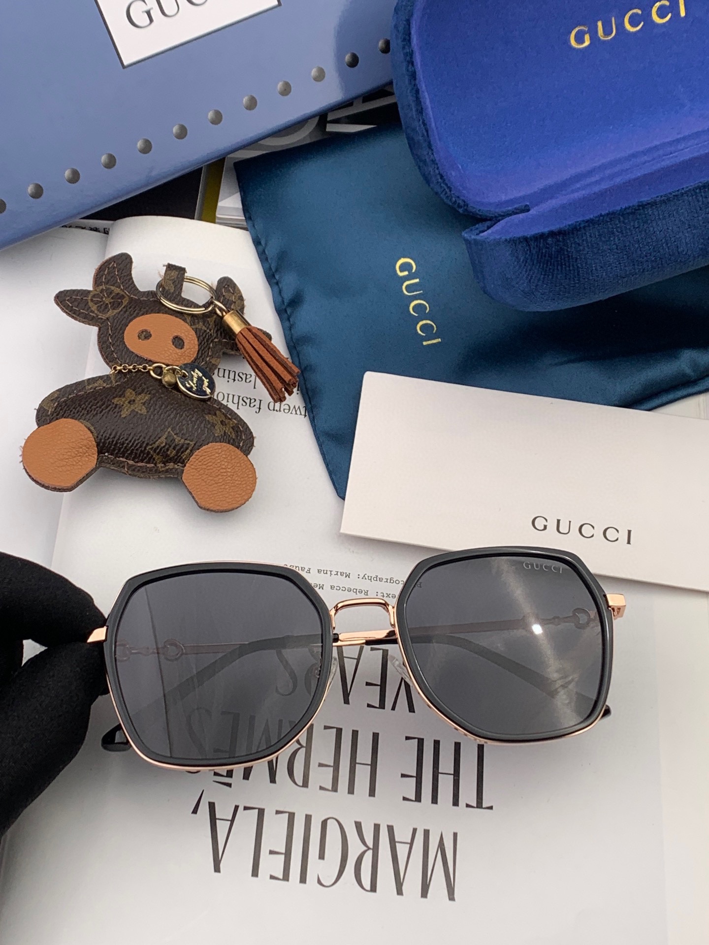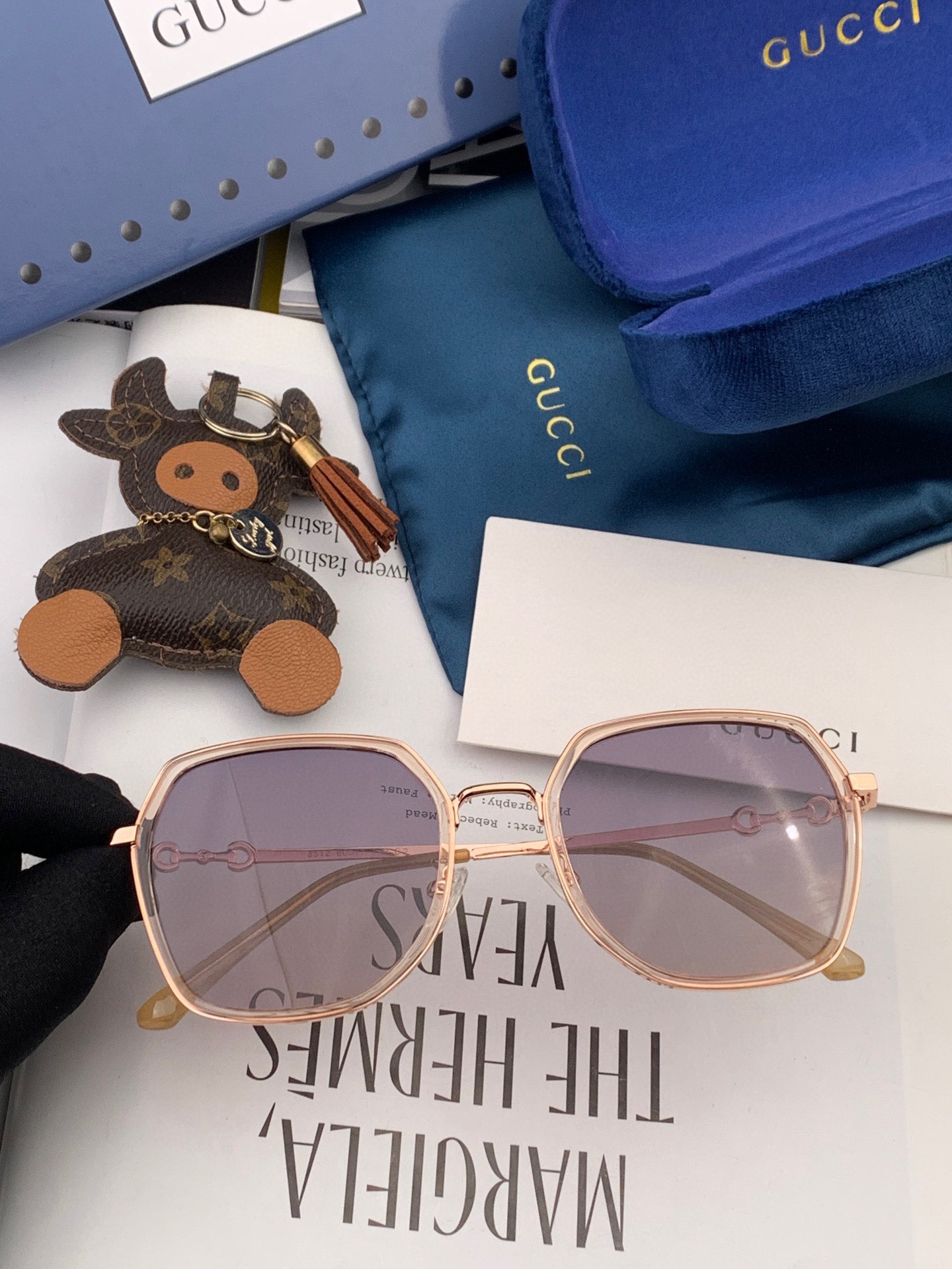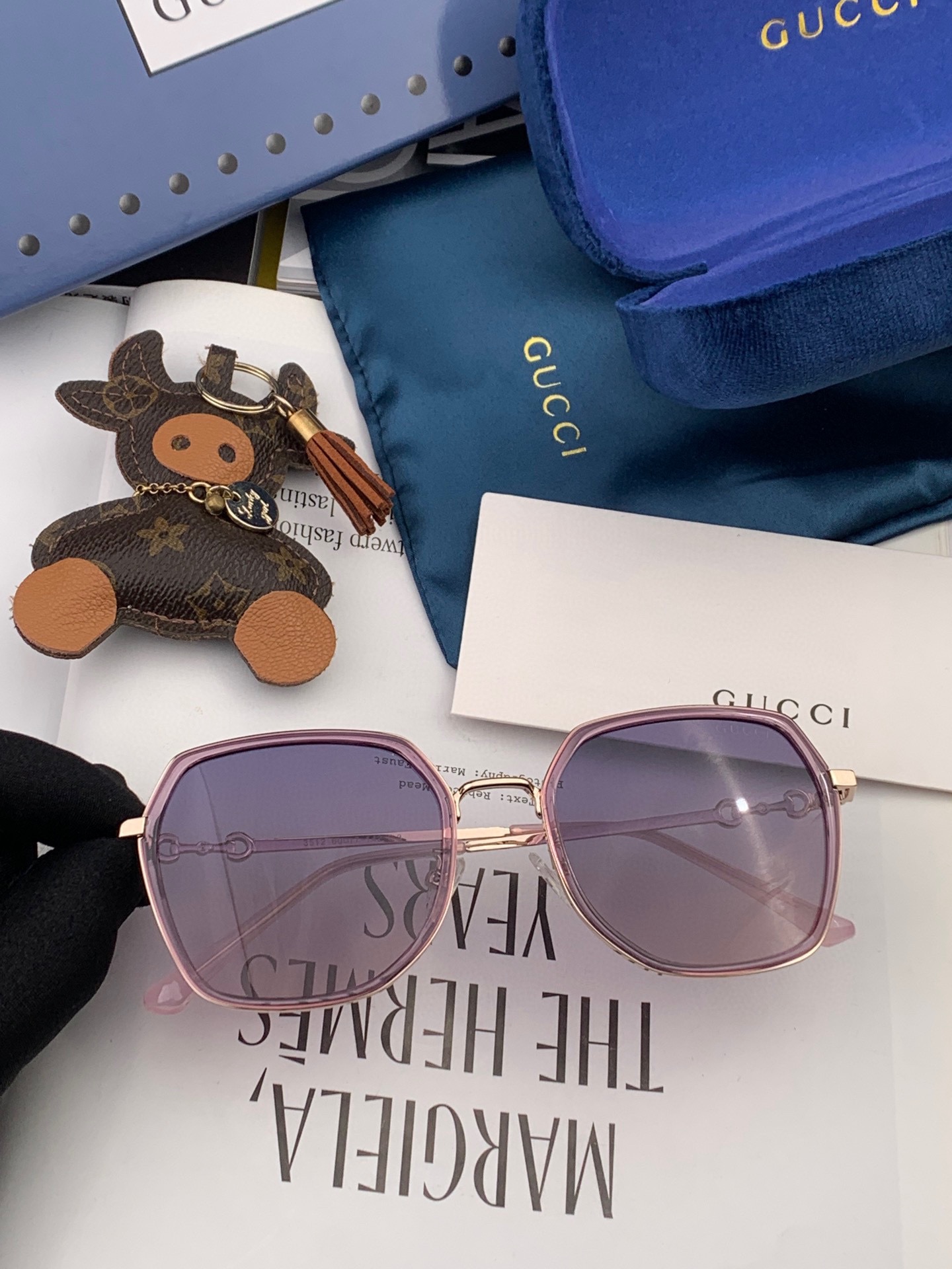 Original Title: Price 70 Gucci Sunglasses 2024 New Style 🔥 The square frame design is elegant and visually enhances facial contours, making the face appear smaller and suiting all face shapes. The retro horsebit detail paired with unique purple lenses exudes a vintage vibe, both sweet and edgy.