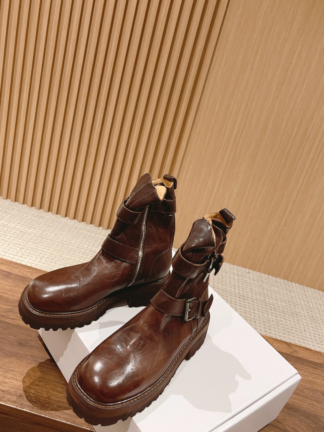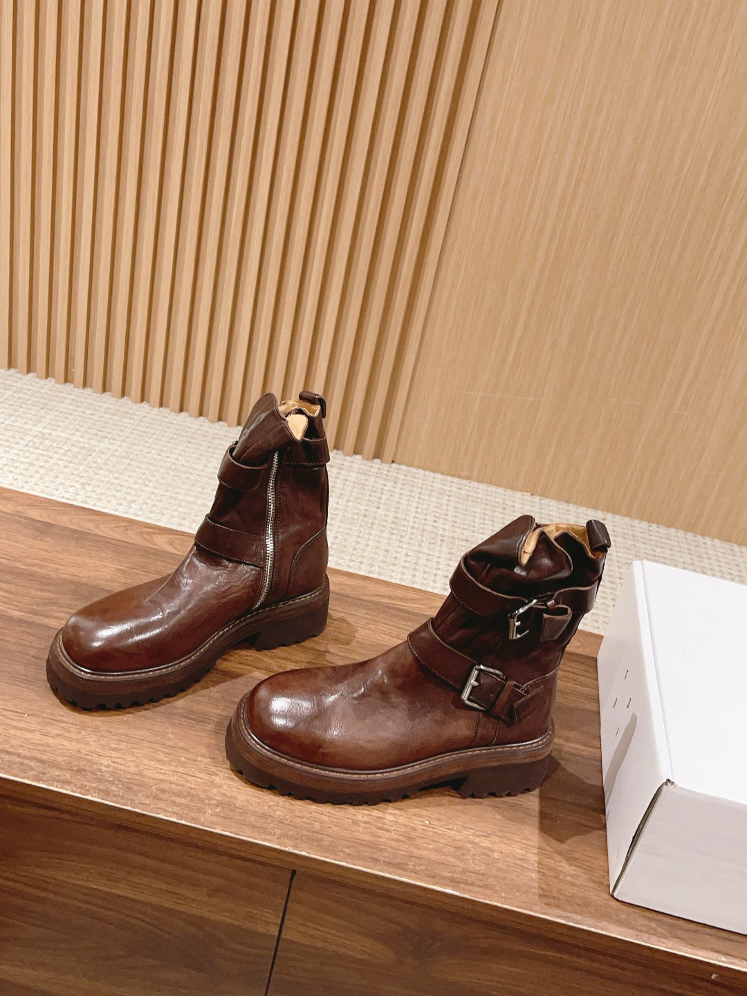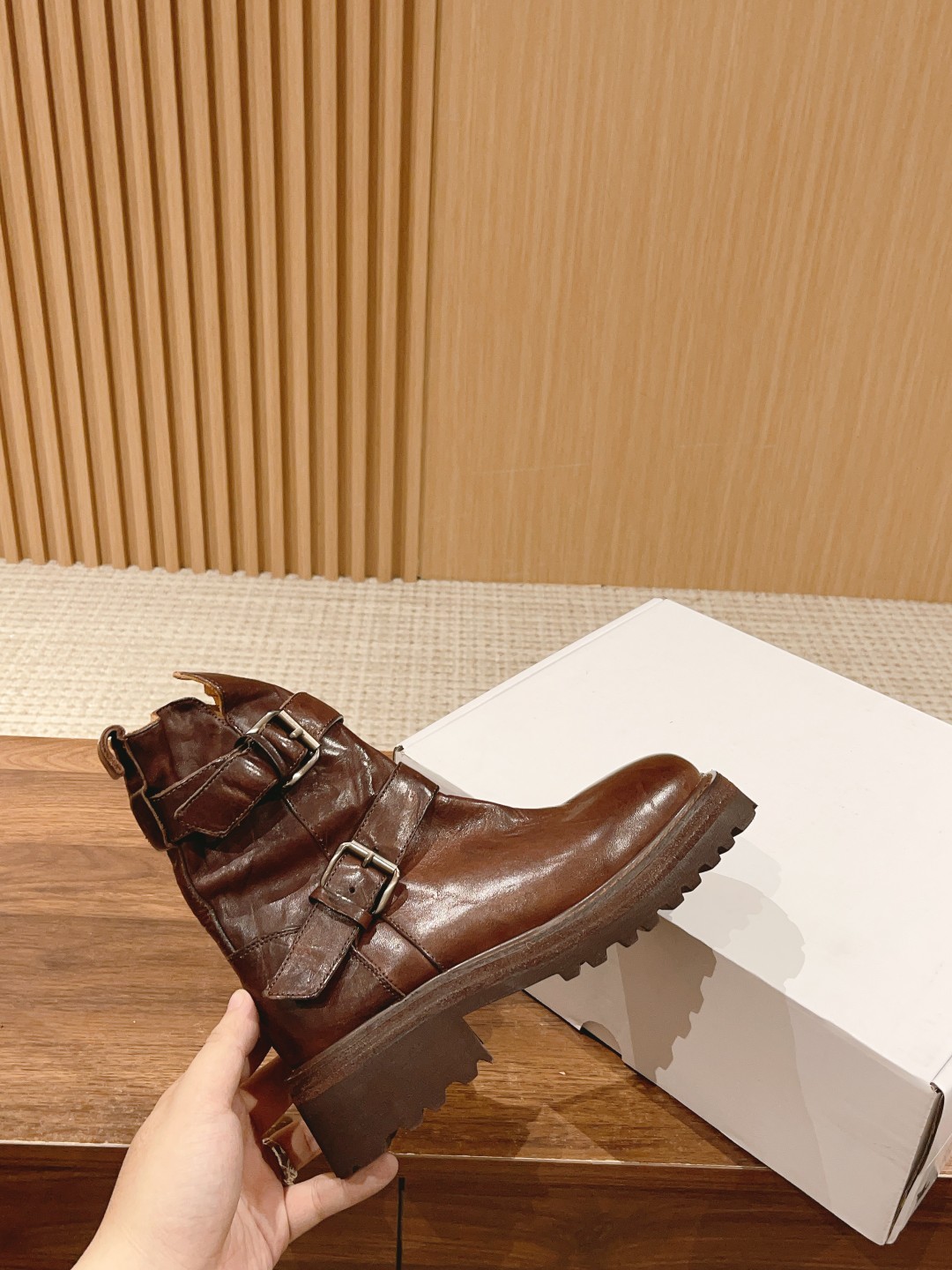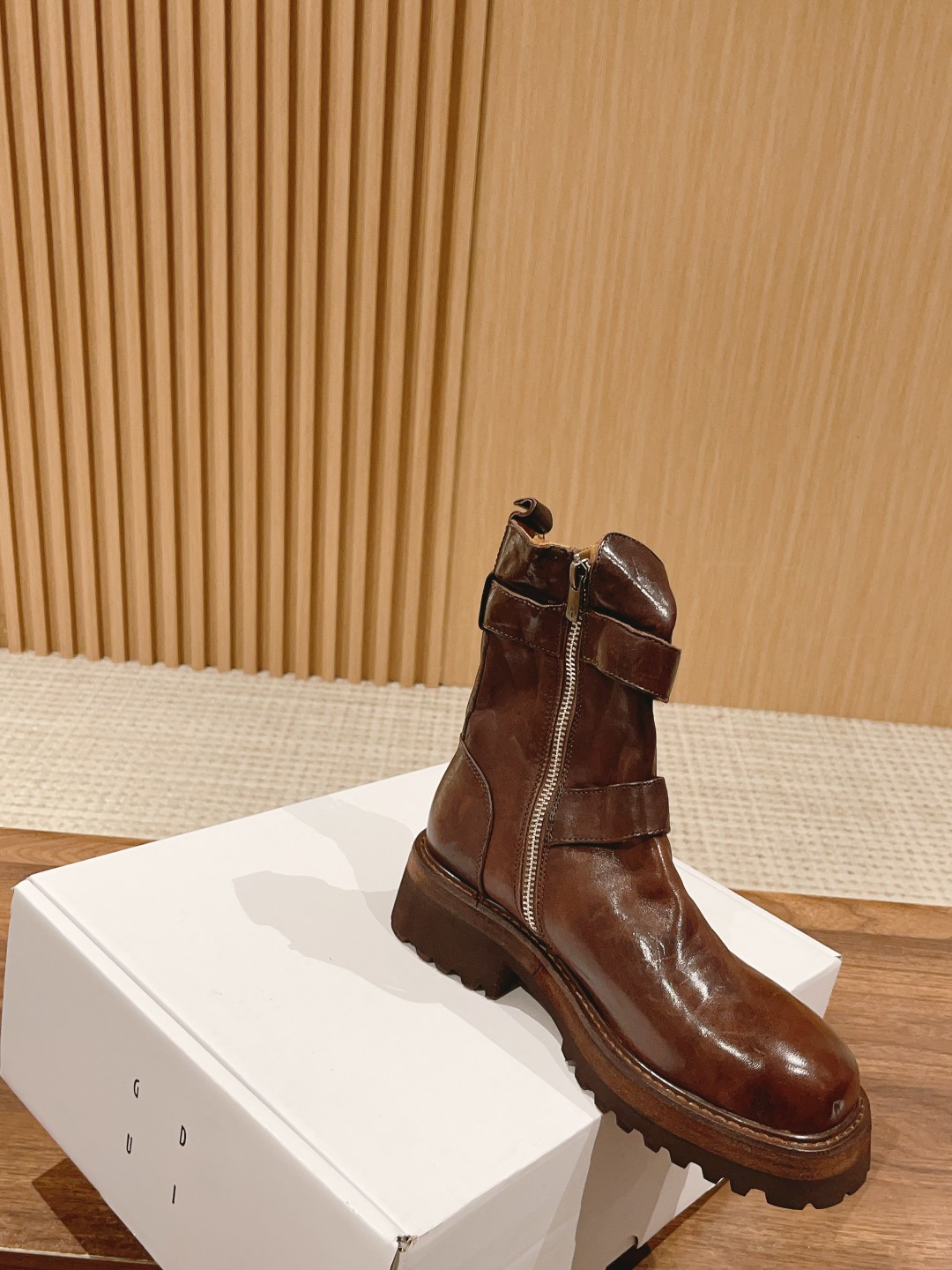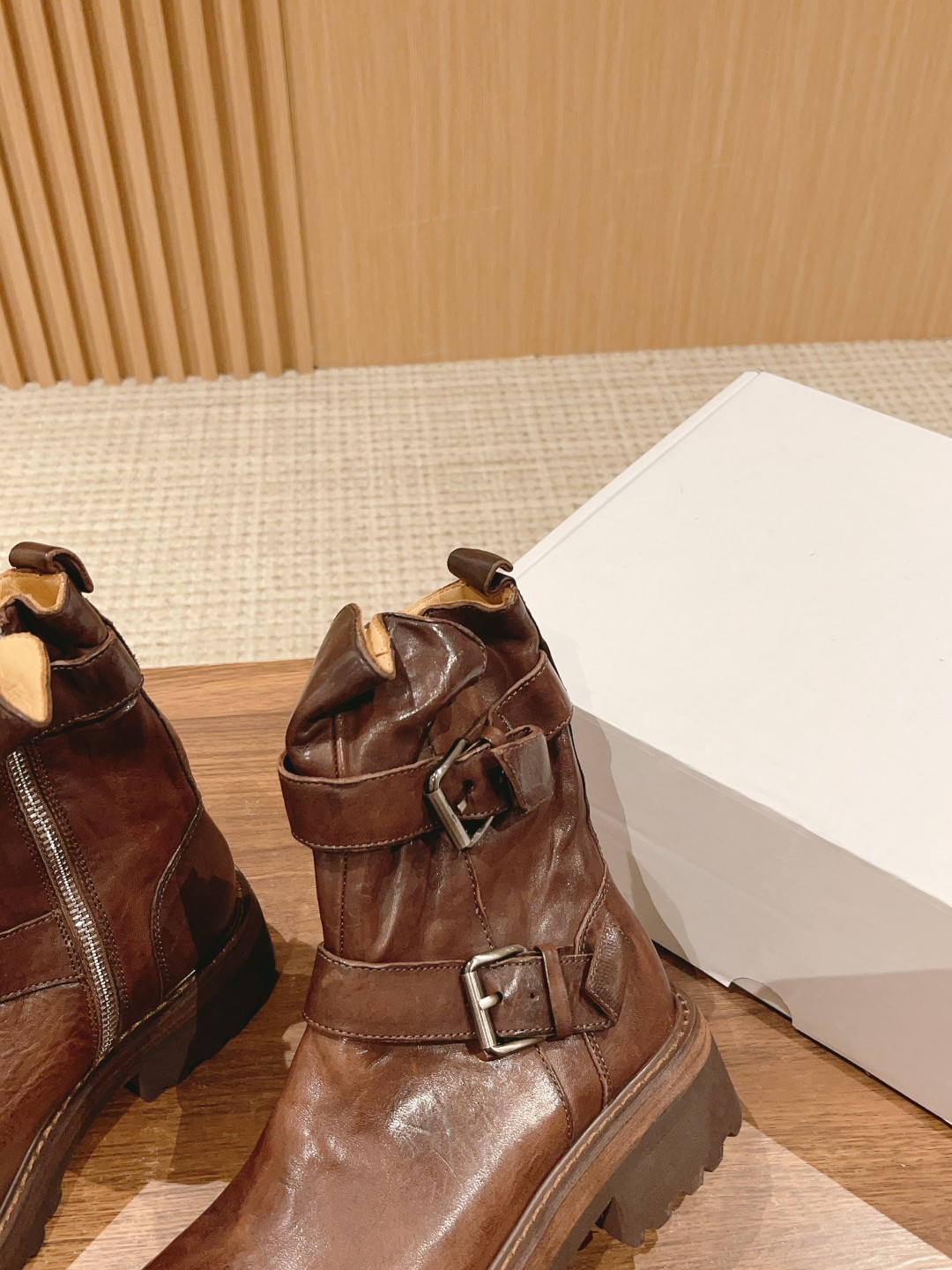 Handmade shoes emphasize a casual, free-spirited nature. Like people, each pair has its own character and unique features. There is no fixed template, and you won't find two identical pairs! Irregularity is a hallmark of handmade shoes, embracing a retro, casual vibe with a natural, worn-in feel. The color and creasing of the boots resemble traces developed from long-term wear, becoming more natural and gaining more character over time. Each pair is unique. The upper features a one-piece design. As you wear them, the upper develops beautiful, natural creases, and the leather conforms more closely to your feet, beautifully shaping the leg.