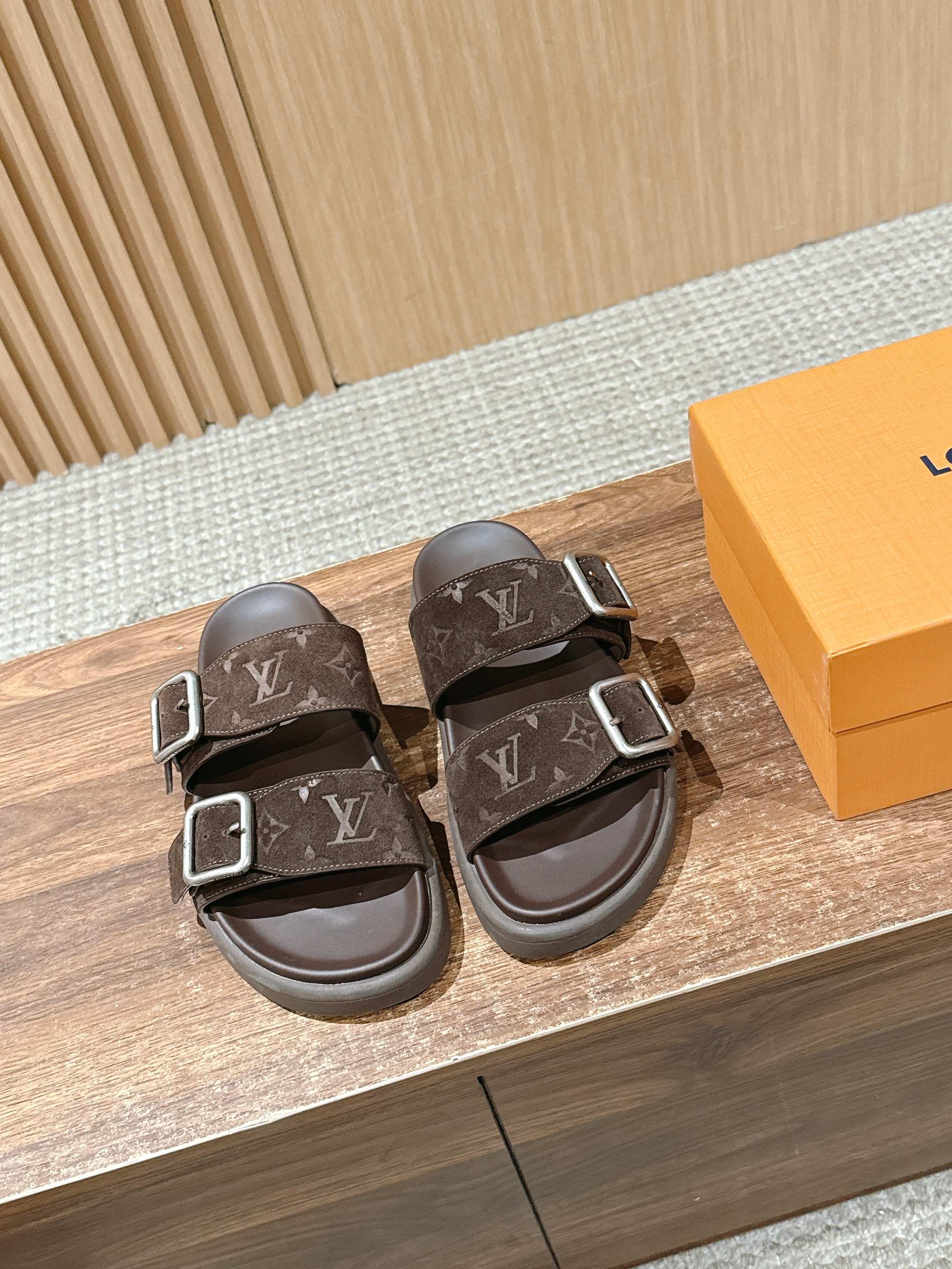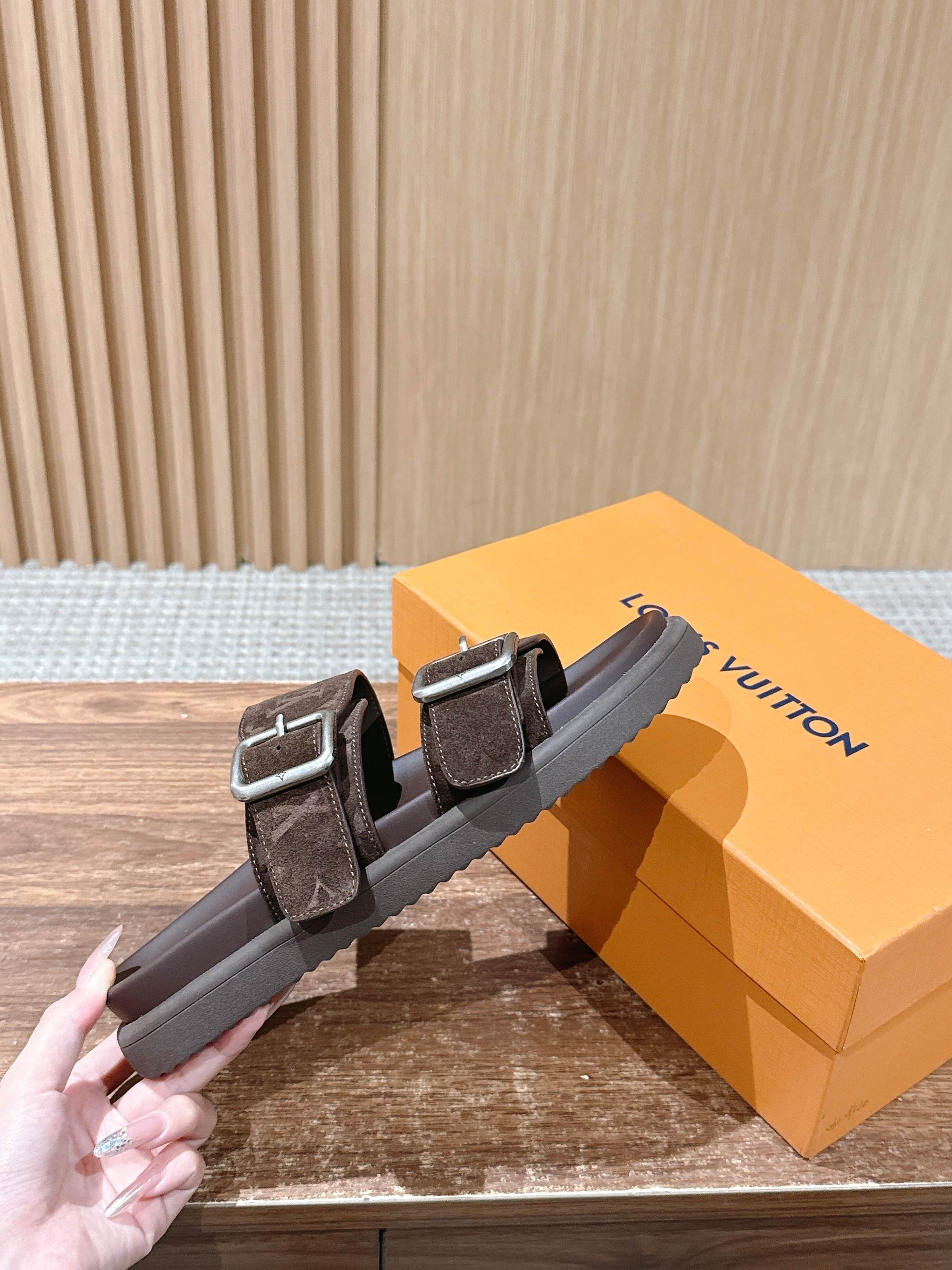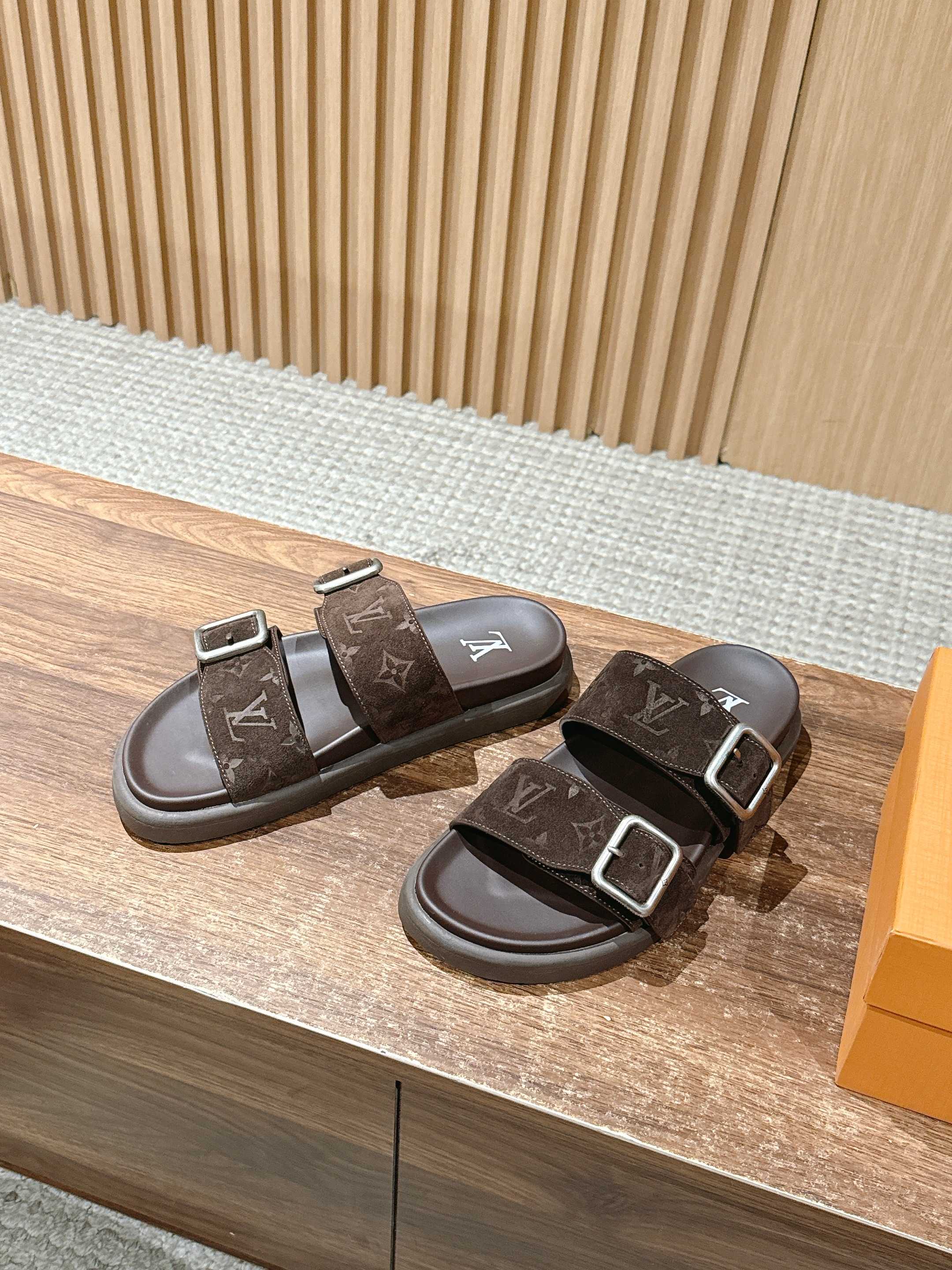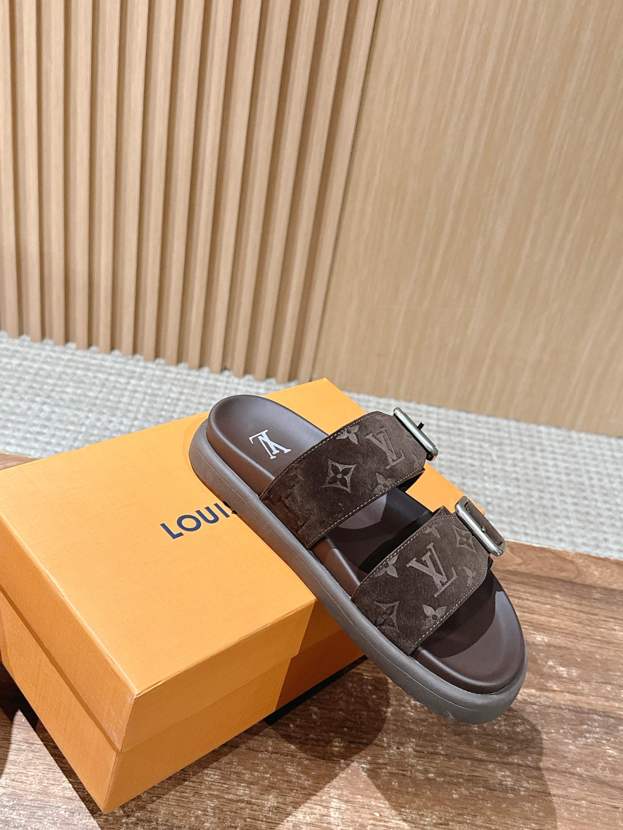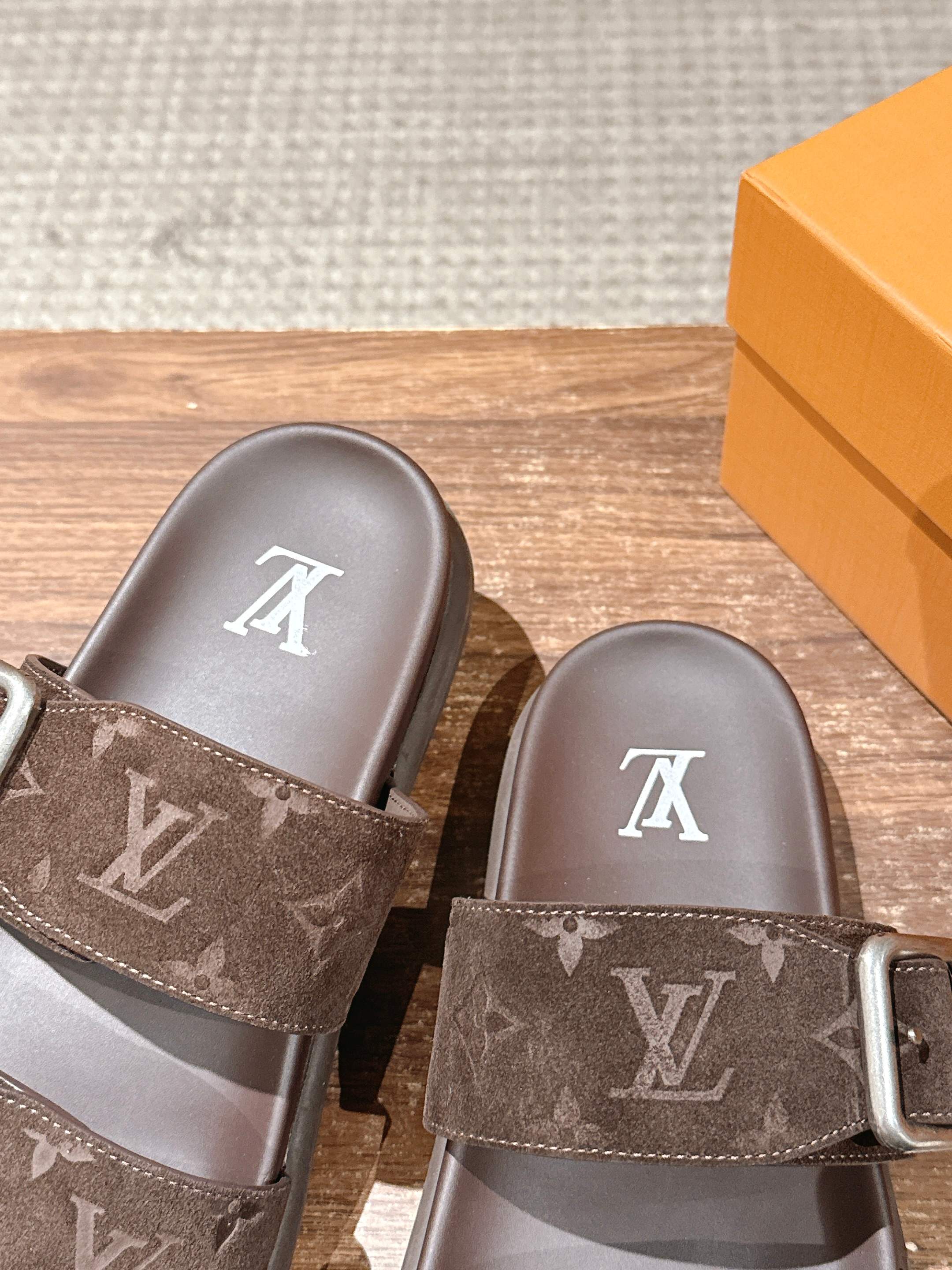 [Top Version] Louis Vuitton# New Men's Sandals from LV, Exudes a Premium Feel! A style heavily featured by bloggers both domestically and internationally, retro and fashionable. Looks amazing on feet! Suede/Calfskin Monogram material, lambskin lining.