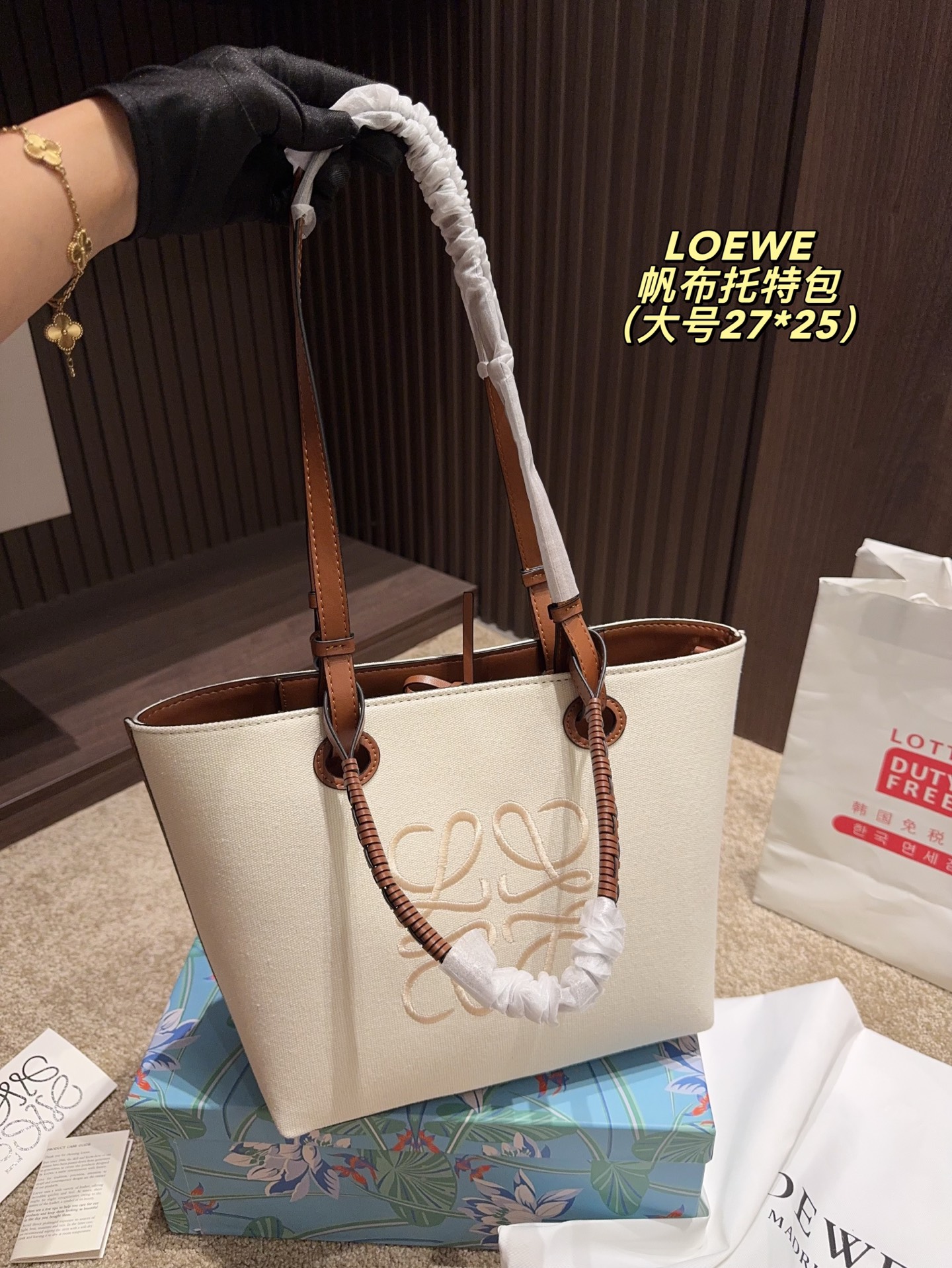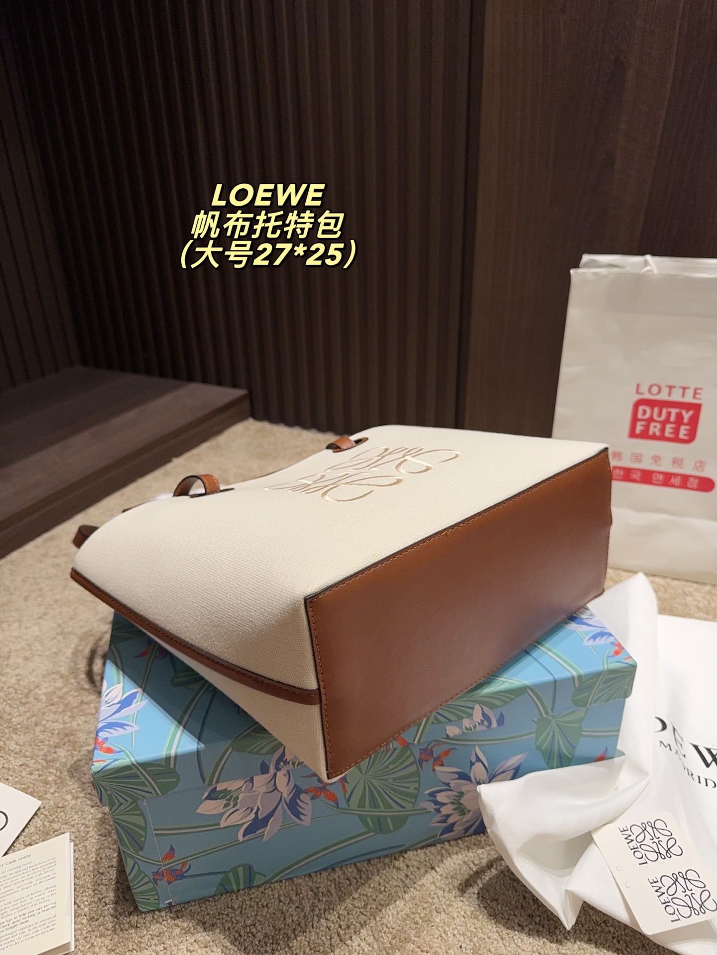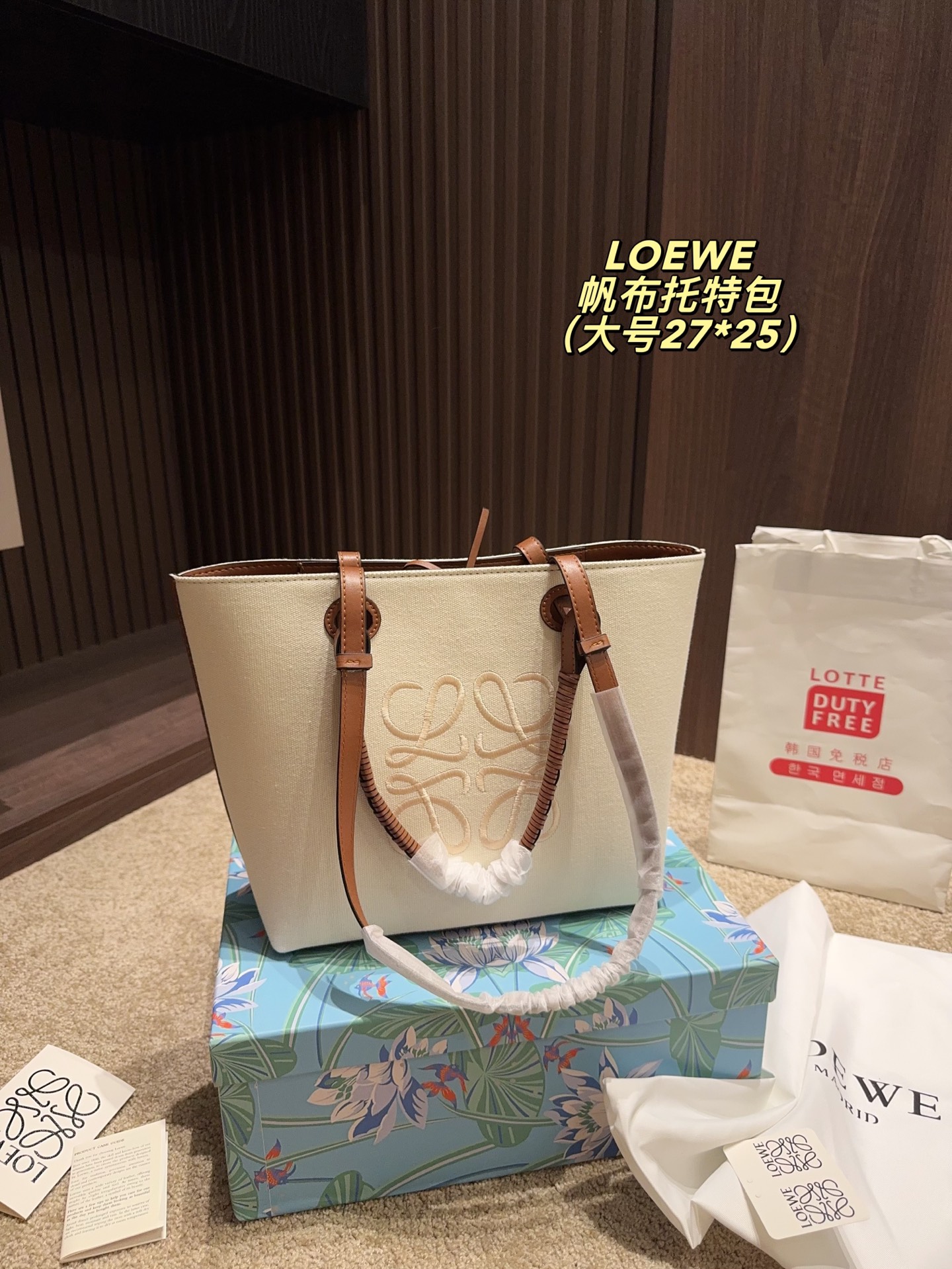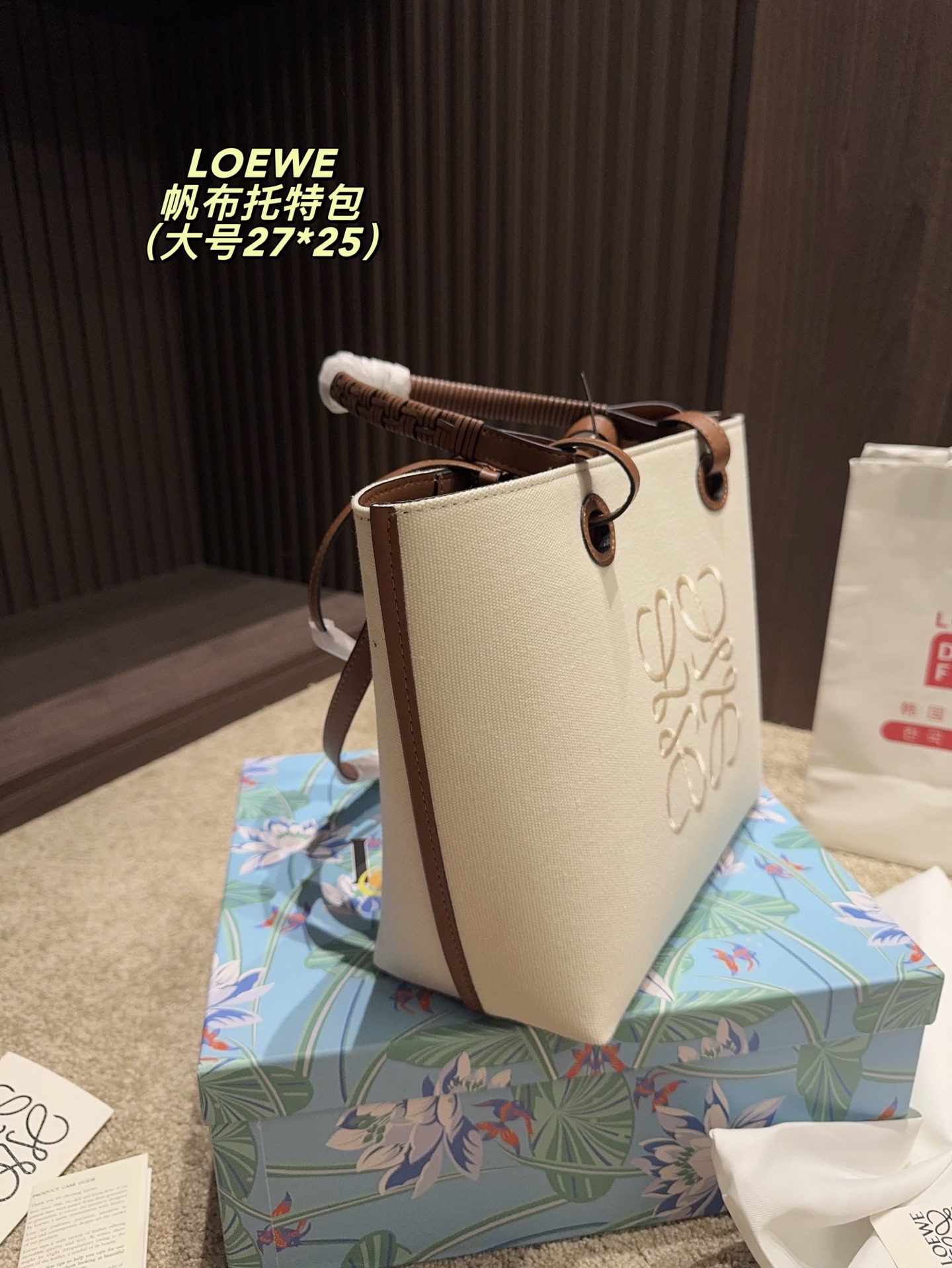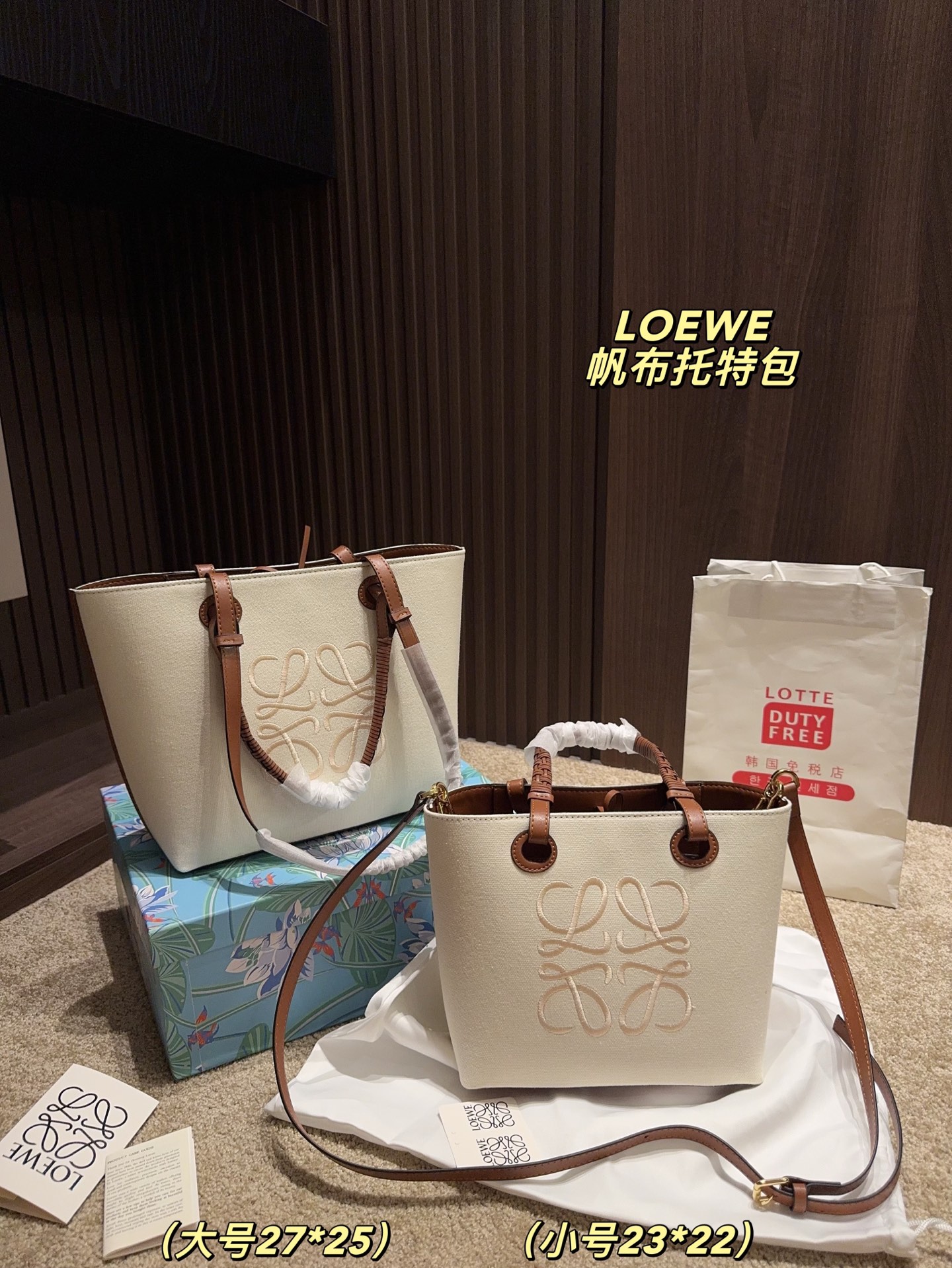 Large: 27.25, Small: 23.22. Loewe canvas tote, minimalist and lightweight, versatile style.