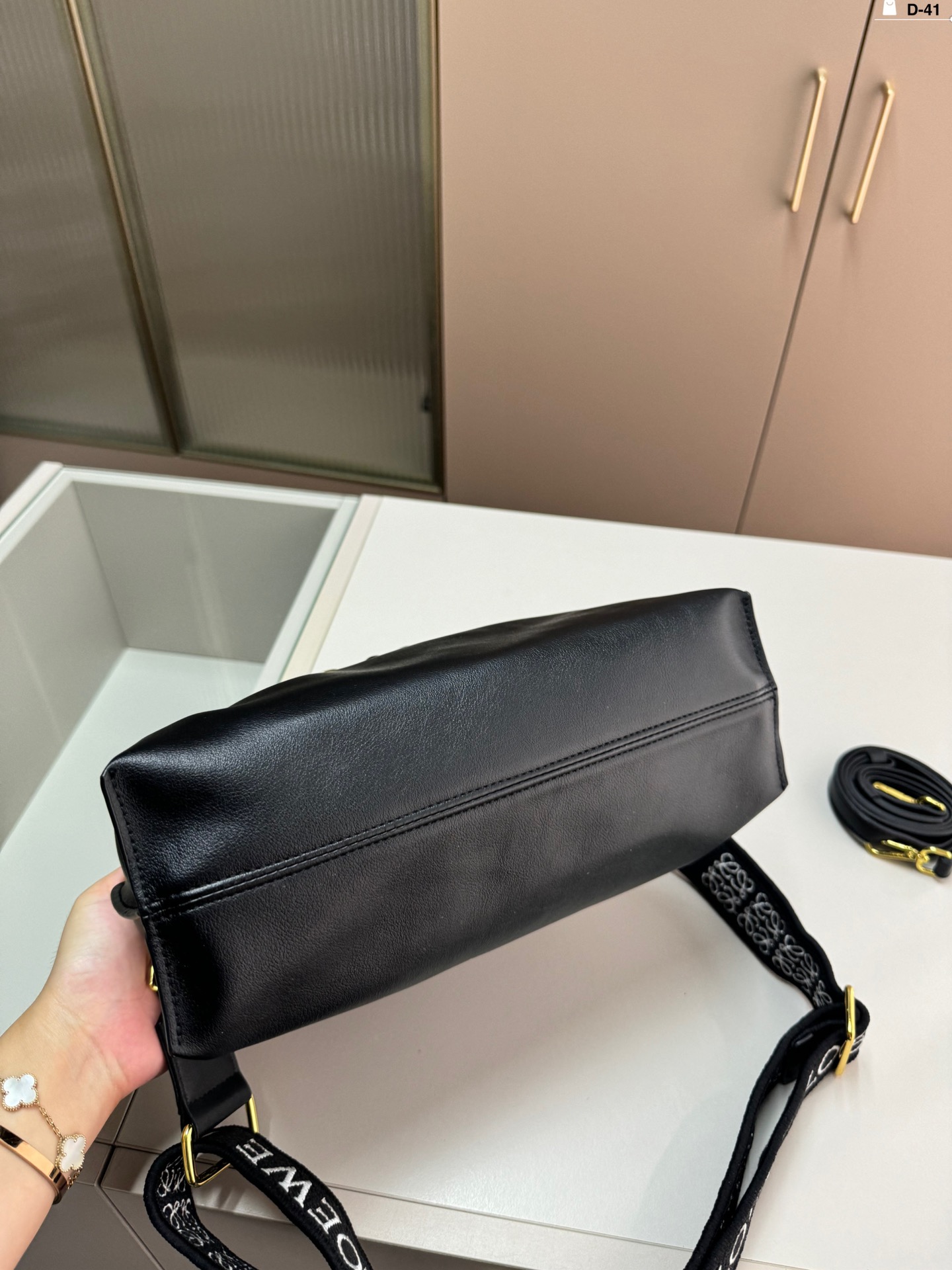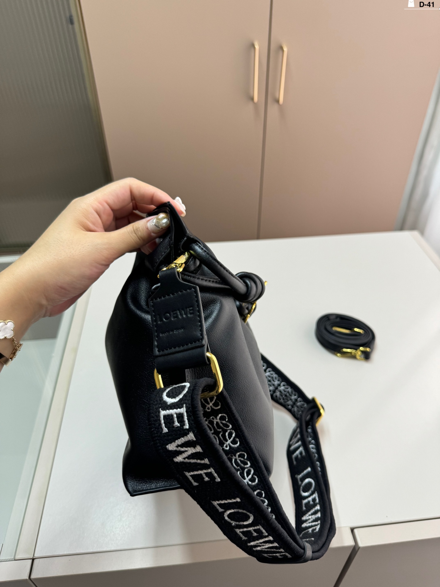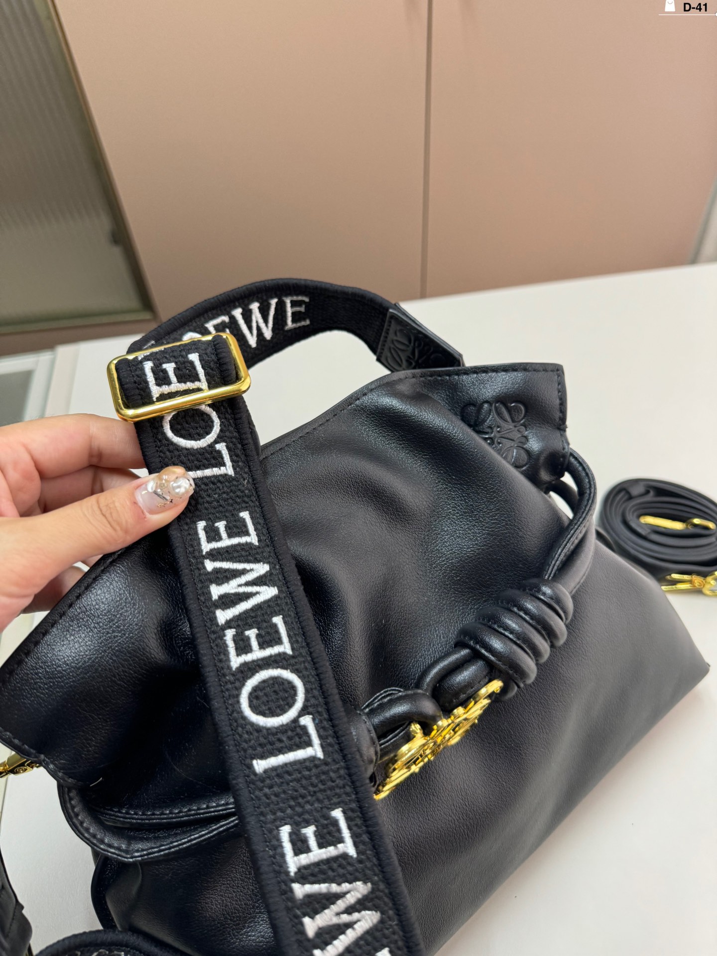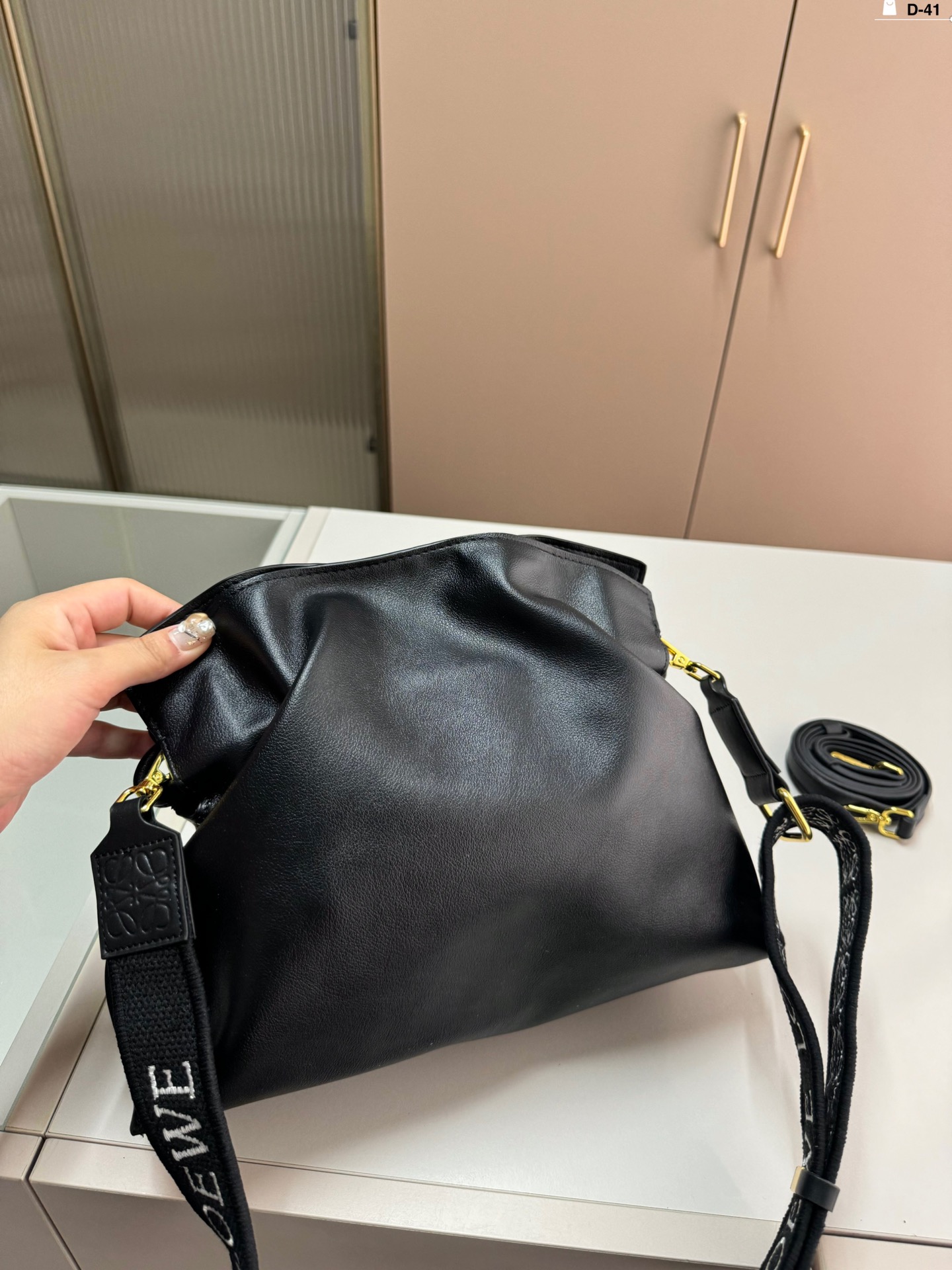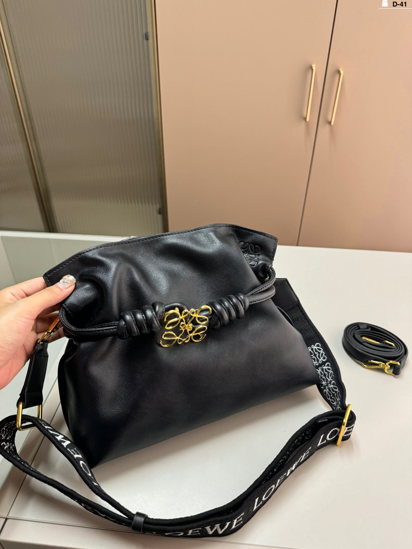 Loewe Flamenco Pouch D-41 in soft leather with brooch and wide strap. Cute and practical.