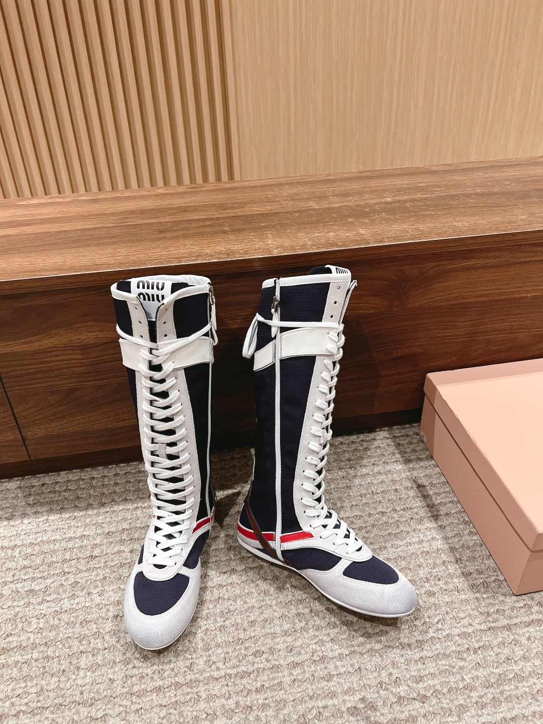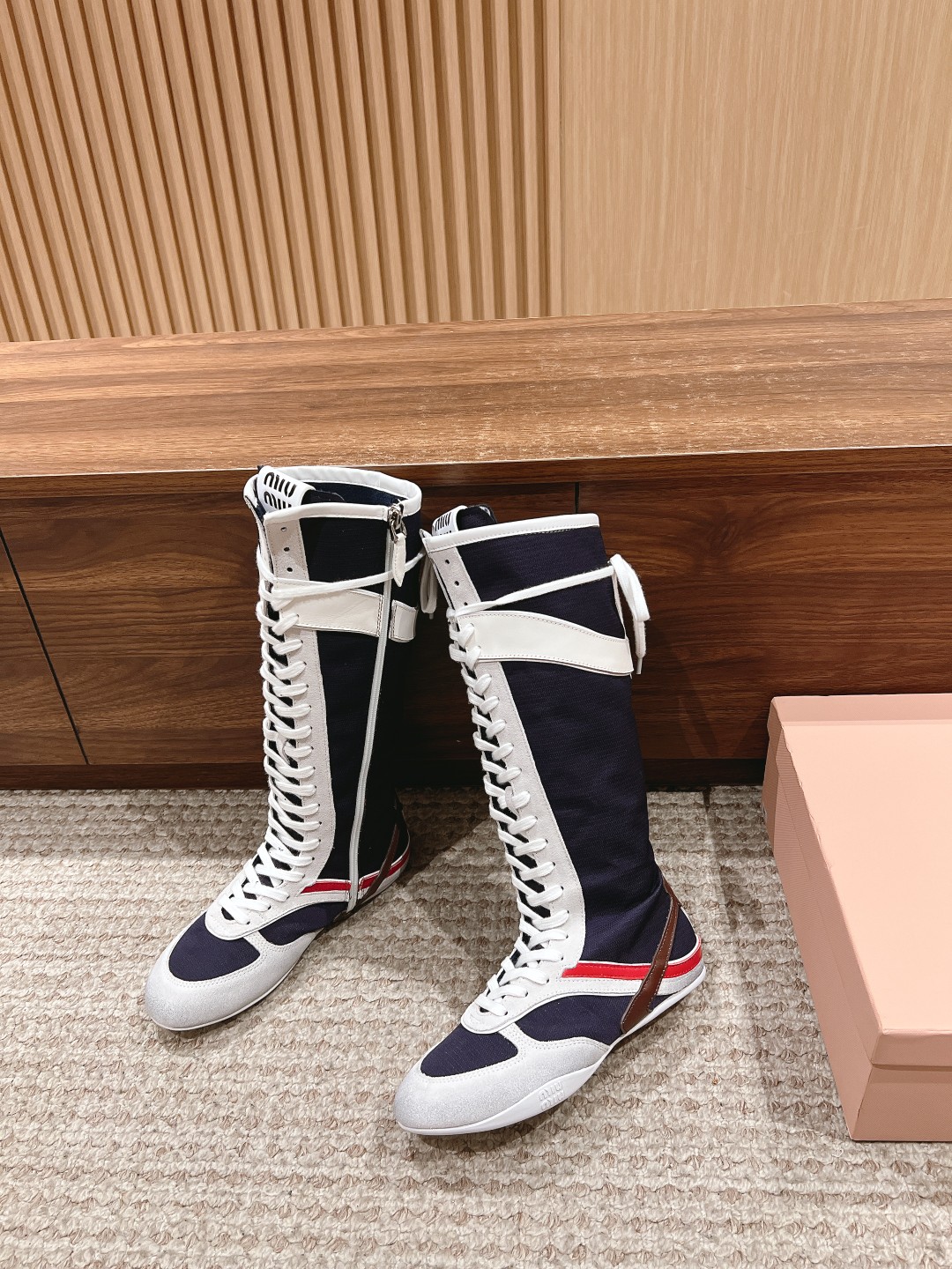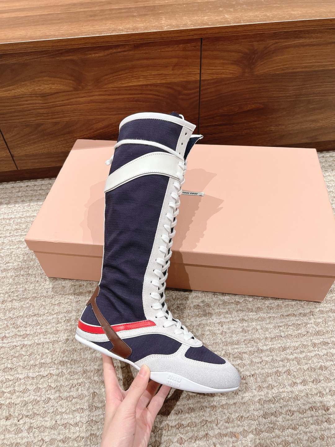 Home • Shoe • Miu Miu 2025 spring-summer high-top sneakers. Simplified lines, lightweight sole, bold colors. Made from imported suede. Sizes 35-41. Comfortable and fashionable.