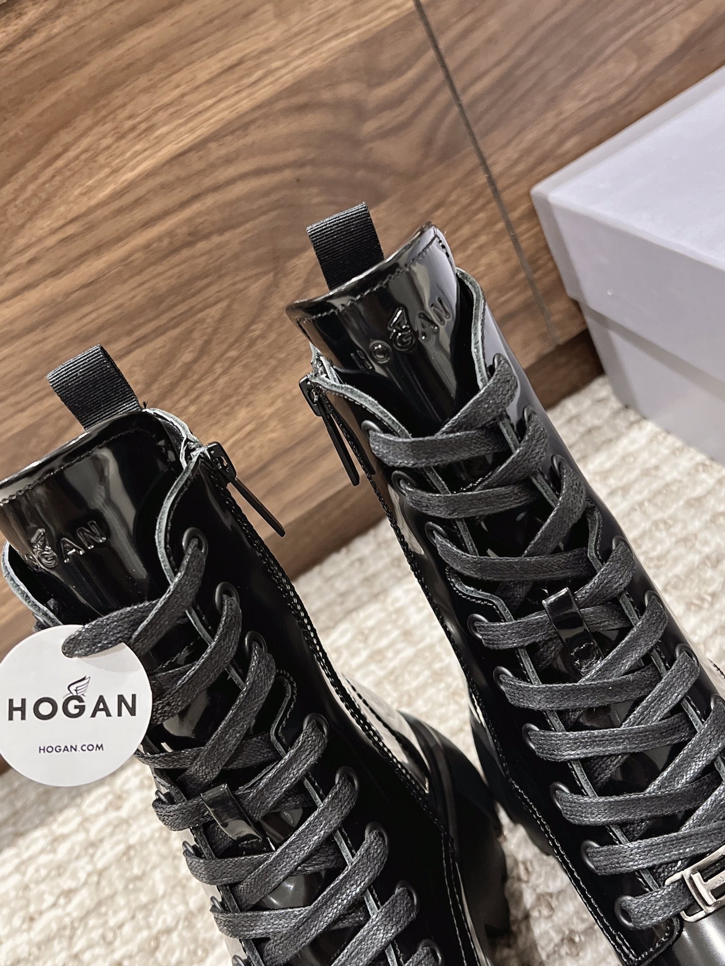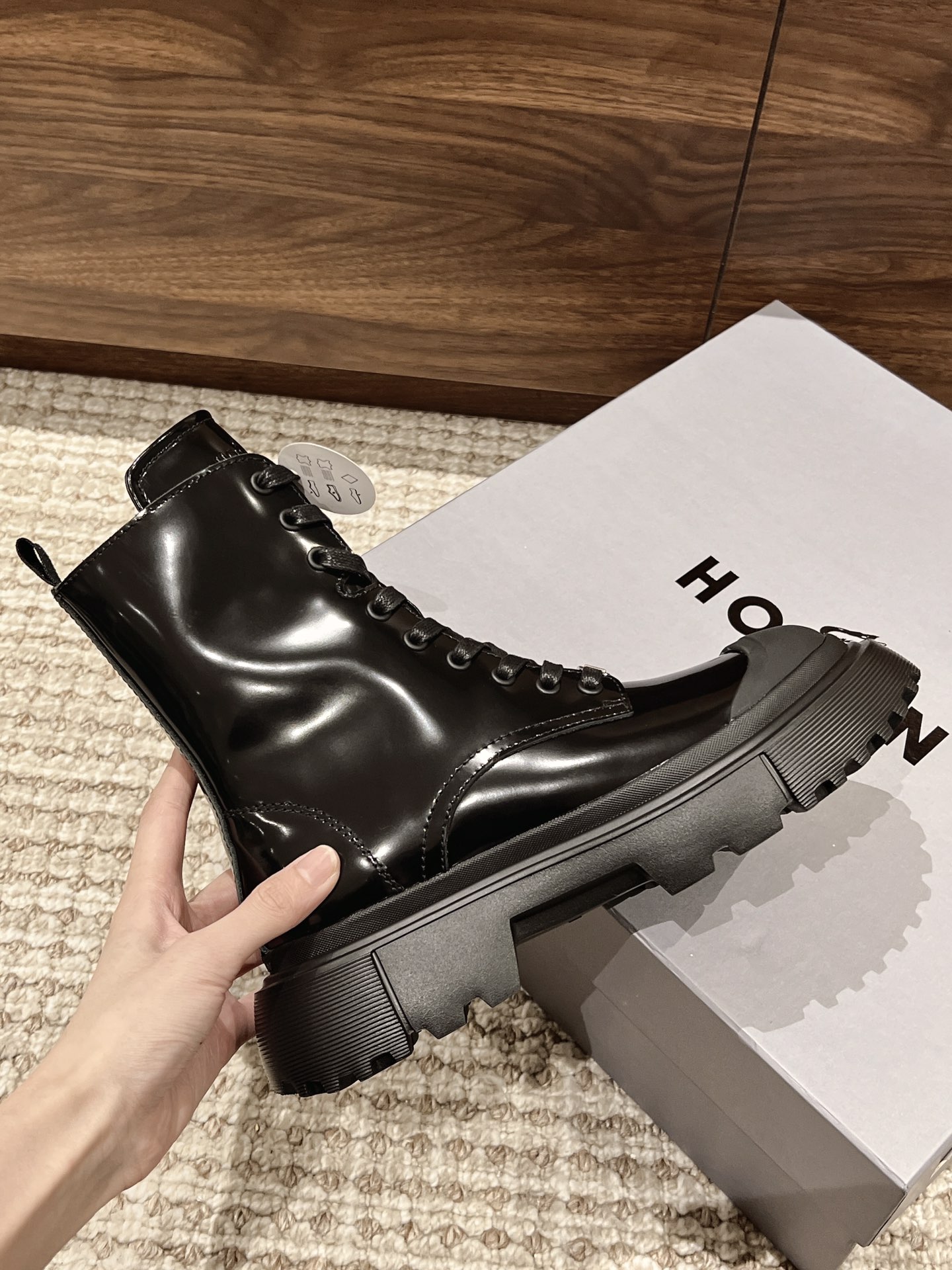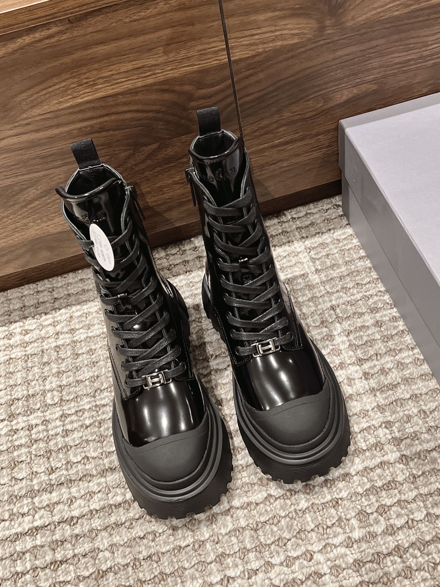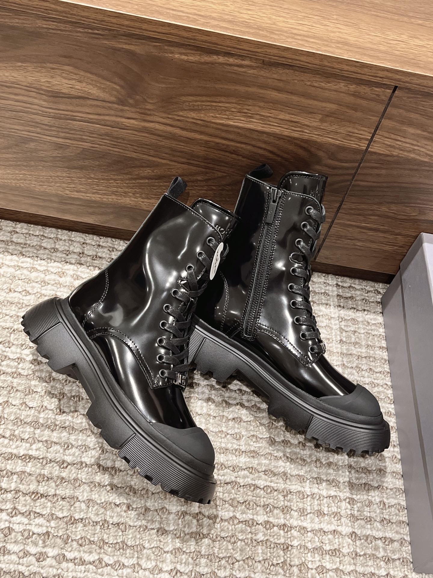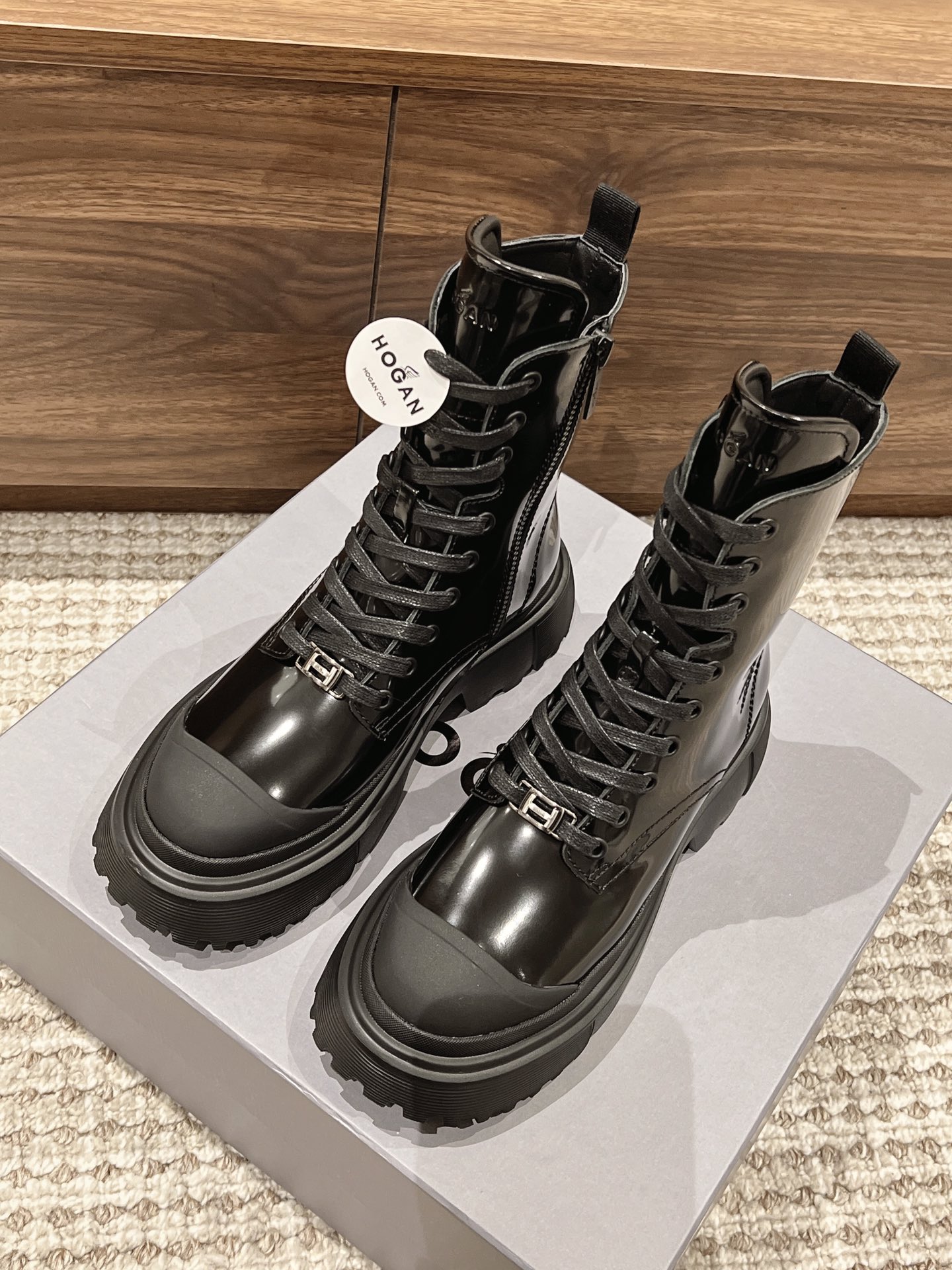 [Top Version] Hogan Hogan Fall/Winter 2022 New H619 Series Lace-up Martin Boots Knight Boots Platform Ankle Boots. Originally purchased for development and production. This women's winter loafer is made of patent leather, featuring a non-slip platform design incorporating military elements, with an H-shaped stripe on the sole for a rugged, individualistic look. The sole contrasts with the elegant design of the upper. Adorned with exquisite horizontal stripe decorations, it has an artificial fur lining for warmth and comfort, and a memory foam insole that gently wraps the feet, making it an excellent choice for creating a fashionable urban style. Comes with exquisite department store packaging. Custom original imported full-grain cowhide material. Imported soft lambskin lining. Original mold ultra-light rubber foam sole. 5CM platform. Size: Women's 35-40.