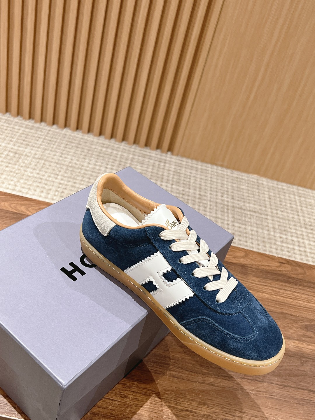 The upper is made of suede leather material with a padded tongue design, and the side is adorned with serrated-edge Napa leather H lettering.
