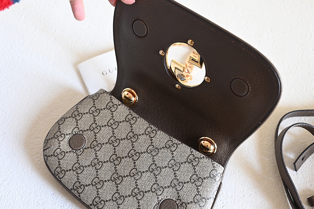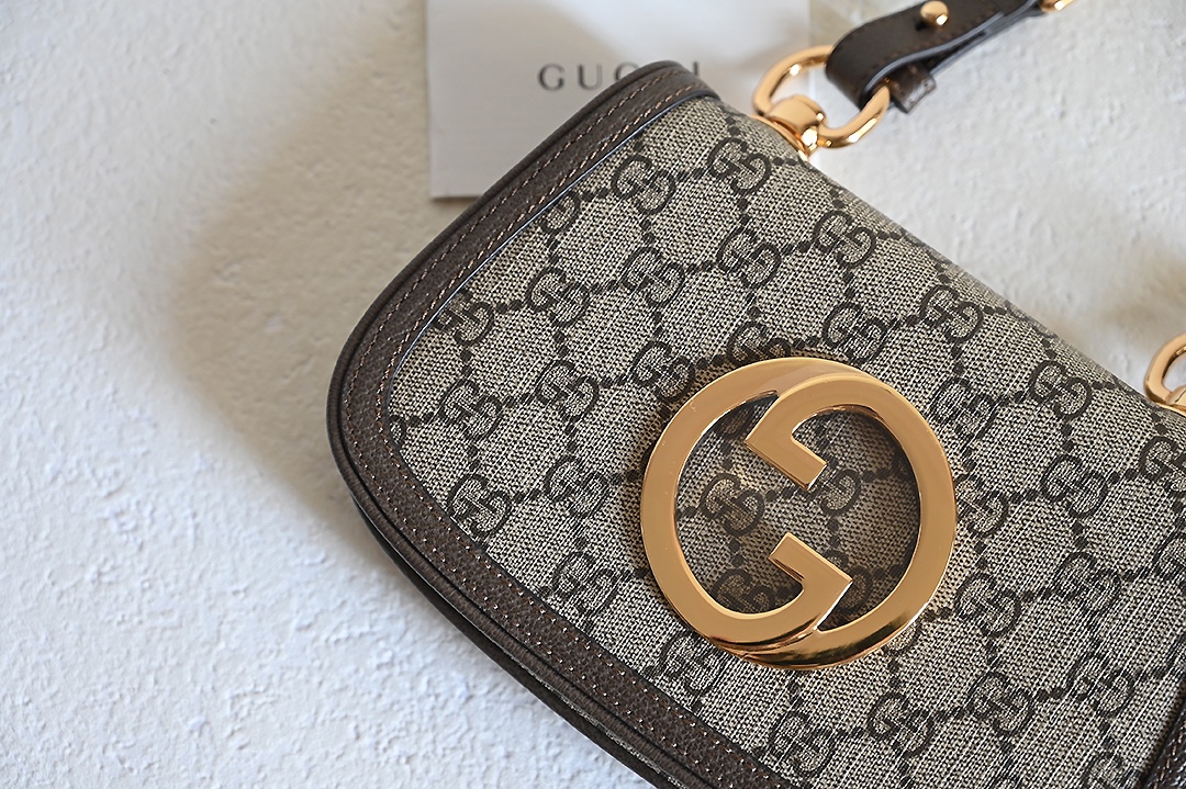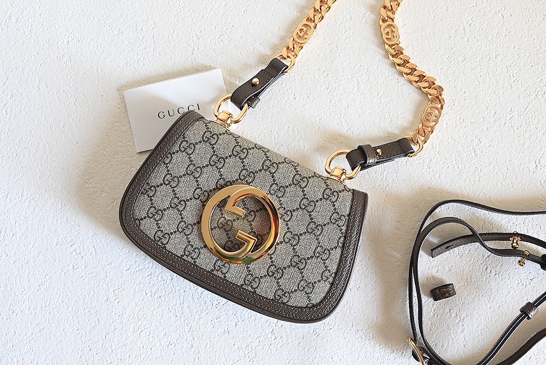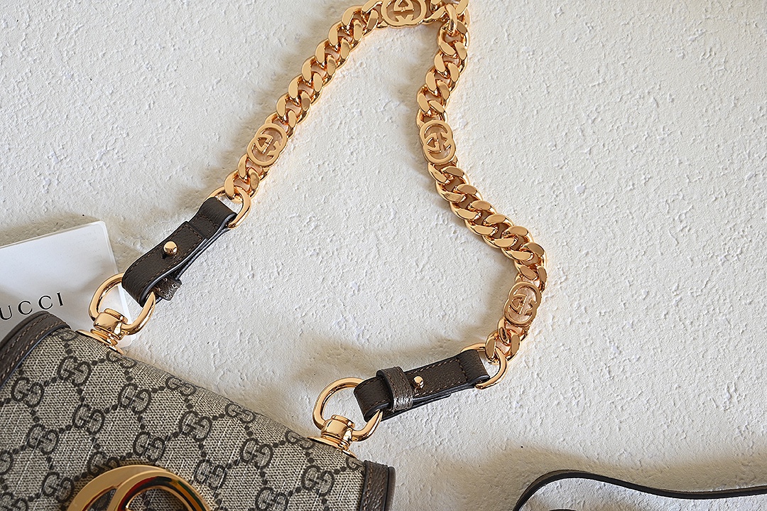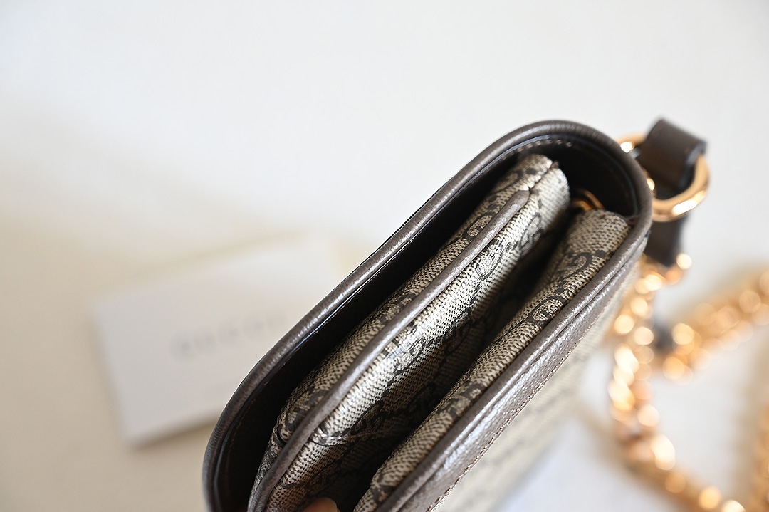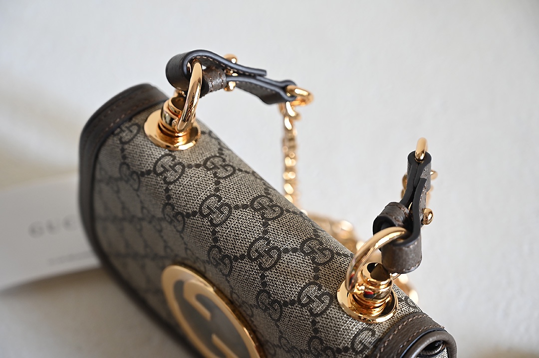 ❤❤️💛💛 New GG Blondie series round interlocking double G mini shoulder bag, beige and ebony GG with brown leather, gold-toned accessories, featuring detachable chain shoulder strap and leather shoulder strap, model number 724645 brown, dimensions 21.5X13.5X7~[Rose][Rose]