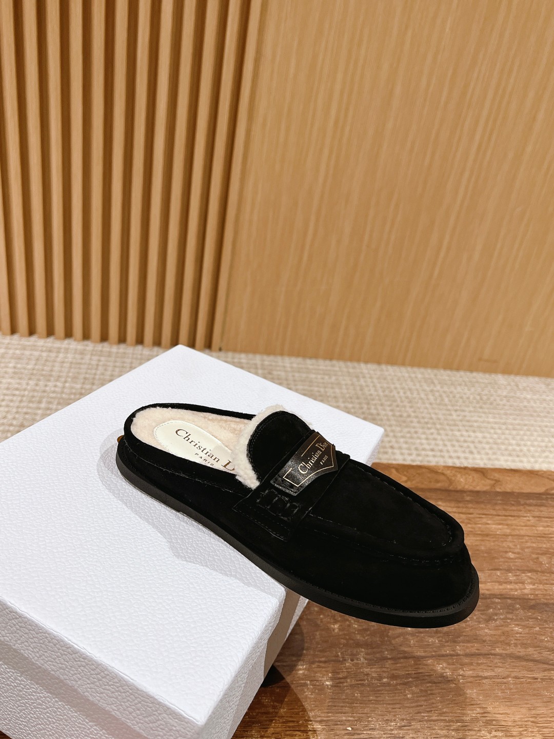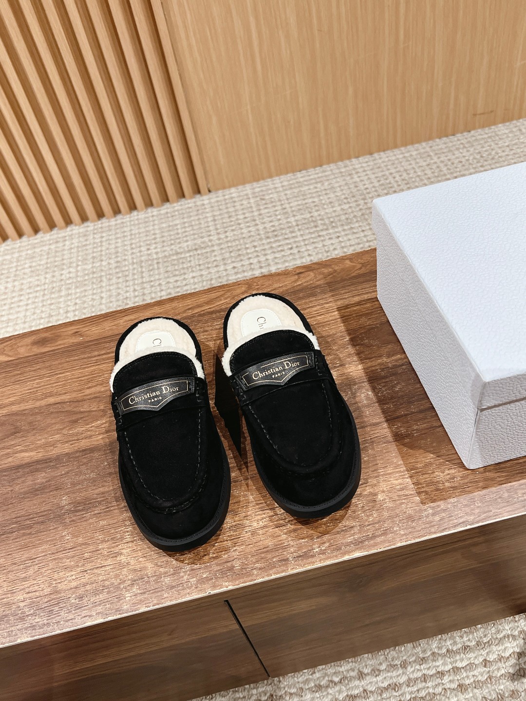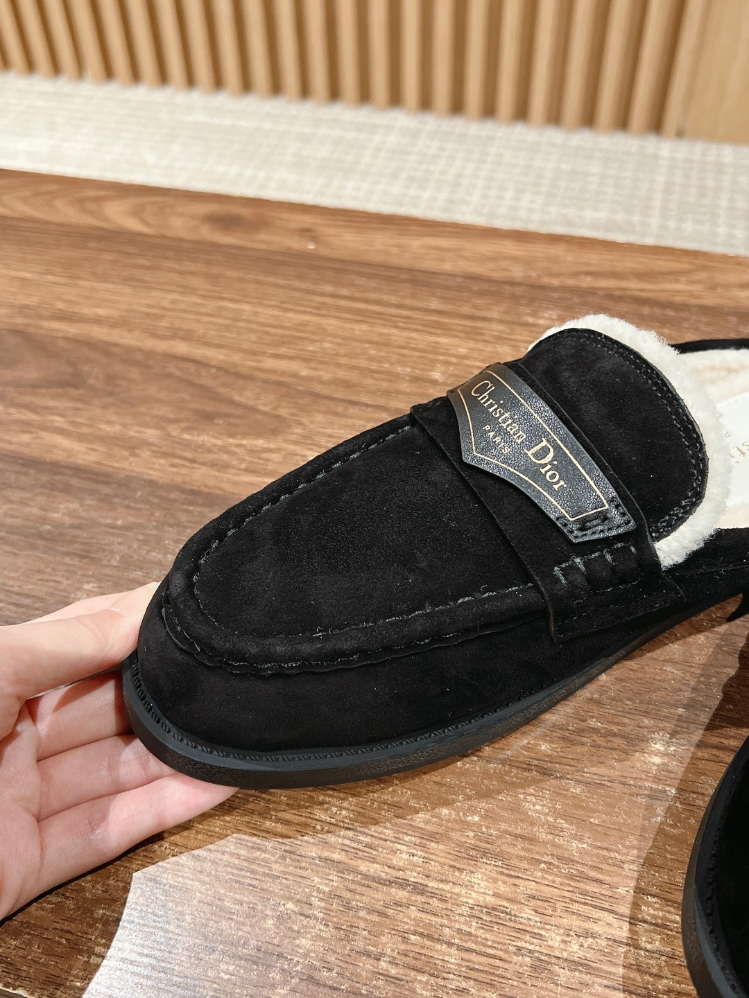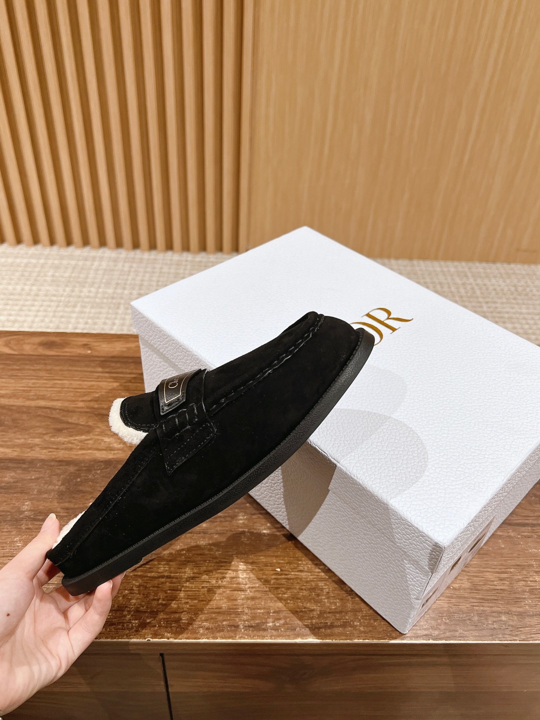 This design incorporates Dior's extraordinary craftsmanship, reinterpreting the classic loafer style. Meticulously crafted from materials like suede lambskin and adorned with integrated white fur lining to enhance the style. The front leather tag features a gold-toned Christian Dior Paris logo. Paired with a rubber sole for softness and comfort. Size: 35-39 (40/41 custom-made, no returns/exchanges)