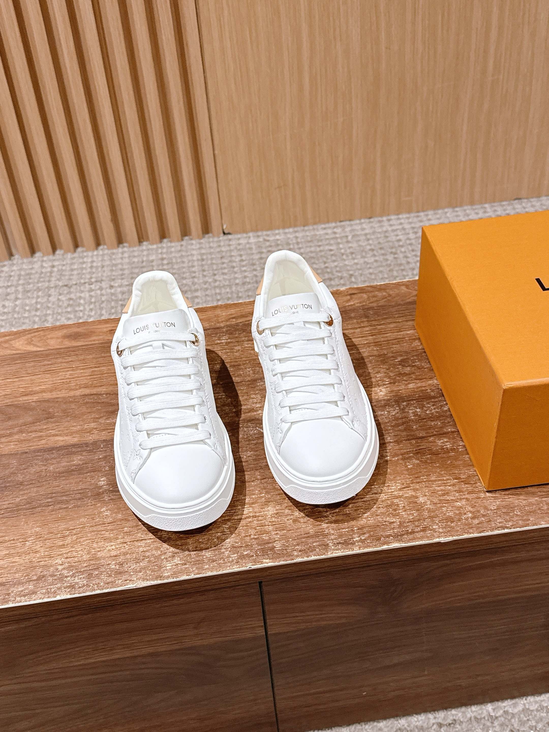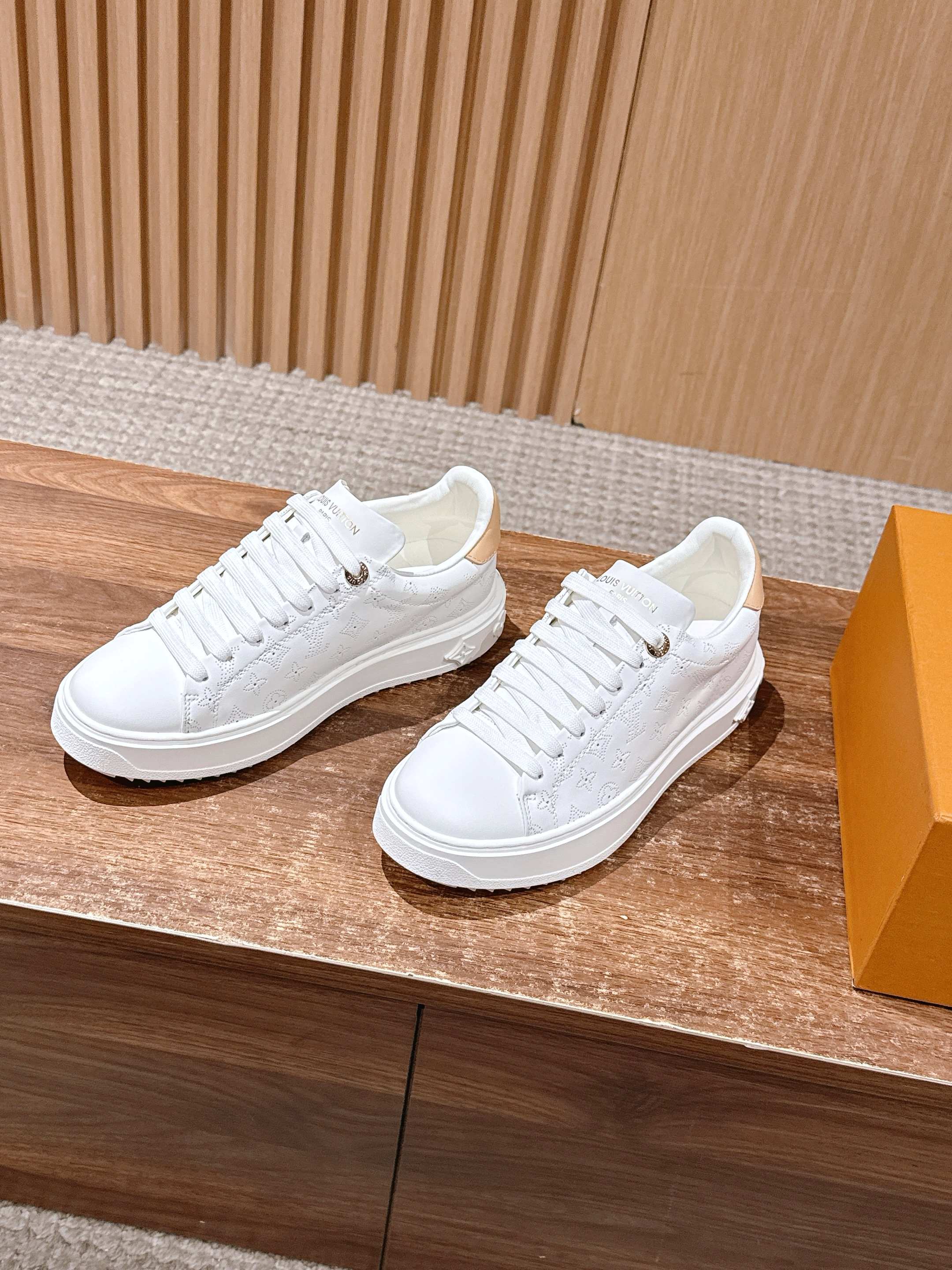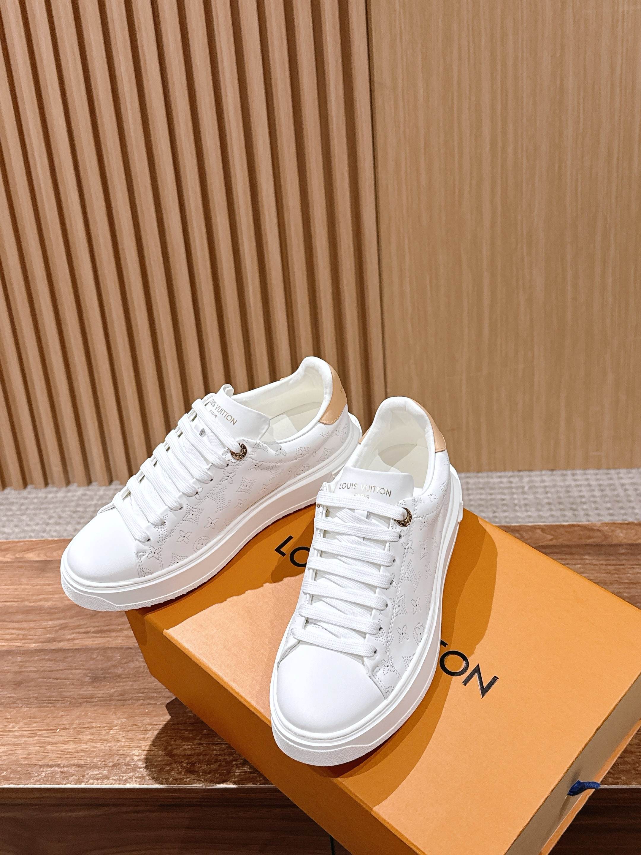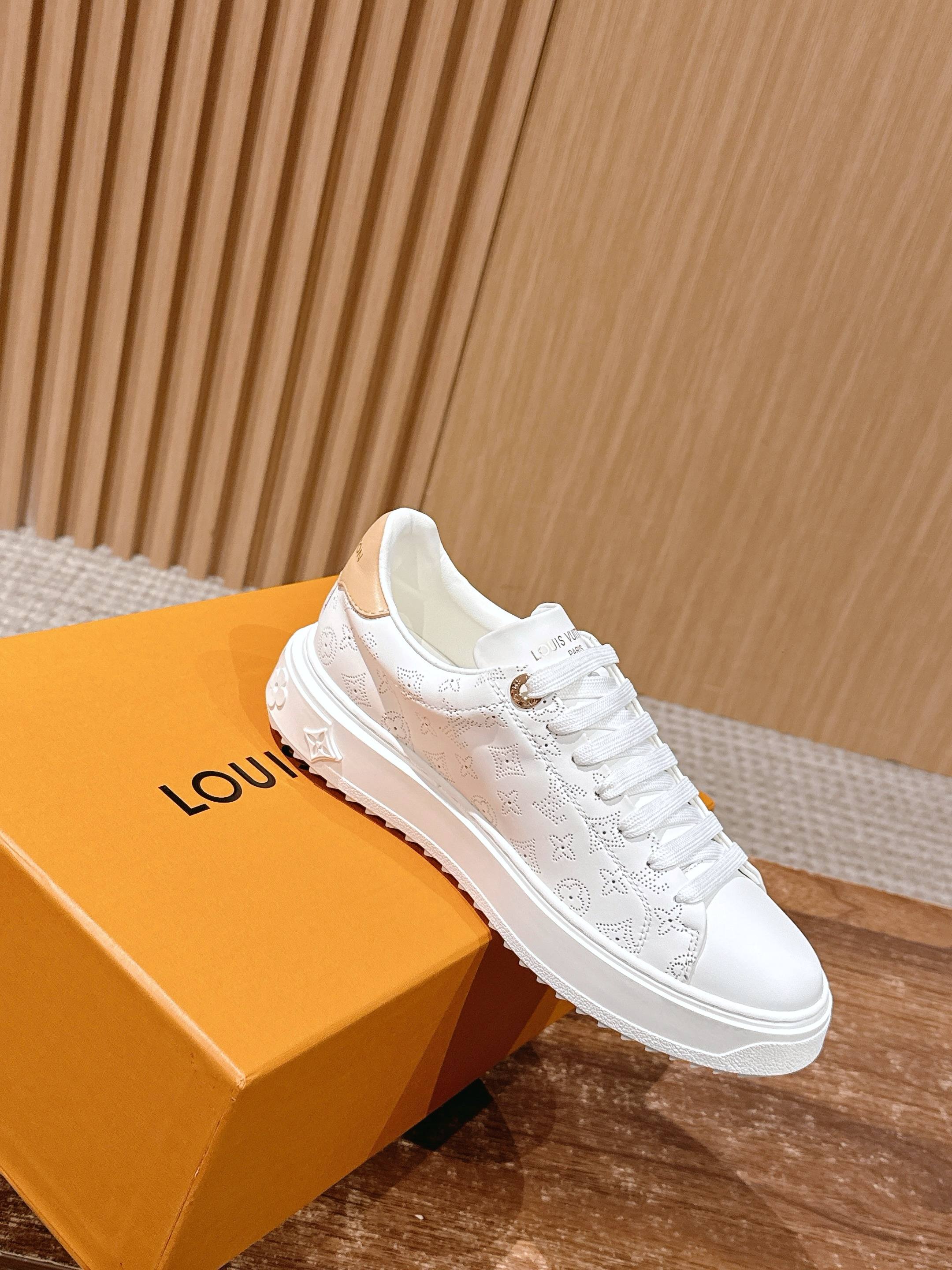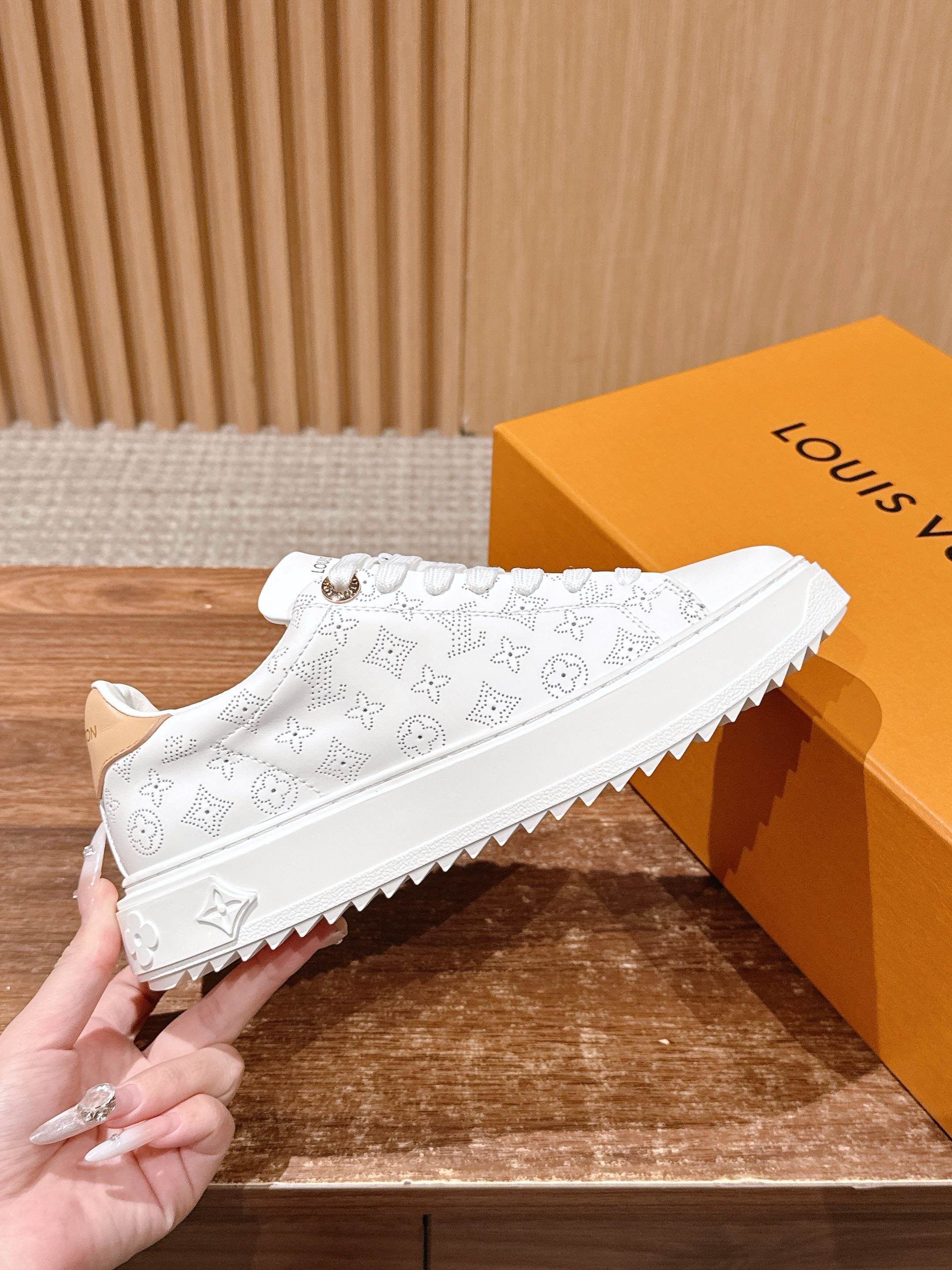 [Top Version] Louis Vuitton # New LV pattern printed classic thick-soled sports shoes, new design. This Time Out sports shoe features soft calf leather embossed with a mini Monogram pattern, refreshing LV's classic design. 3D logo accents, thick grooved outsole, and engraved eyelets add exquisite details. Size: 35-39 (40/41 custom order)