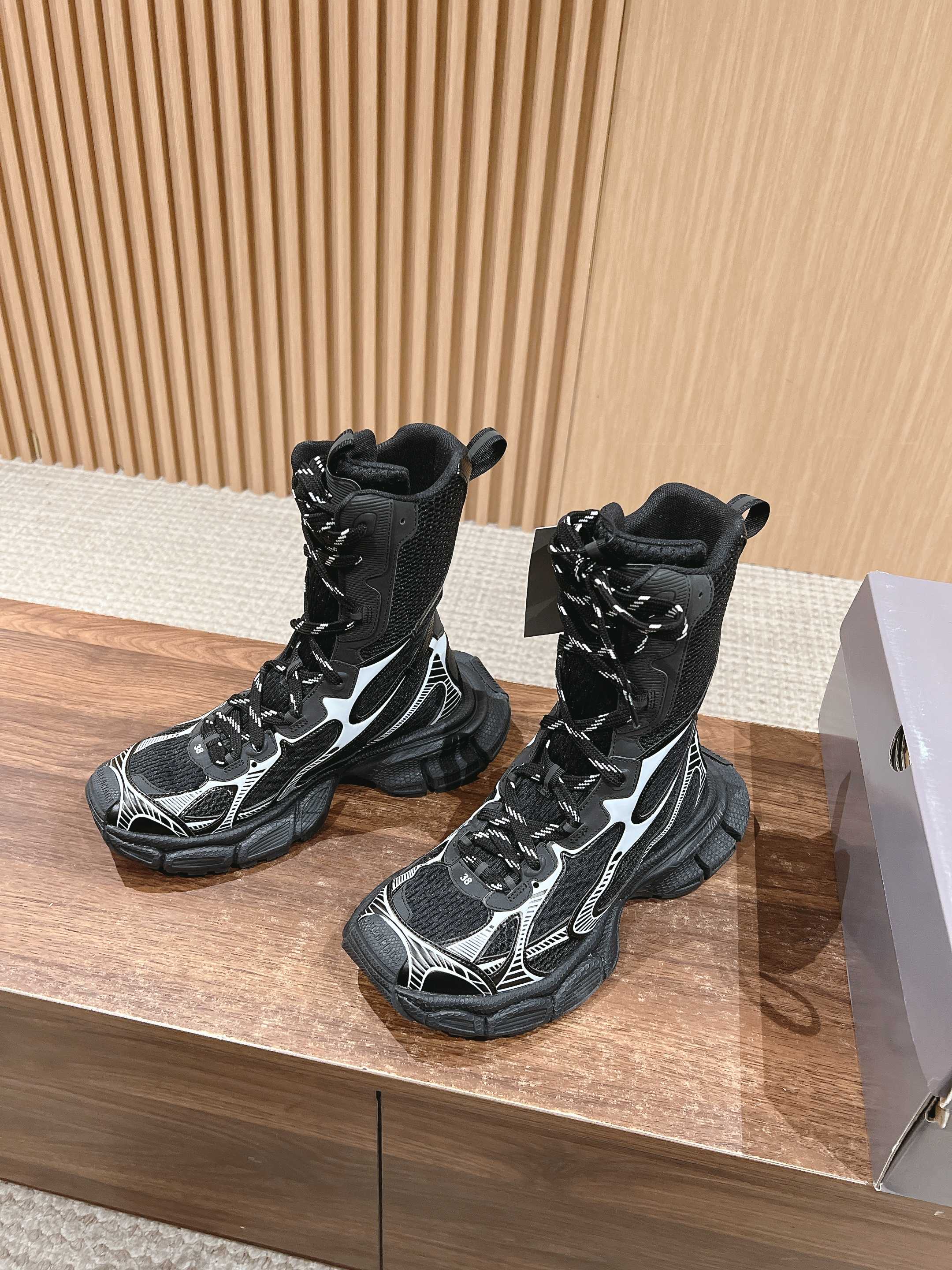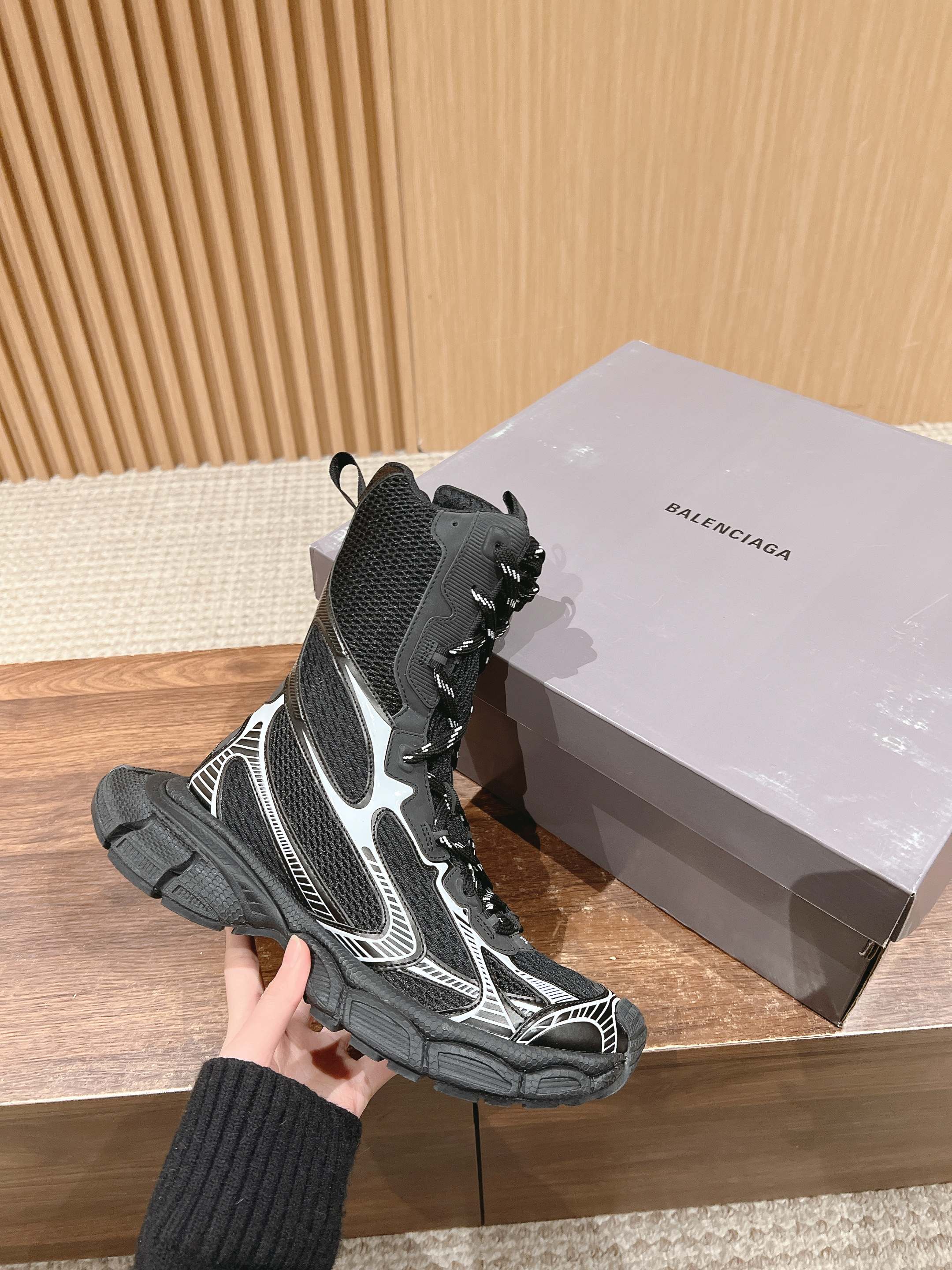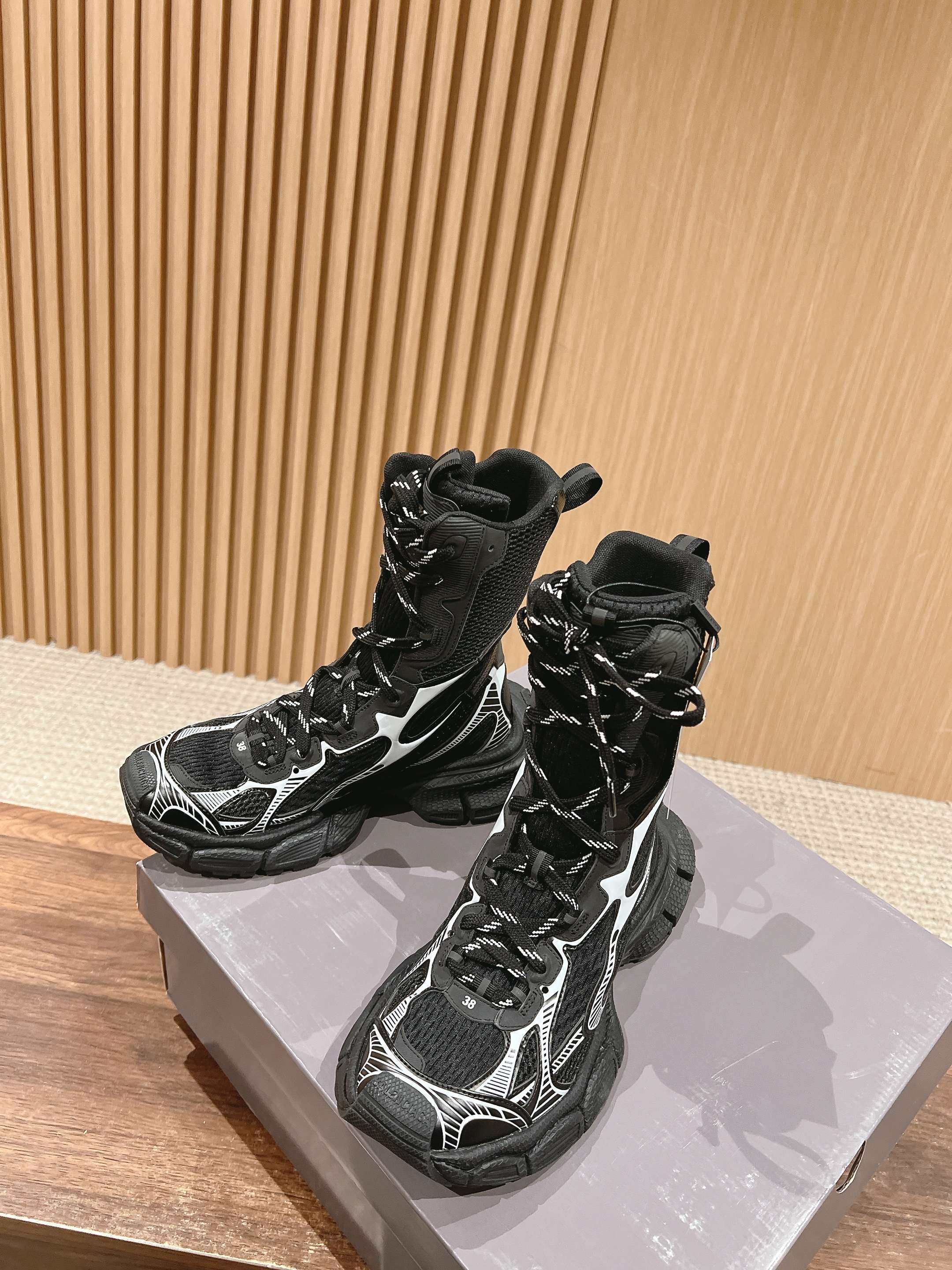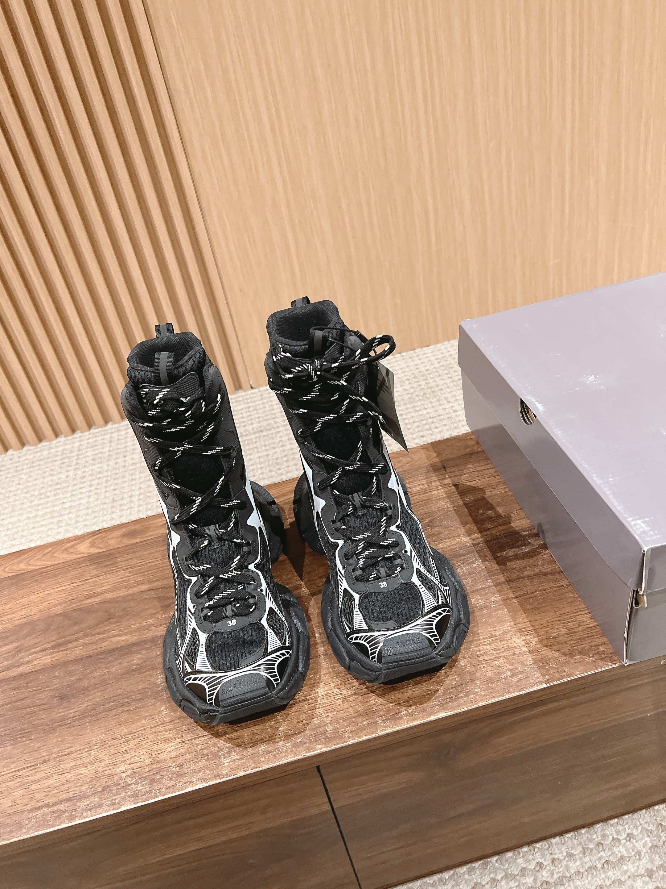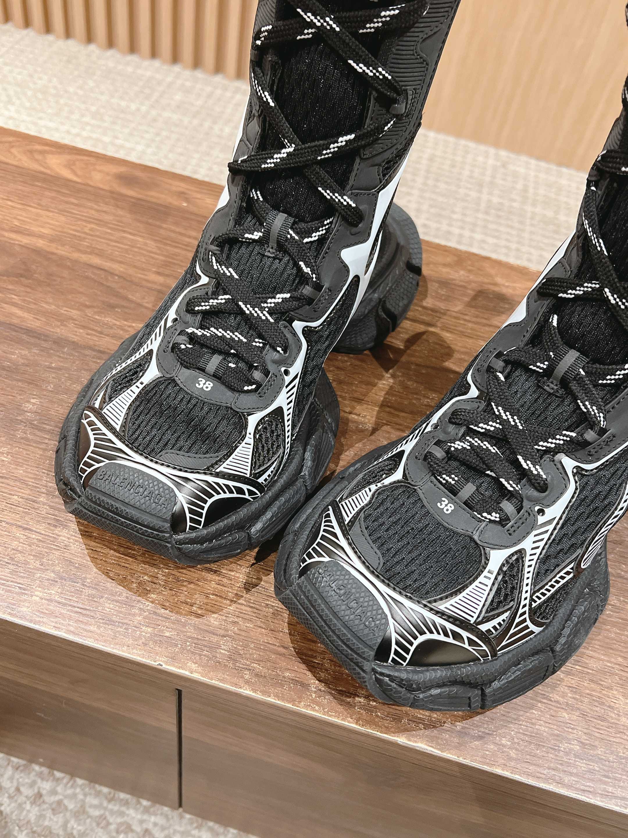 [Top Version] [High-Top Boots] BALENCIAGA# Balenciaga New 3XL Sneaker Series Couple Style Casual Dad Shoes Athletic Shoes The overall shoe shape draws creative inspiration from both the Balenciaga Track and Balenciaga Runner models. It's essentially like removing the outer frame from the Track upper, while inheriting the Runner's streamlined silhouette and the Track's flat toe. An additional pair of tied laces is added to the front section of the upper for styling.