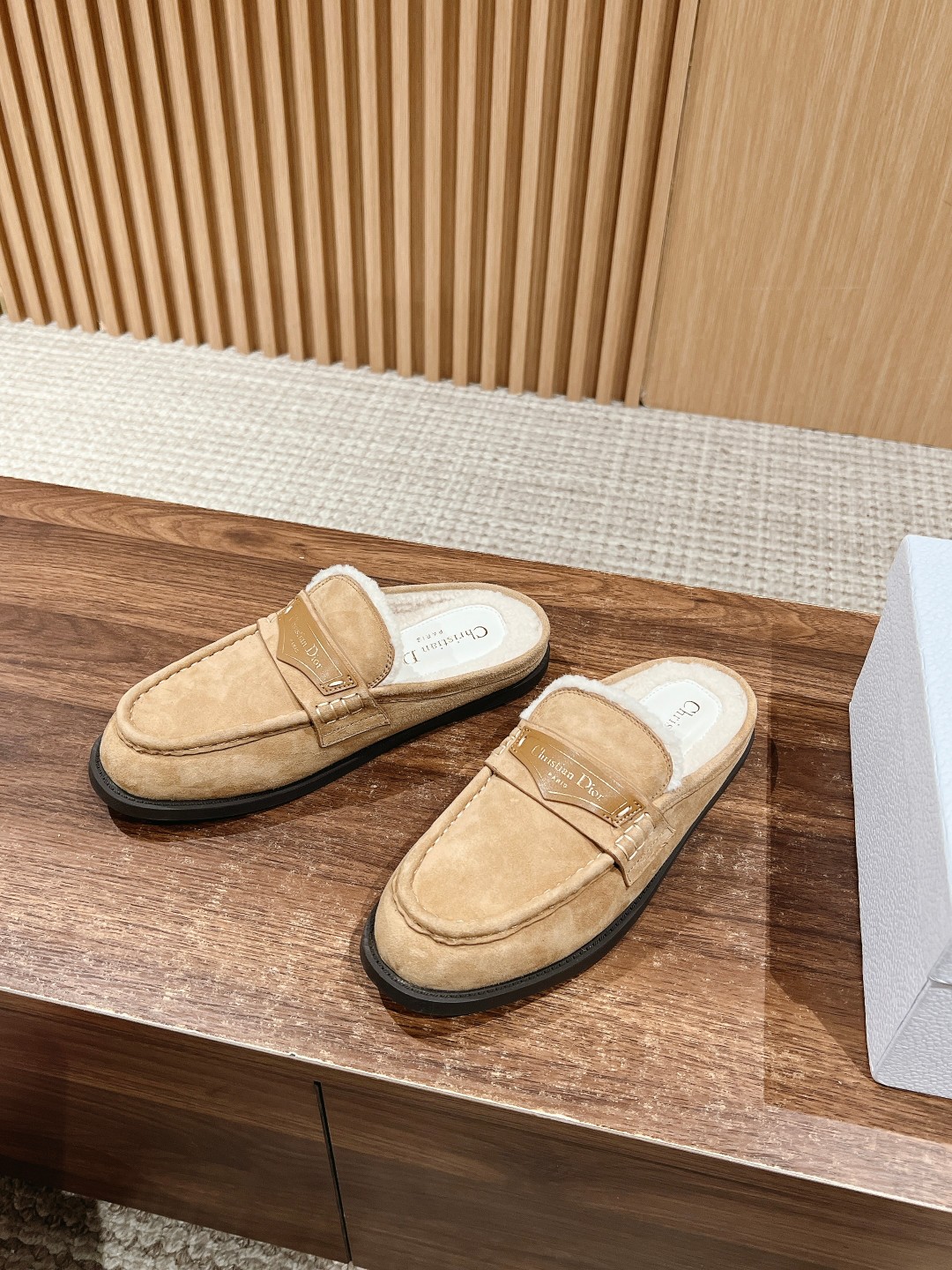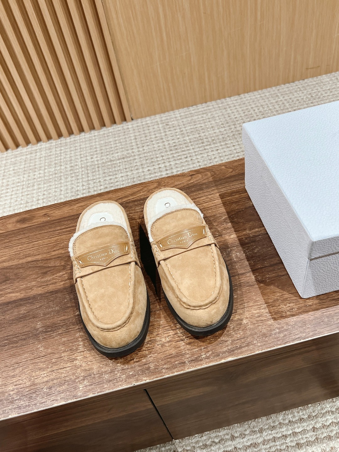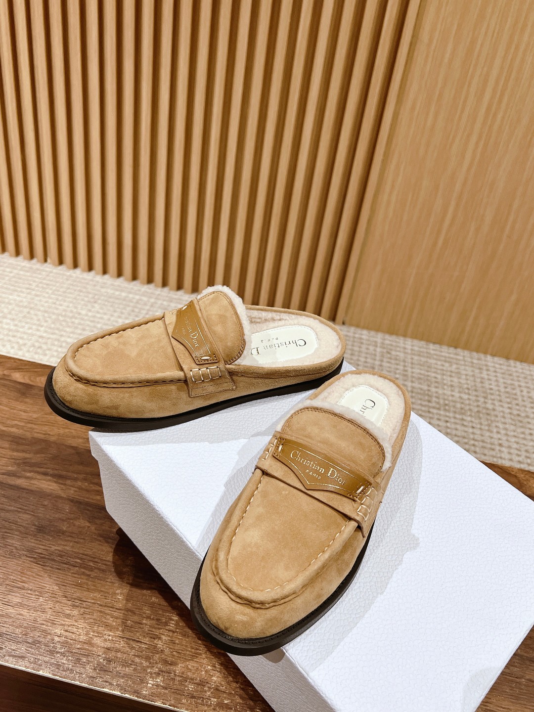 This design incorporates Dior's extraordinary craftsmanship, reinterpreting the classic loafer design. Meticulously crafted from materials such as suede lambskin and adorned with integrated white fur lining to enhance the style, the front leather tag features a gold-toned Christian Dior Paris logo. Paired with a rubber sole for softness and comfort. Size: 35-39 (40/41 custom-made, no returns or exchanges)