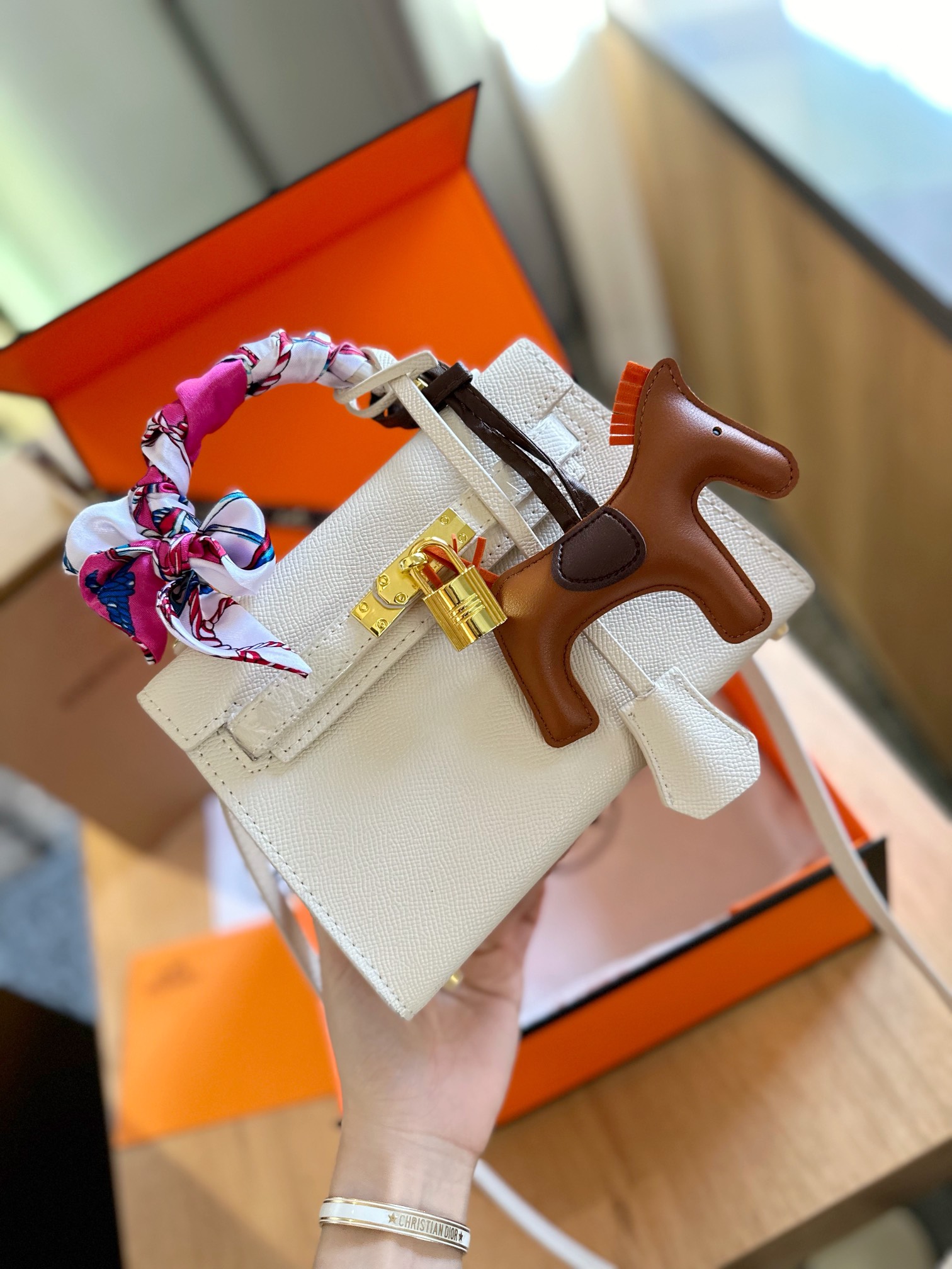 Gift box packaging, includes a scarf and a small horse pendant.