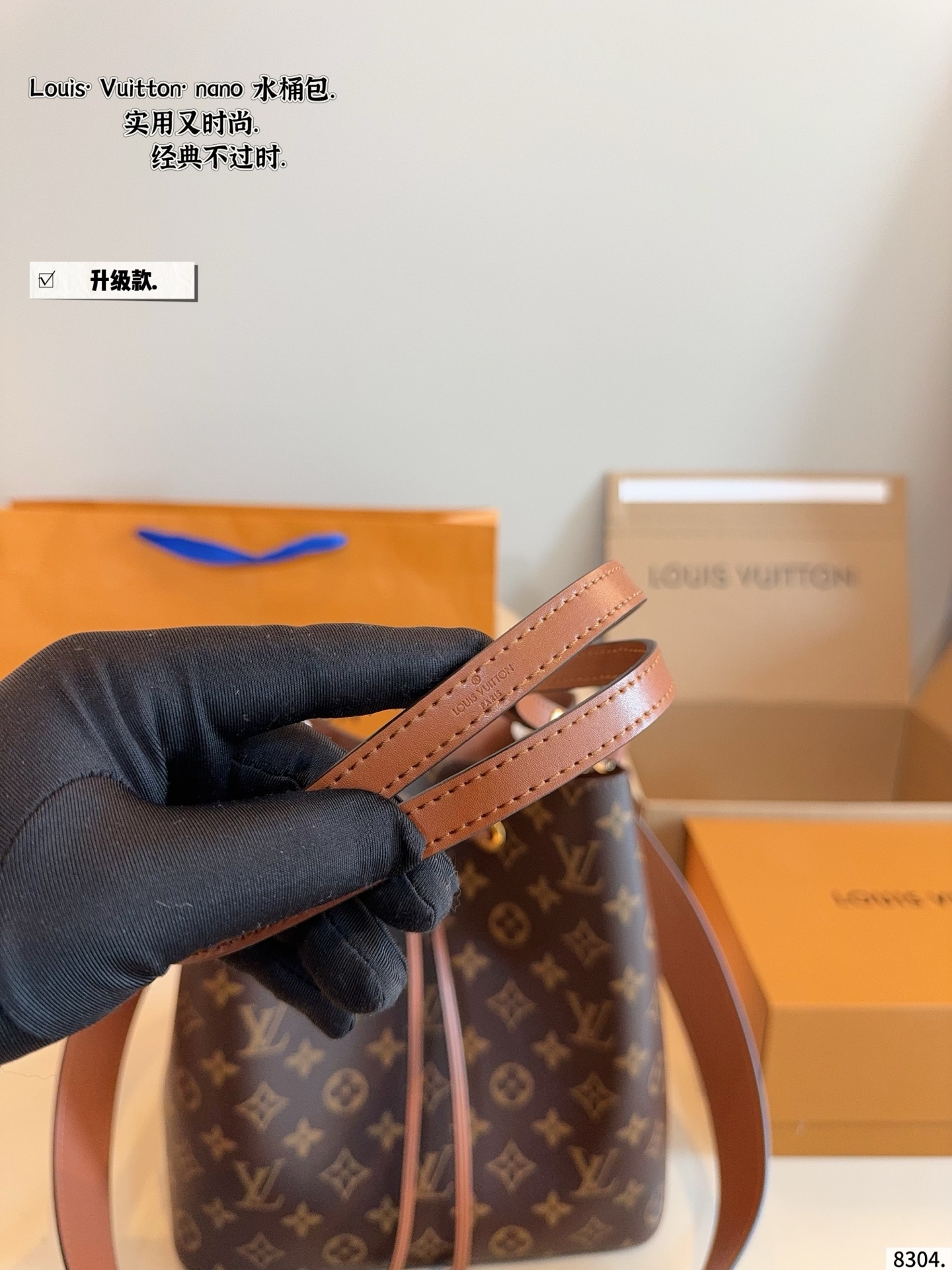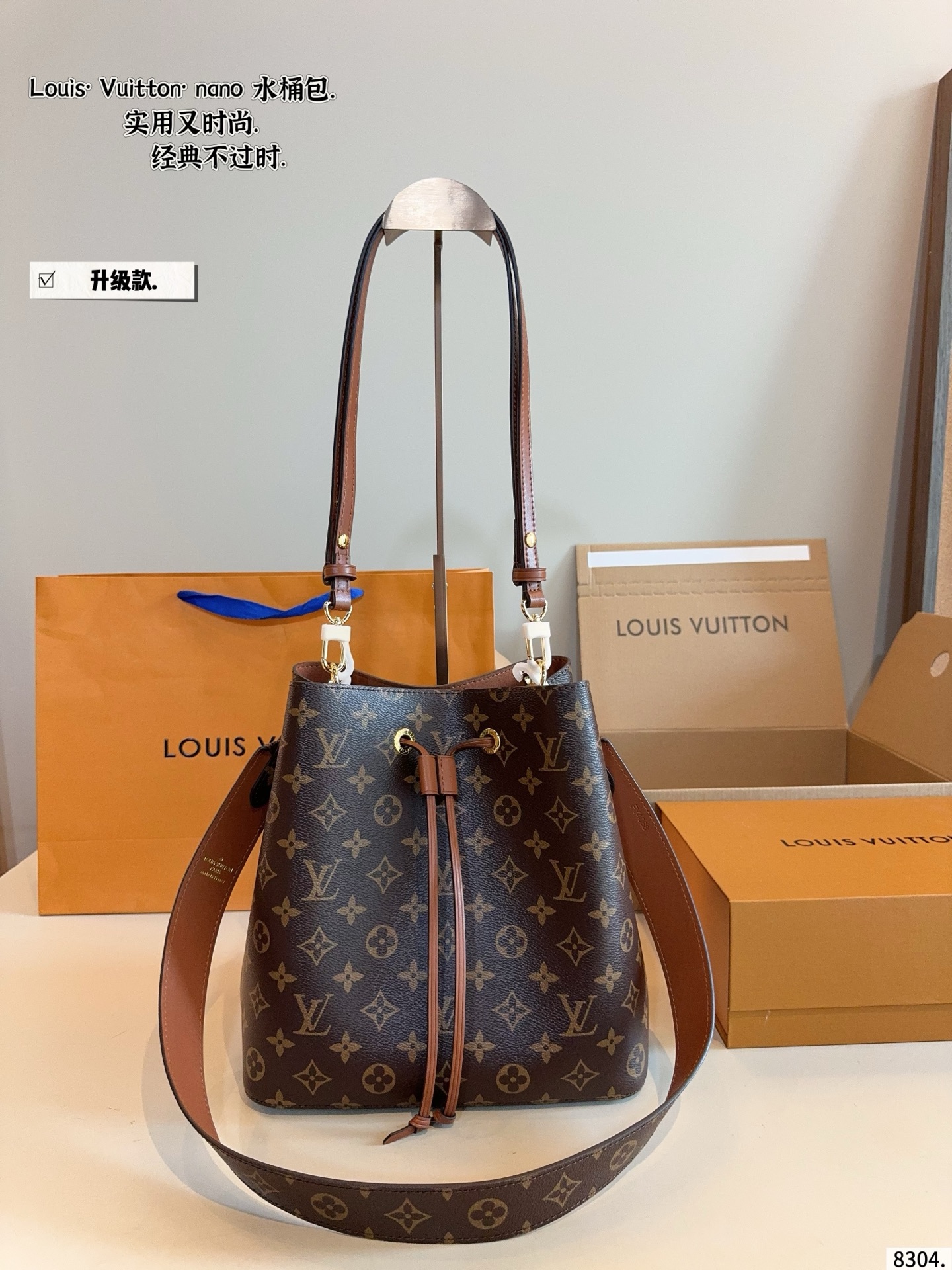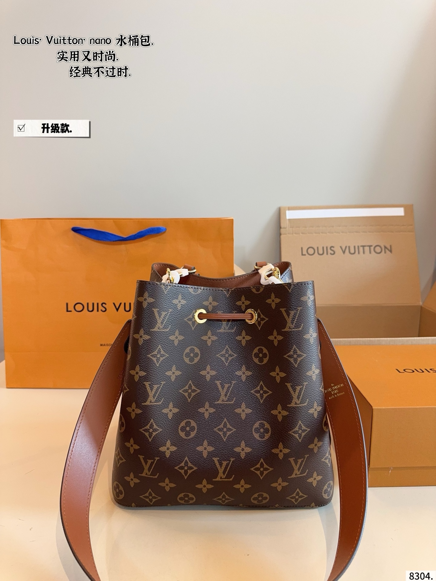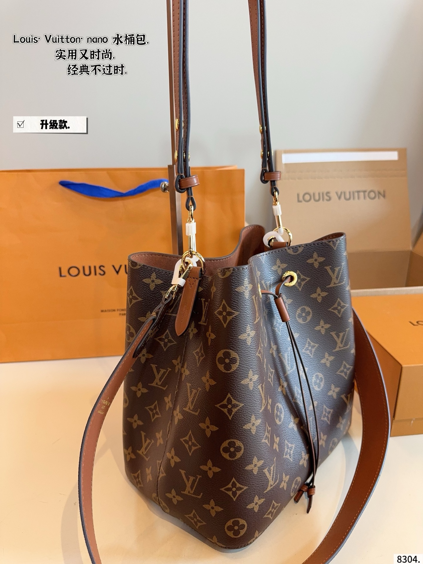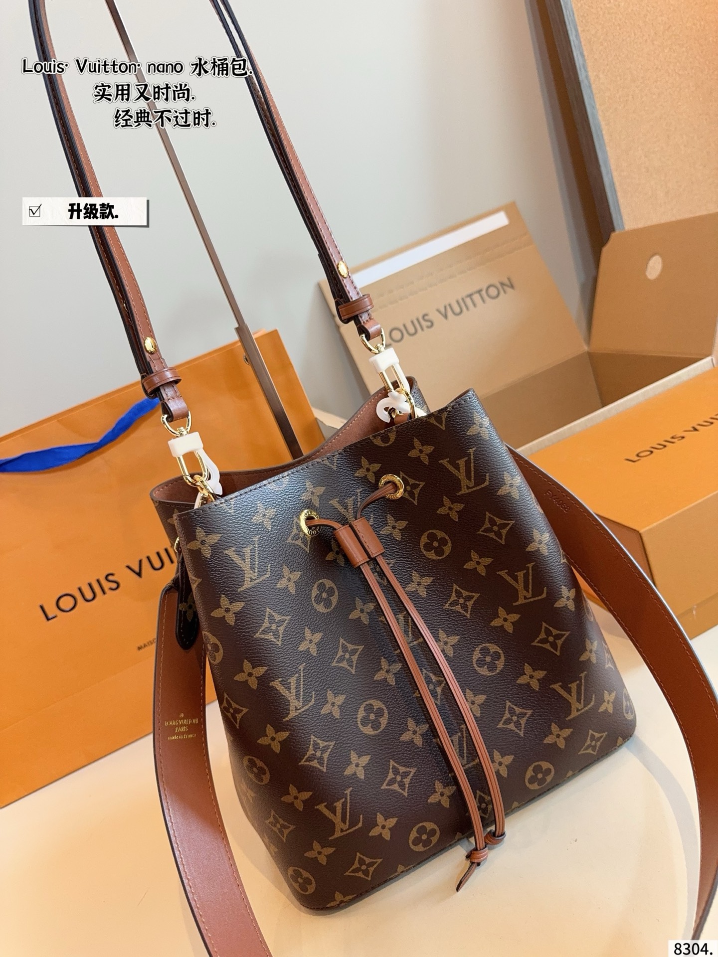 LV champagne bucket, full of boutique flavor. LV bucket bag Néonoé is made of soft Monogram canvas and decorated with变色皮 (patina leather). The details have perfect pattern alignment. It comes with genuine变色小牛皮 (patina calfskin). All original hardware features the logo. Top-quality original order. Adjustable shoulder strap design for creating a modern crossbody style. Colorful microfiber bonded lining. Dimensions: 25*16*25cm