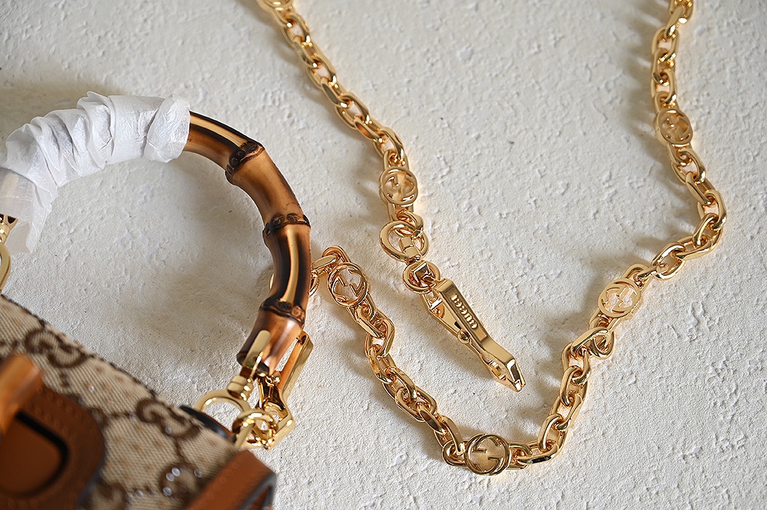 The canvas and crystal-embedded GG are perfectly integrated, with a natural bamboo handle, full brass hardware chain, and the shoulder strap has been replaced with a more refined metal chain, perfectly showcasing the uniqueness of this bag, which truly captures my heart.