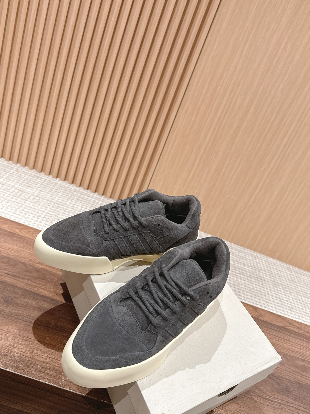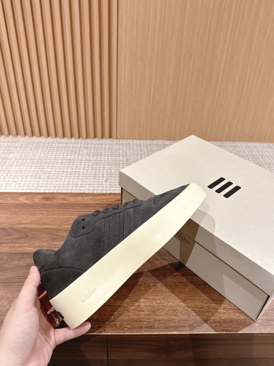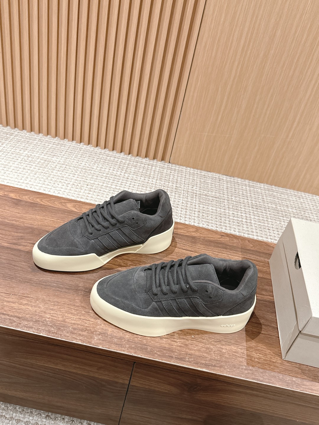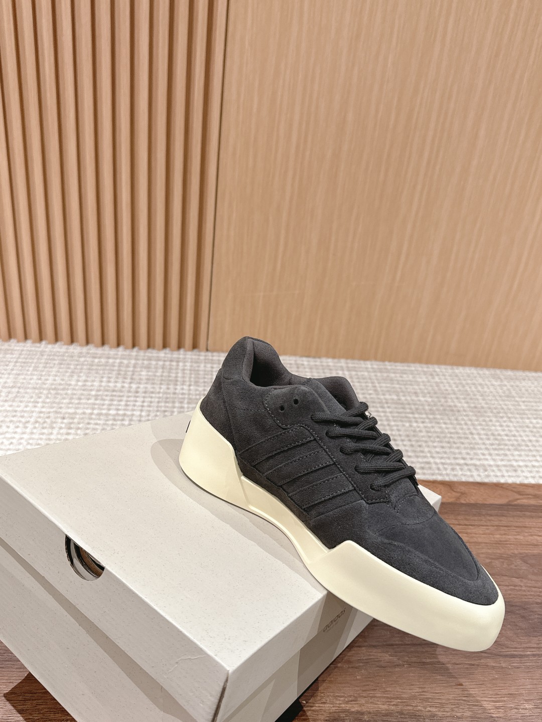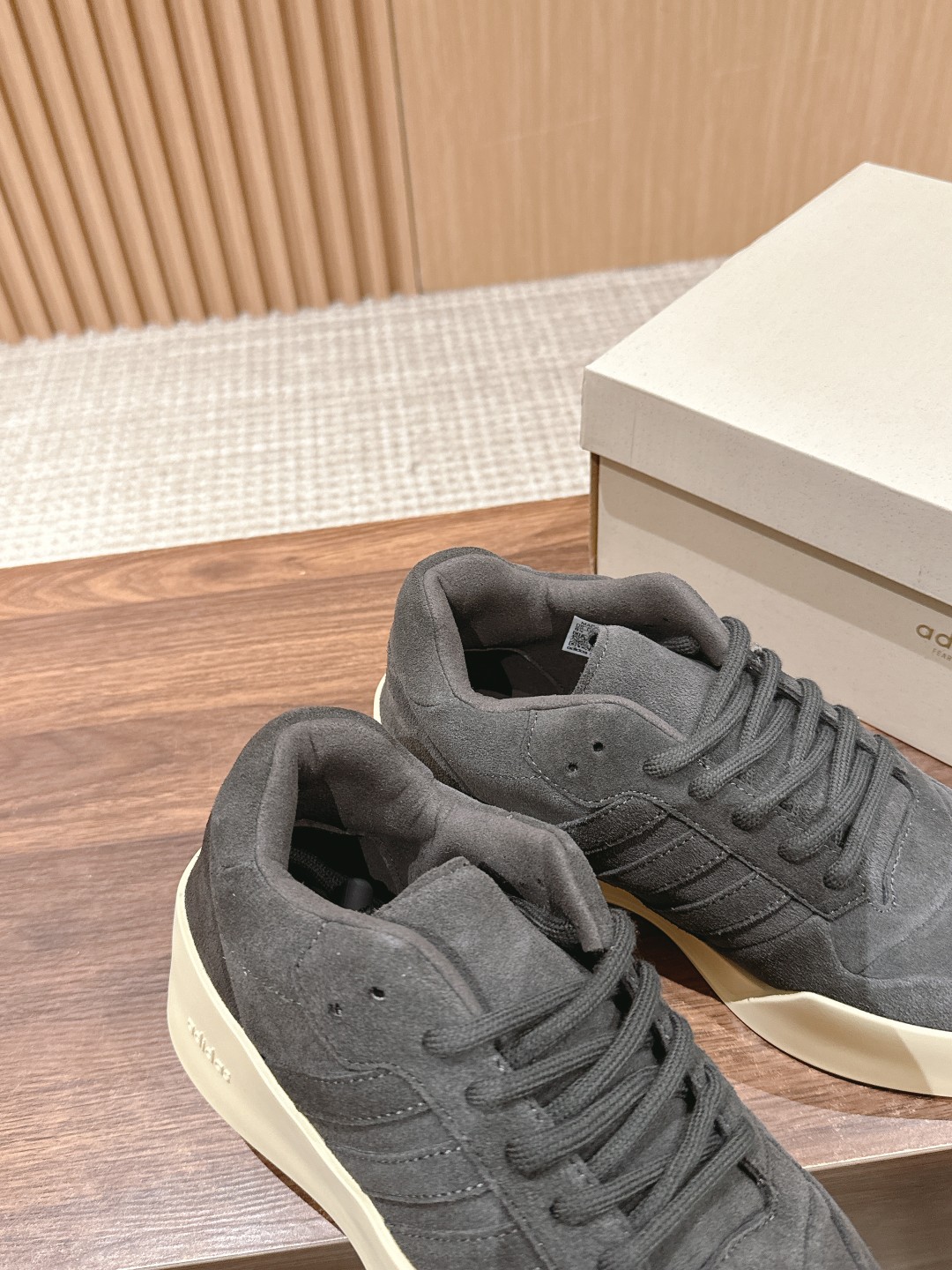 [Top Version] FOG x Adidas collaboration shoe. This shoe features a suede panel design, with "adidas" printed on the heel, the classic three-stripe logo on the side, and "Fear of God" branding on the heel area, creating a very soft visual effect for the overall look.
