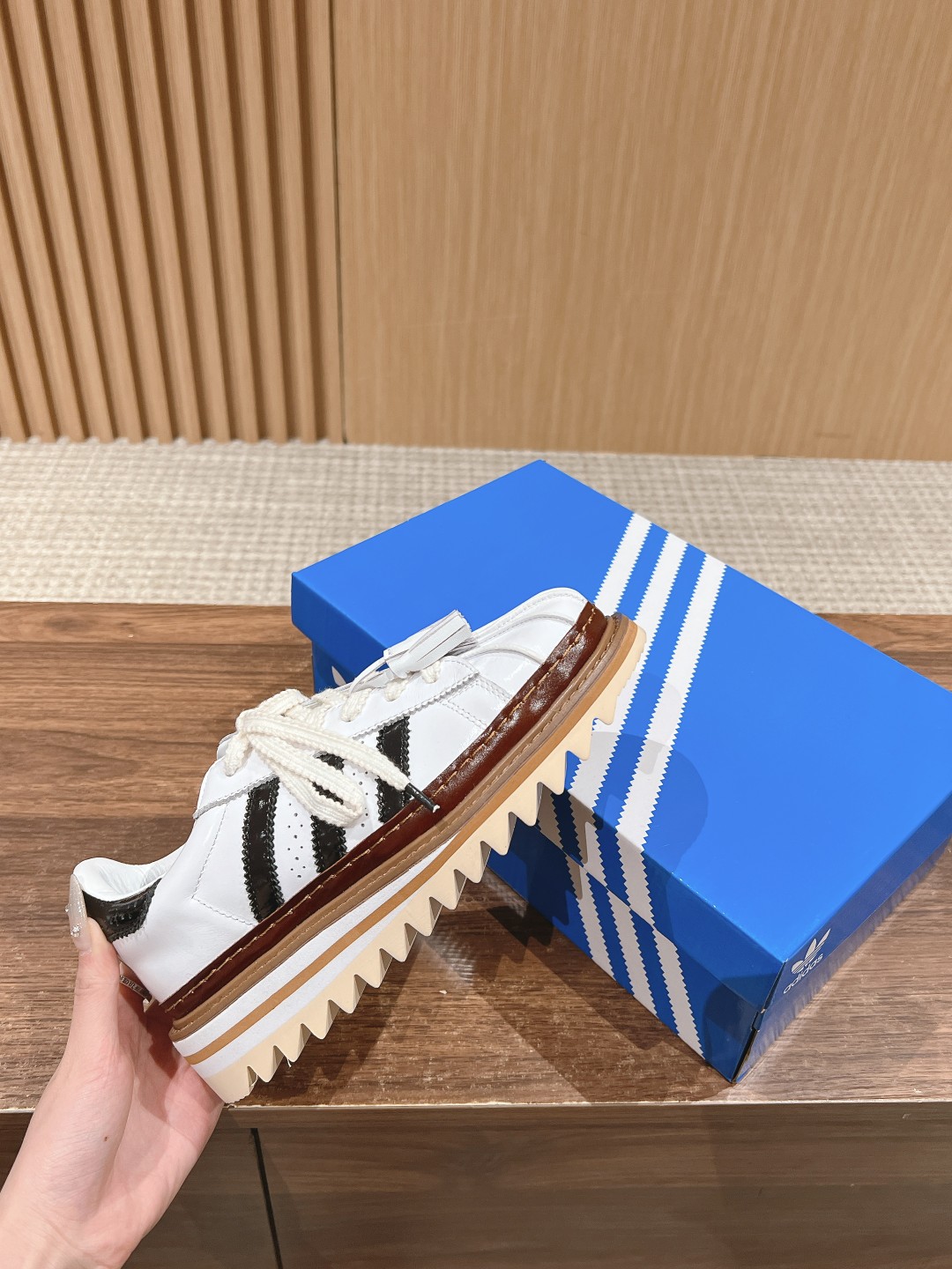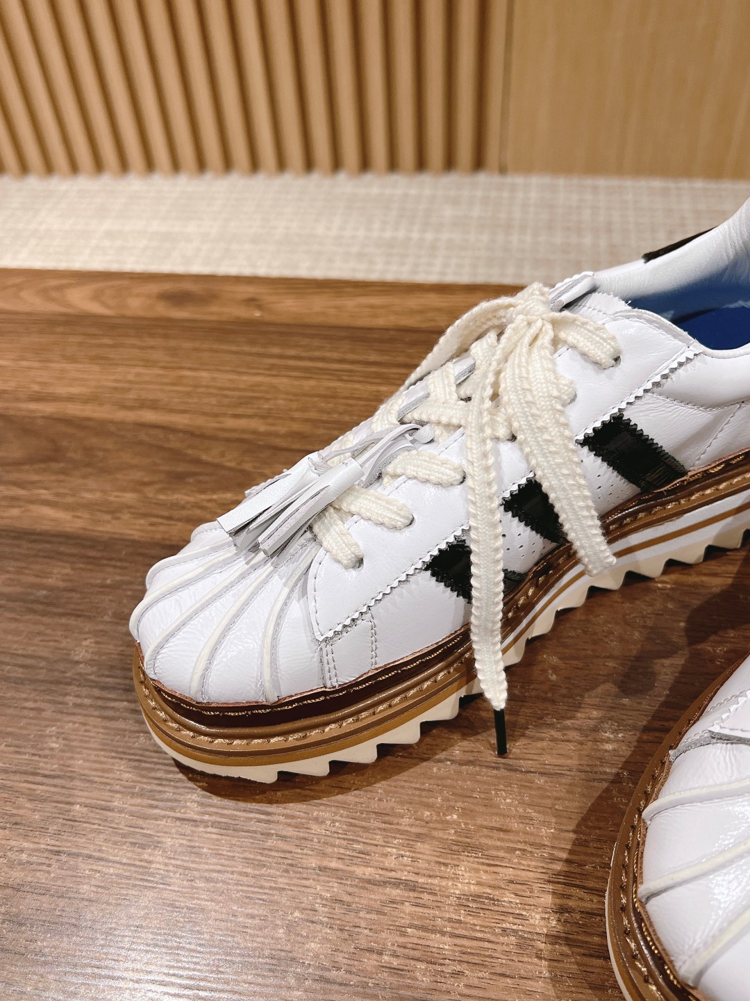 These shoes are indeed very popular! Previously, everyone thought these shoes would look very heavy, but they are not heavy at all. The entire sole is made of foam material. Like the previous black breath pair, these have a serrated sole, which is very distinctive. The upper features a classic leather shell toe. The 5cm height increase is just what I wanted. Made of cowhide material with sheepskin lining.
