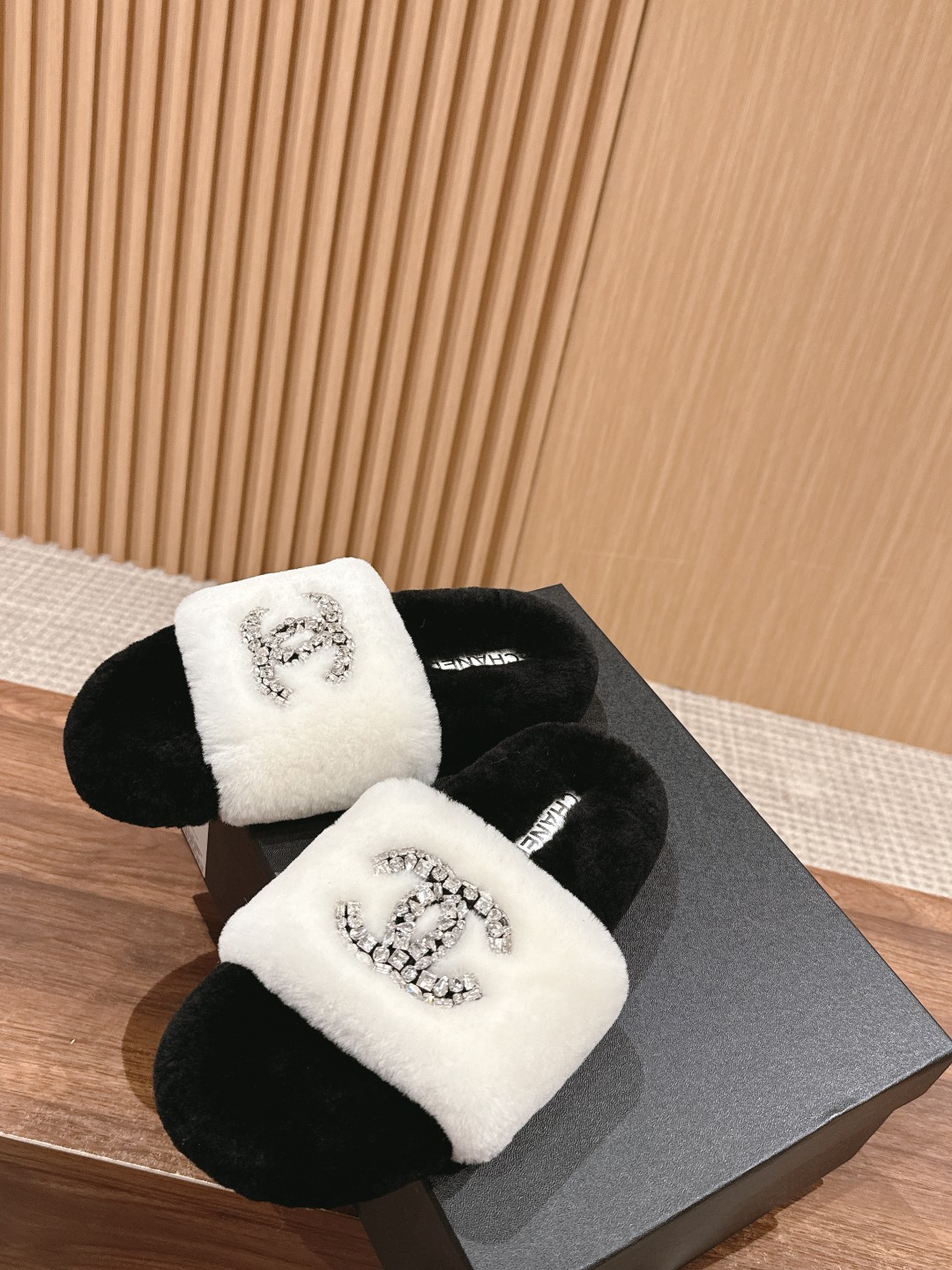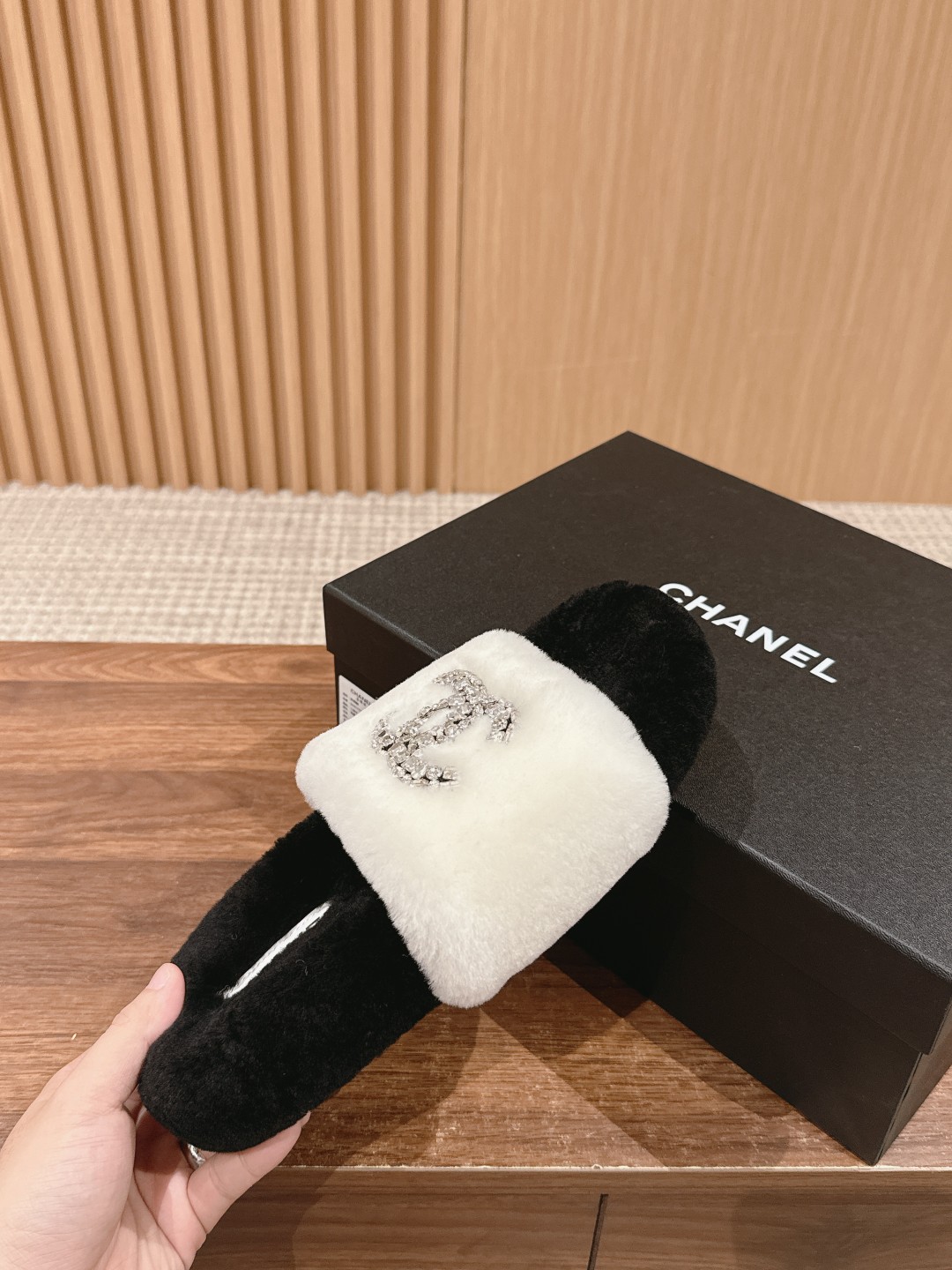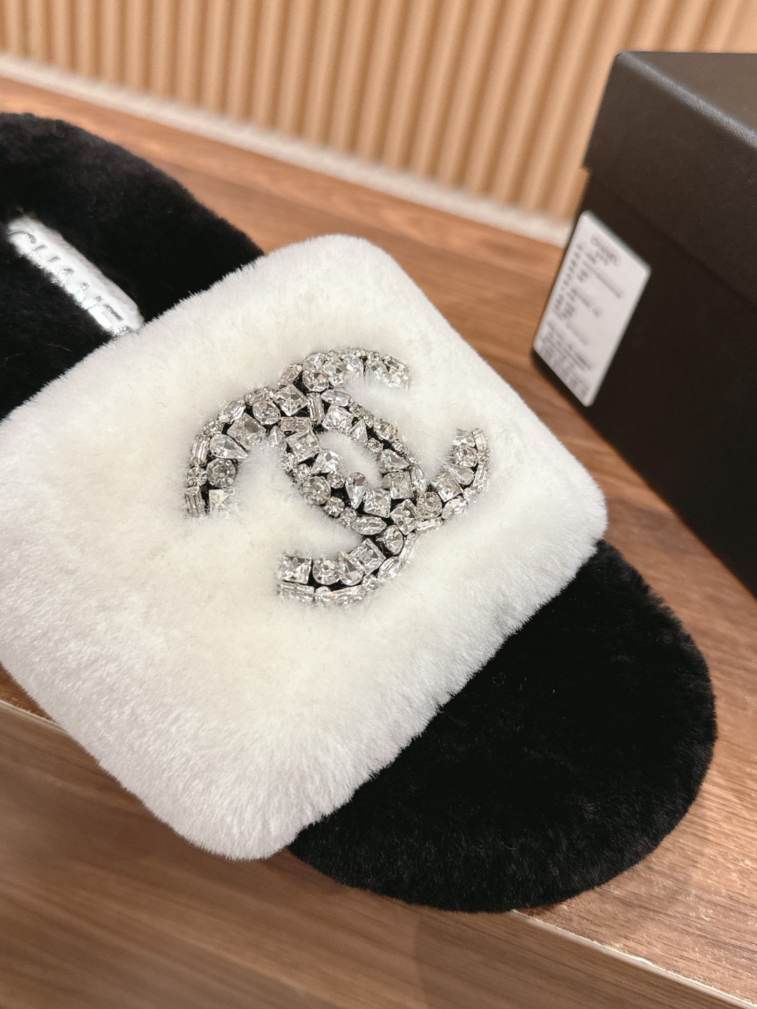 [Top Version] CHANEL Autumn Winter Crystal Embellished Fur Slippers, casual and versatile yet stylish. Custom thickened wool, entirely hand-stitched for greater durability. Festival wool material. Size: 35-39 (40/41 custom-made, no returns or exchanges)