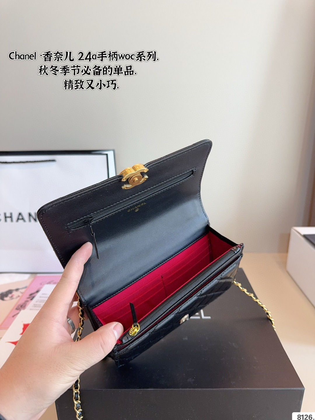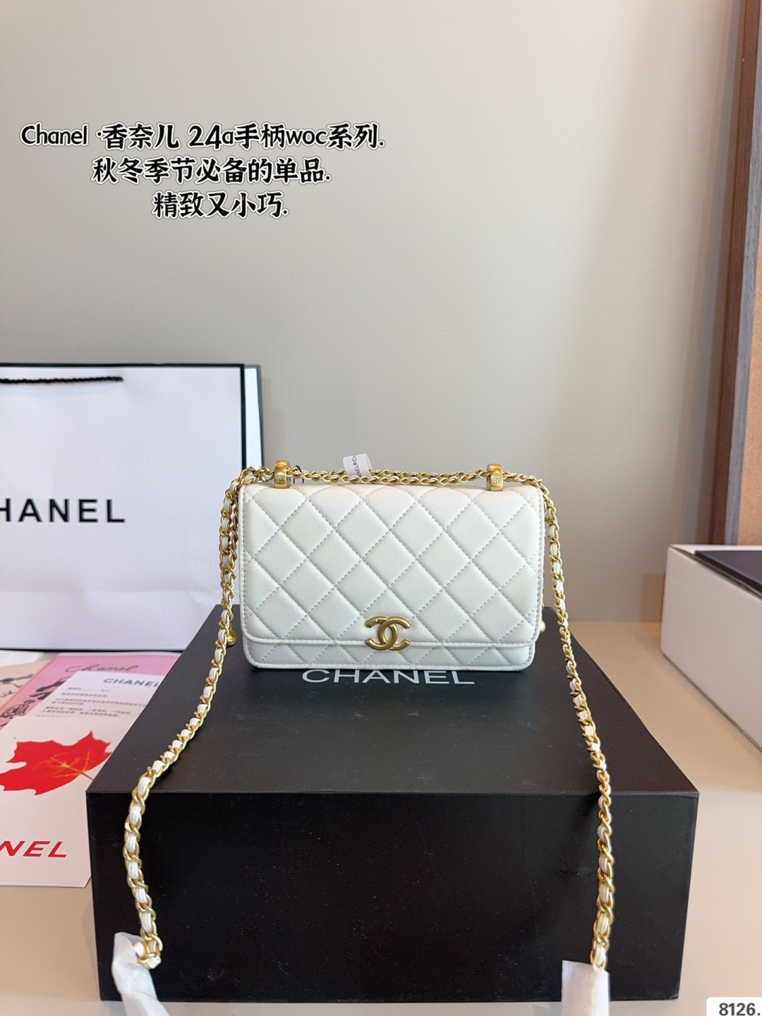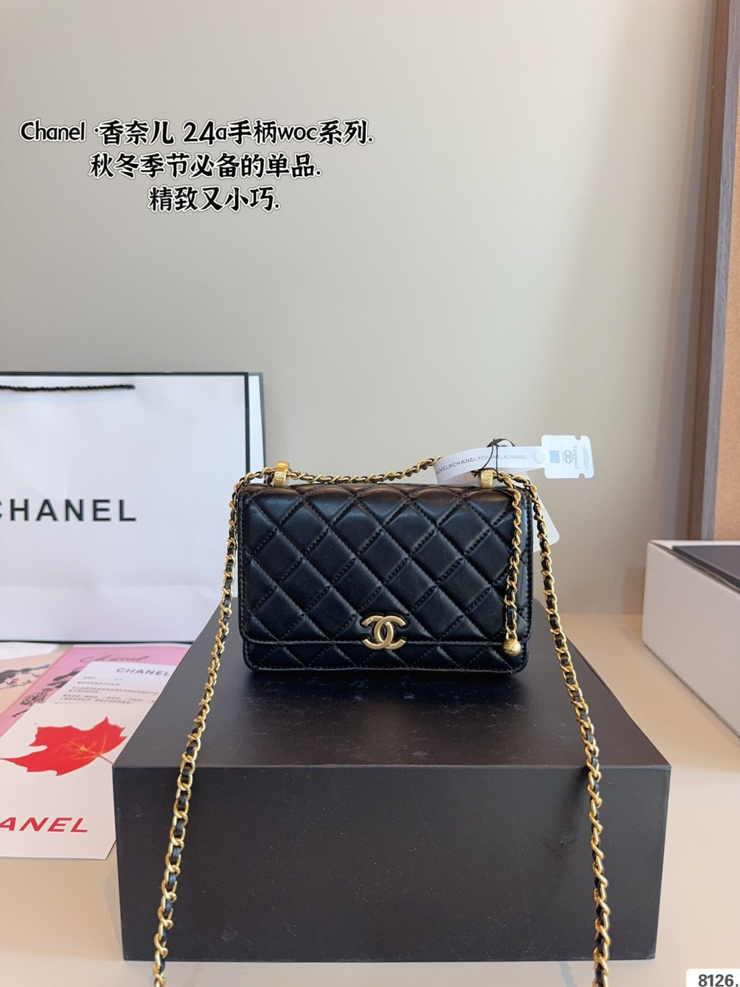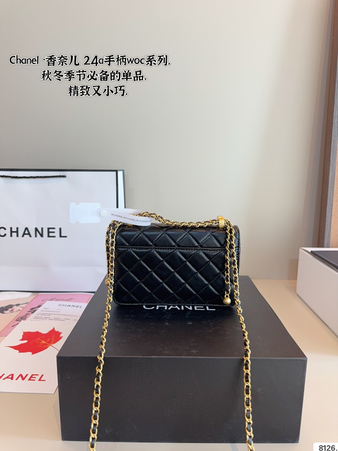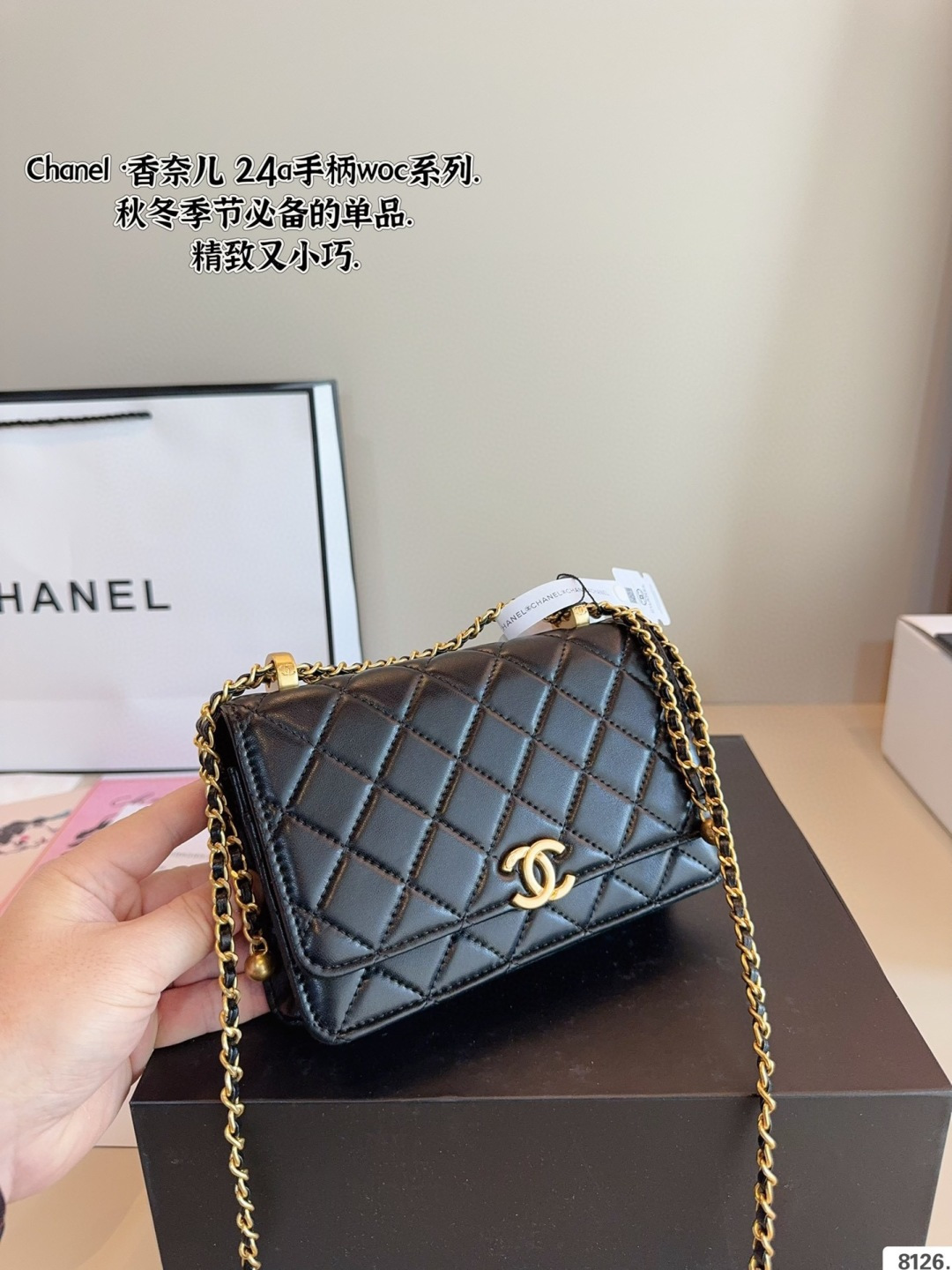 Chanel 23S Double Gold Ball WOC Lucky Bag. Can be worn crossbody or on the shoulder. The chain can be tucked inside the bag to use as a clutch. Looks very elegant when worn. Although it's small, it's quite spacious. Inside, there are card slots, a zippered compartment, and a coin pocket. Compact and practical, a must-have for everyone. Wearing effect is excellent. Dimensions: 19*7*12cm