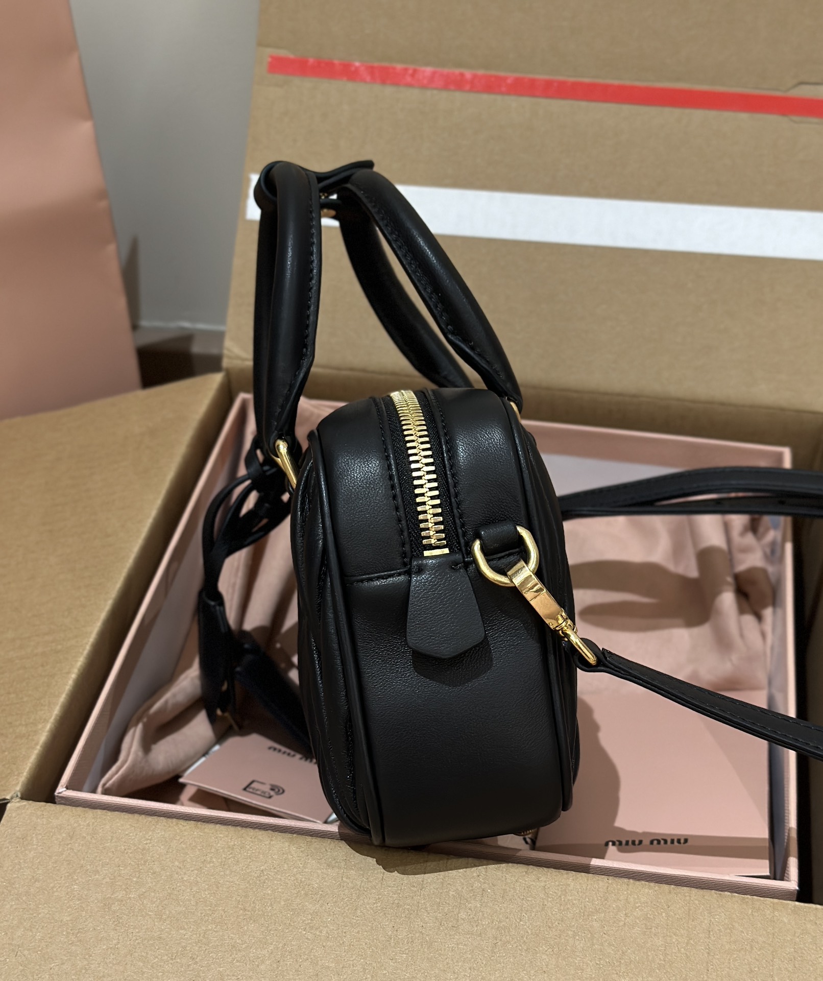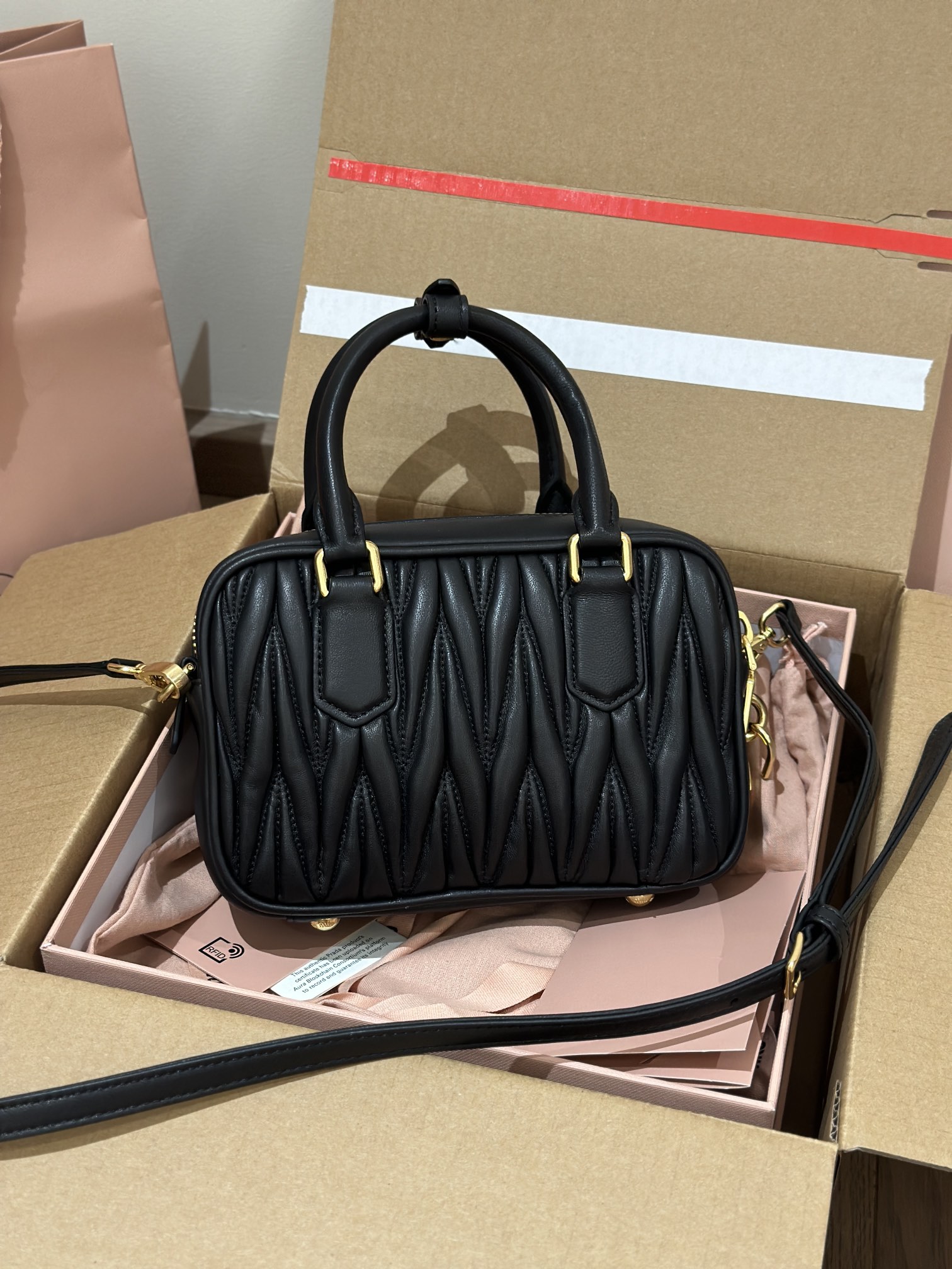 This elegant bowling bag. It's been incredibly popular this year, taking over the entire fashion scene. Made from imported Spanish lambskin with a crumpled, retro texture, the small square shape features a clean and sharp design. The iconic embossed logo and interior are designed to meet daily commuting needs, suitable for both hand-carry and cross-body wear. It's truly captivating.