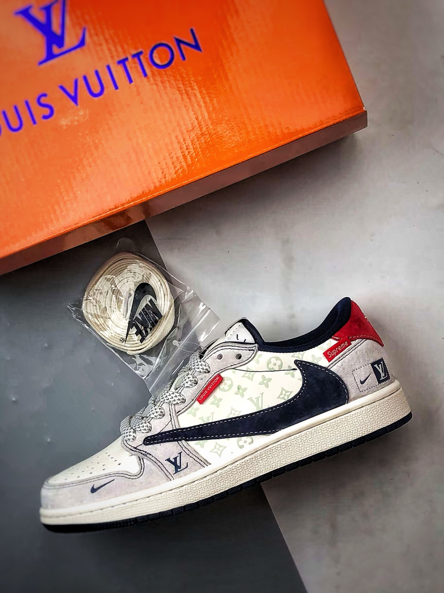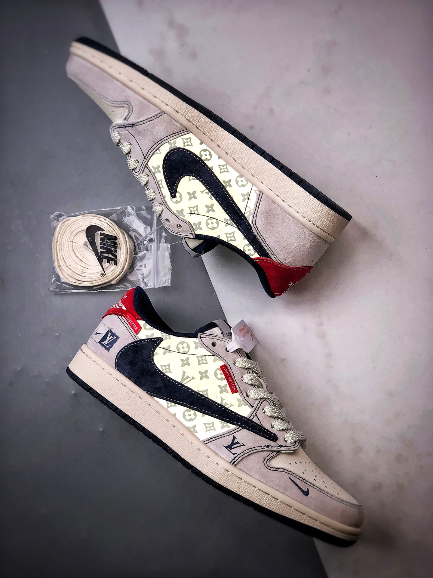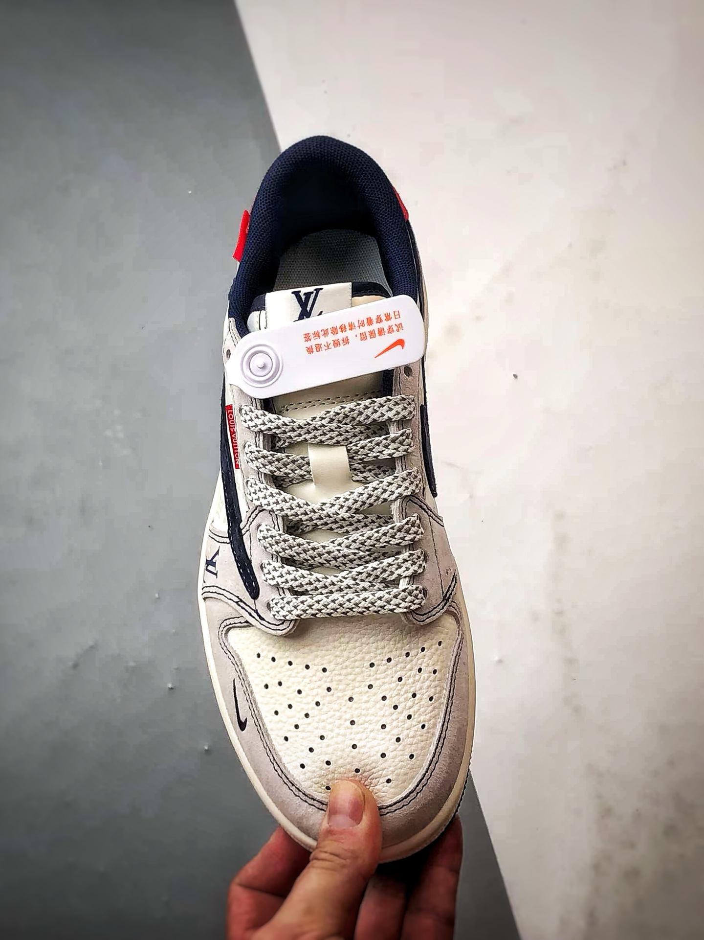 LV Print in Beige, Gray, and Navy Blue Reverse Swoosh