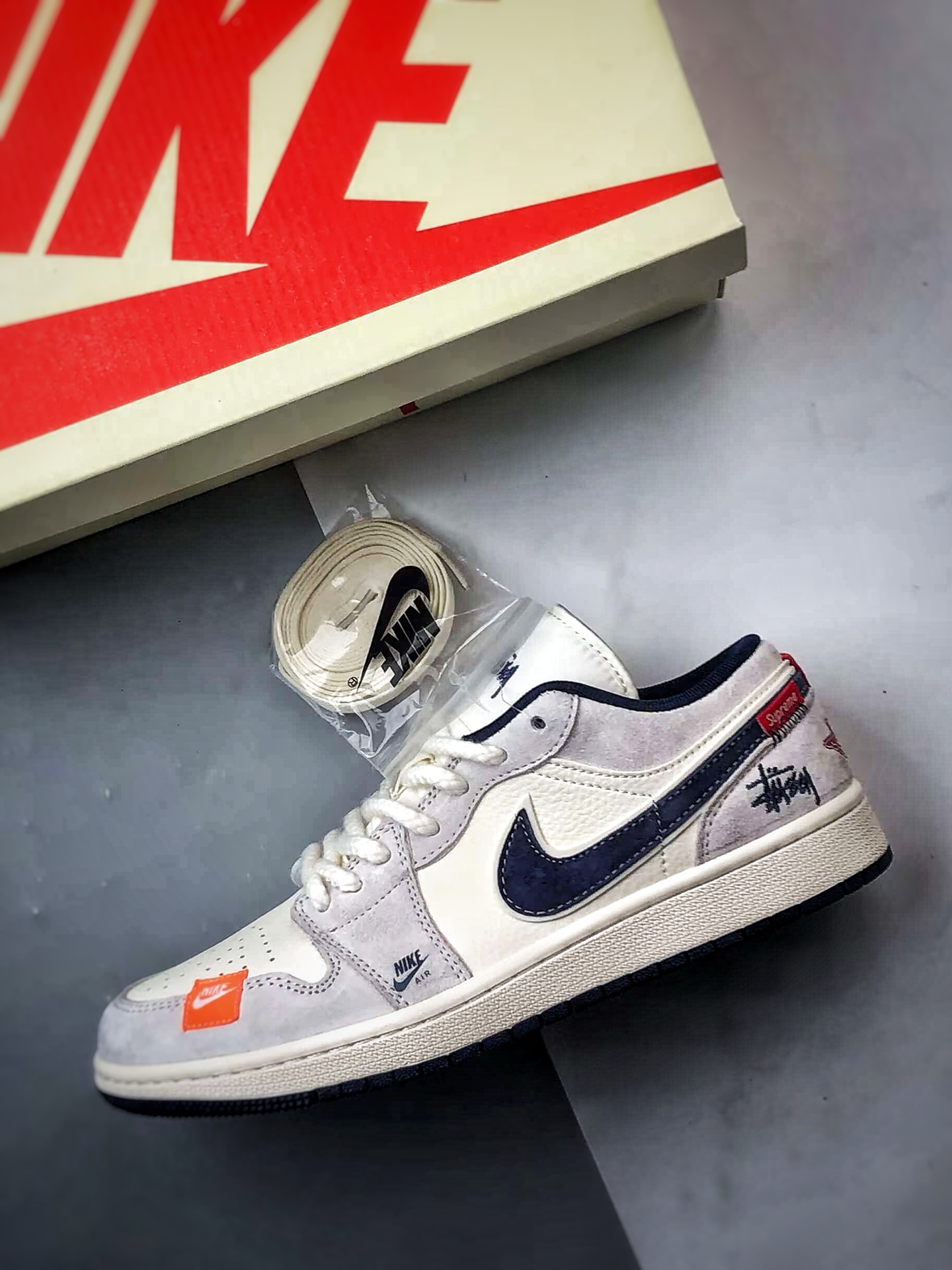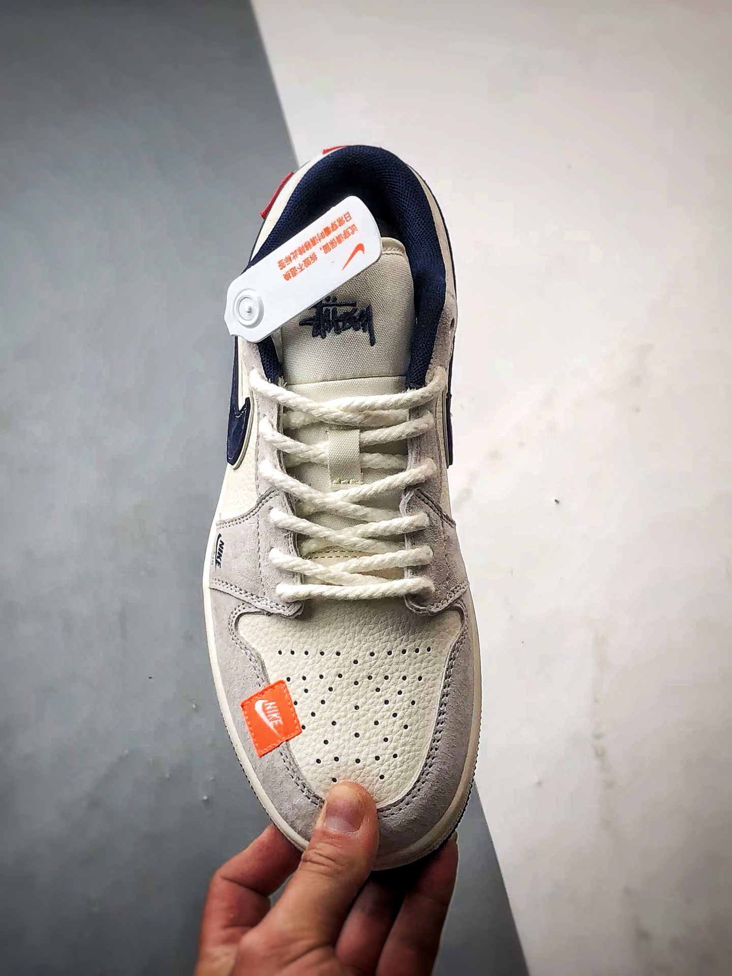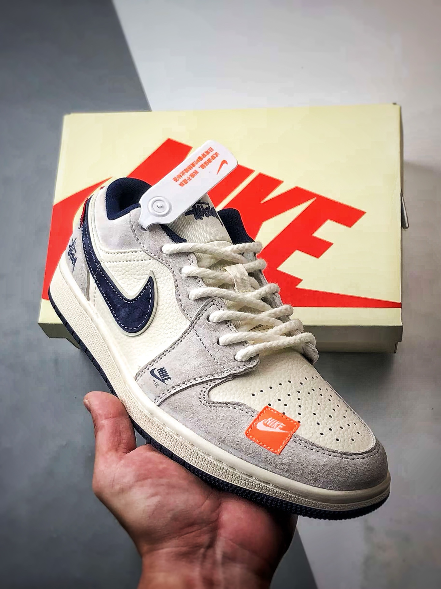 Stussy Light Gray and Navy Blue, large factory original craftsmanship.