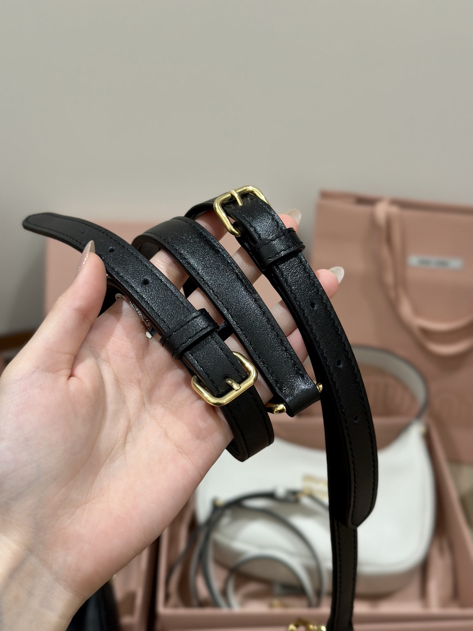 Full leather material, the strap is like a belt-style hand-carry shoulder strap. (Includes a crossbody strap inside)