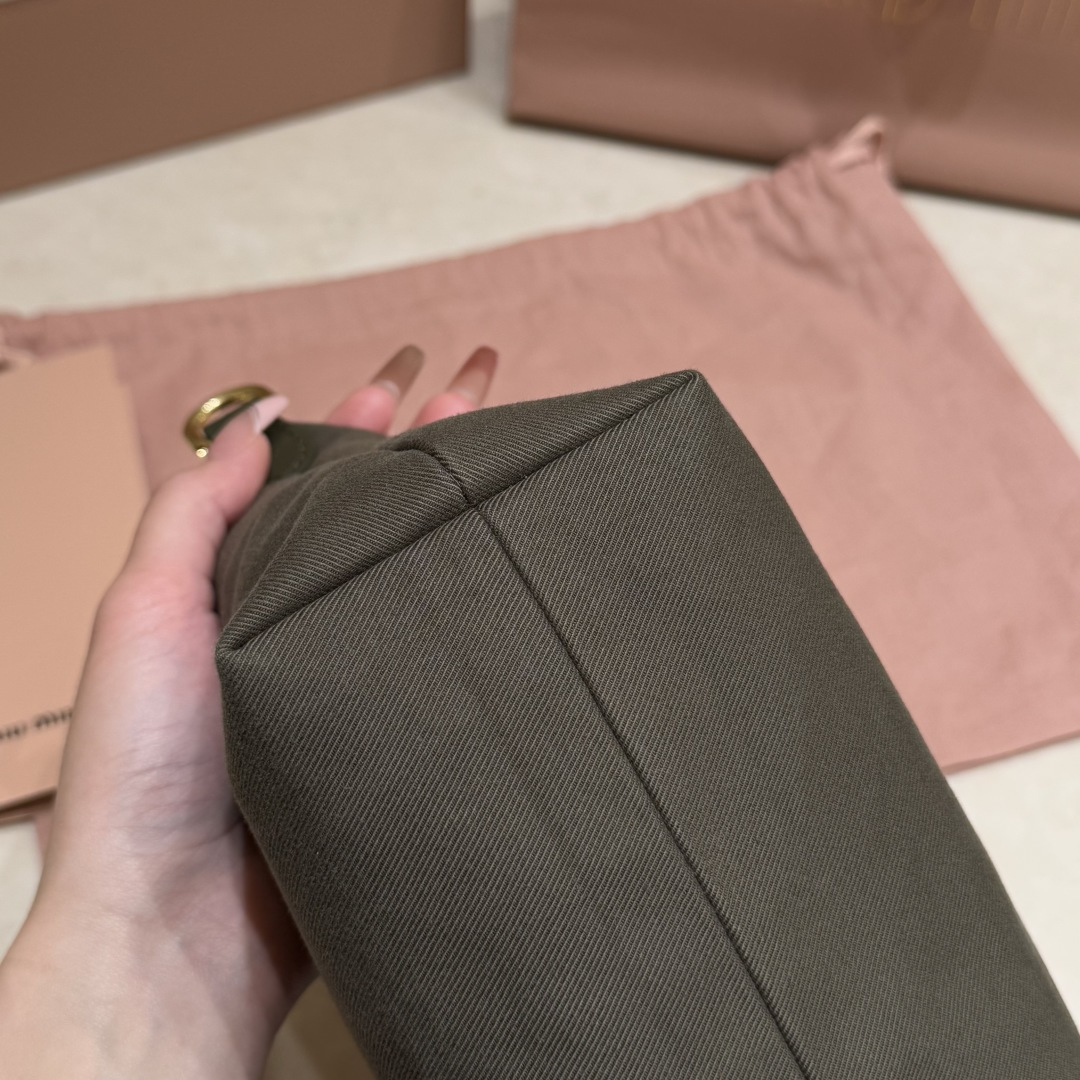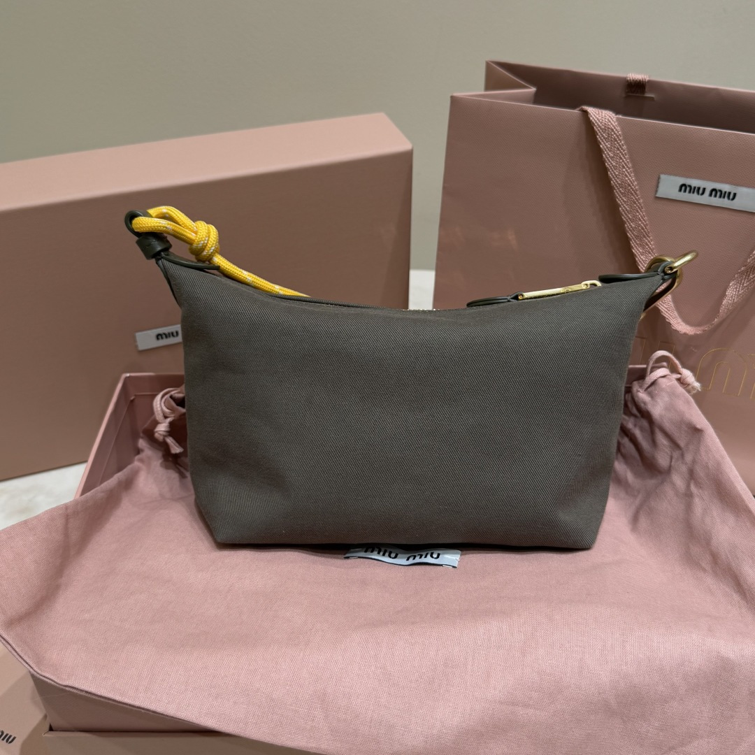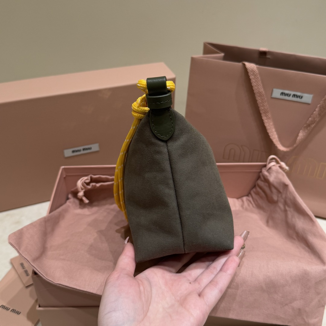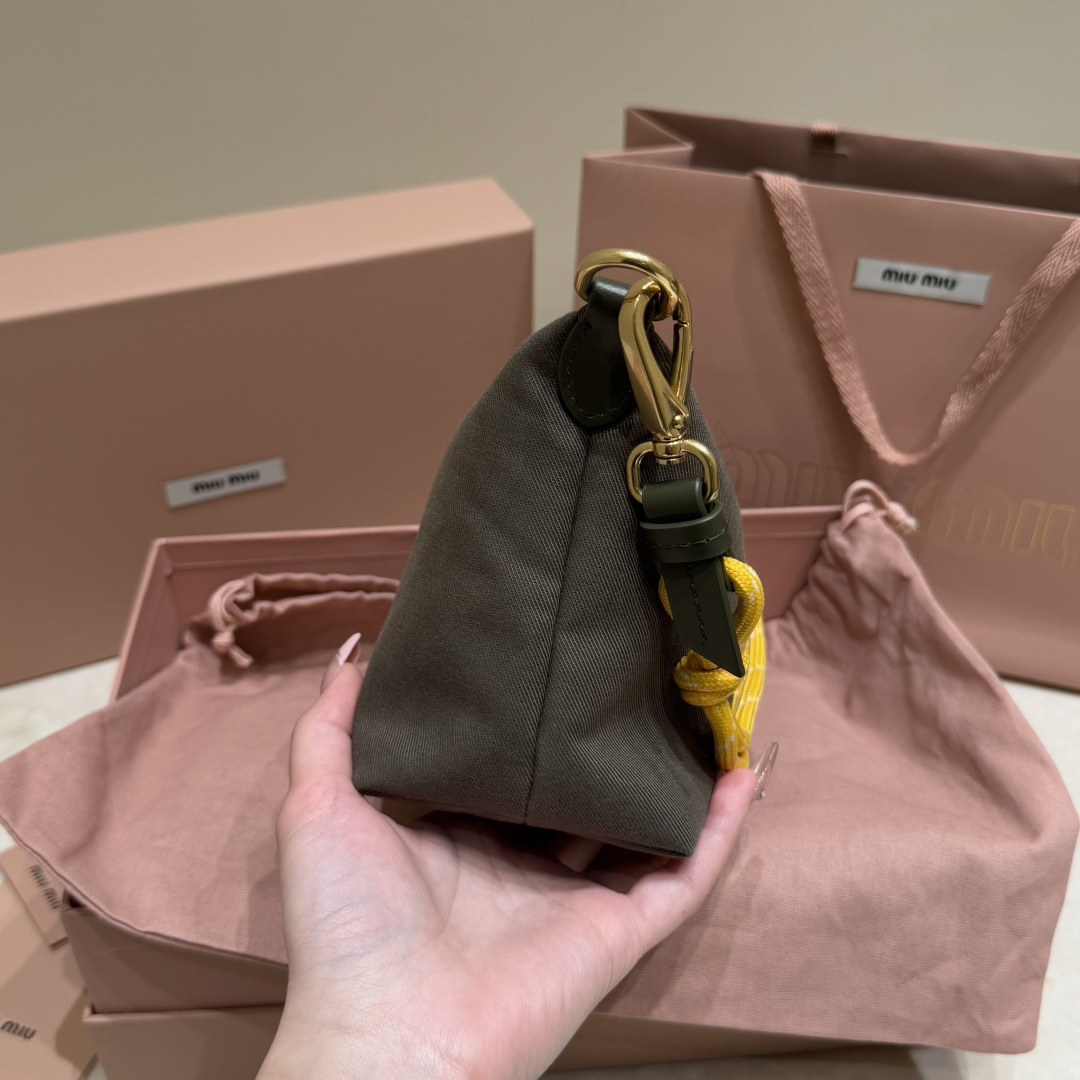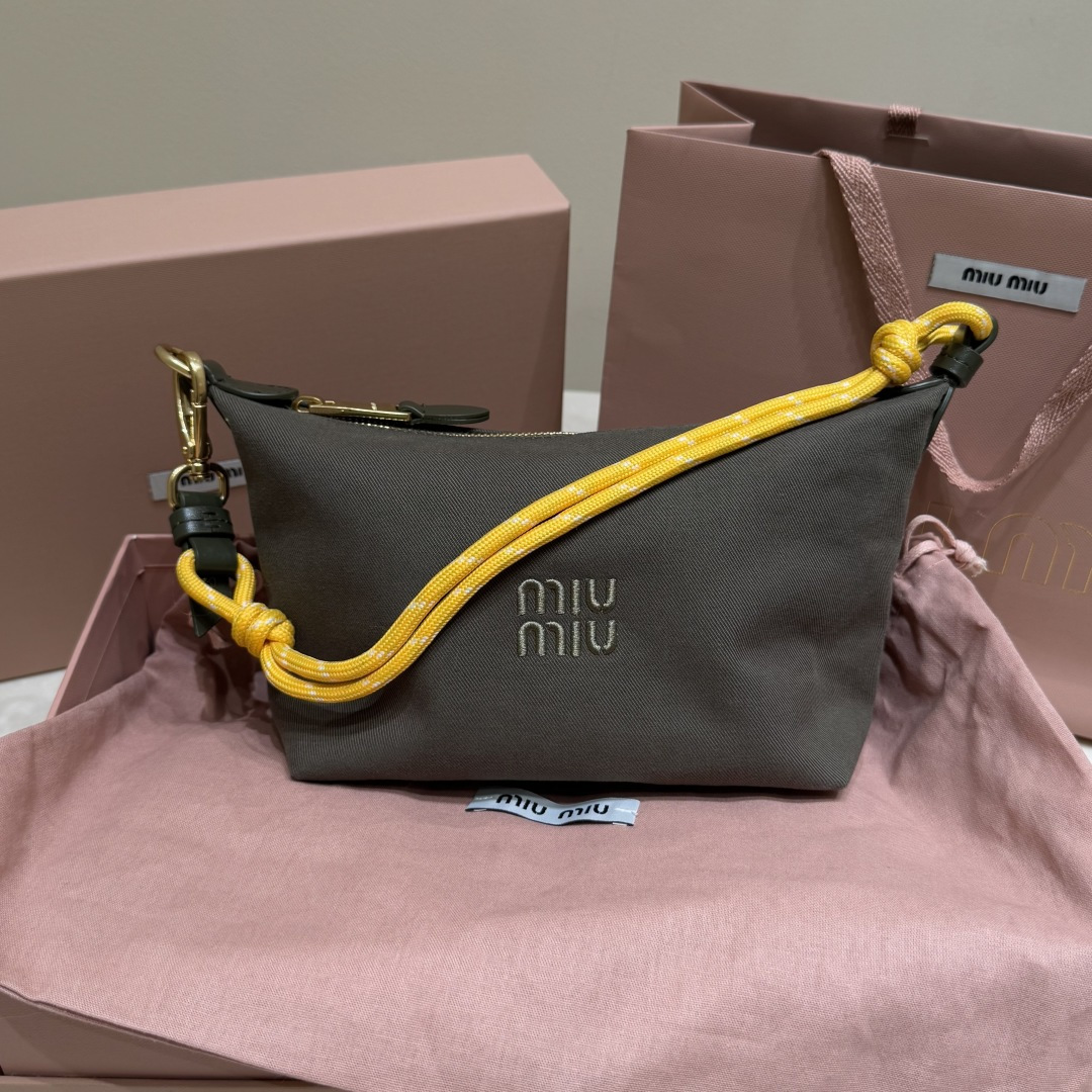 This series of small bags features a more streamlined design due to the use of twill waterproof gabardine fabric and embroidered logos in matching color schemes. The two-tone woven wrist strap is a signature element of Miu style. The three colors in canvas material offer excellent capacity—you can even add an extension strap to wear it as a crossbody bag. It's highly cost-effective, stylish, and spacious.