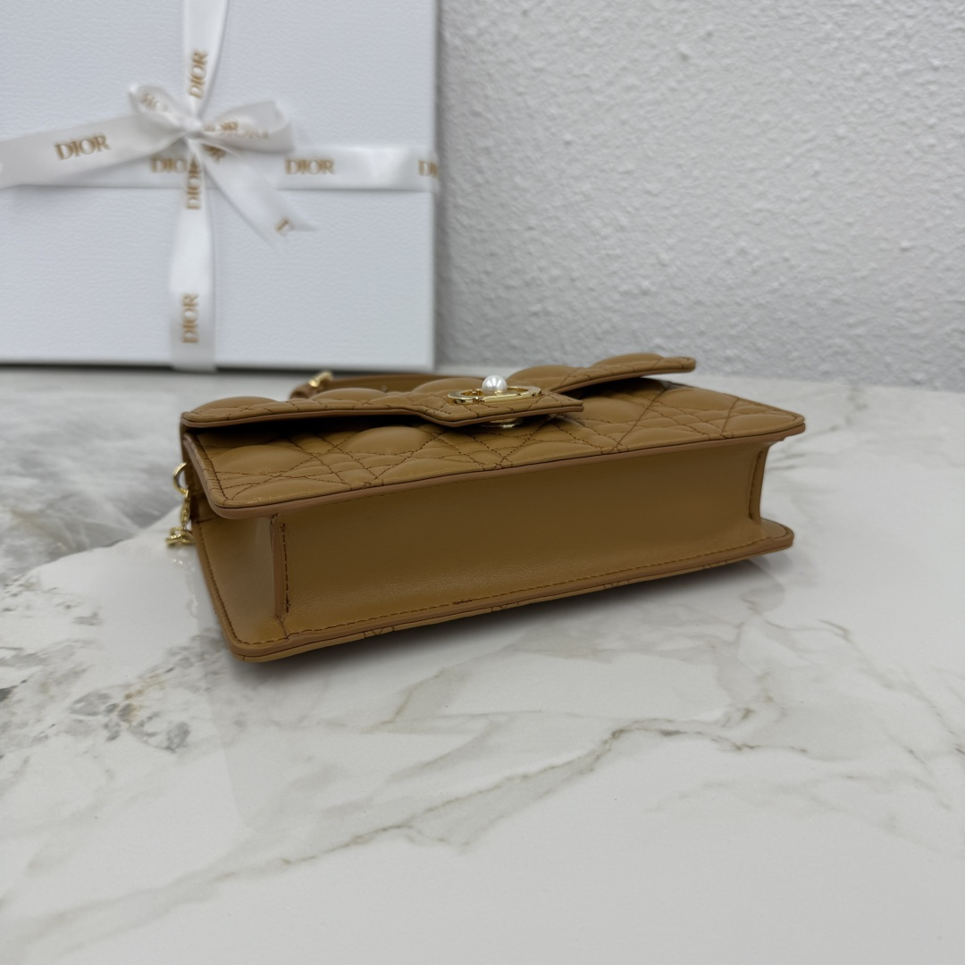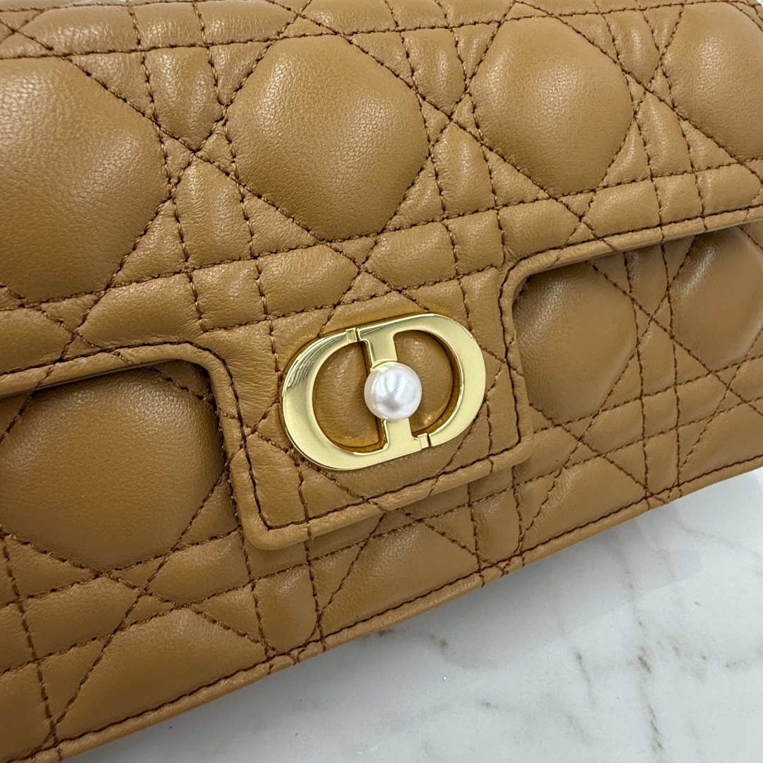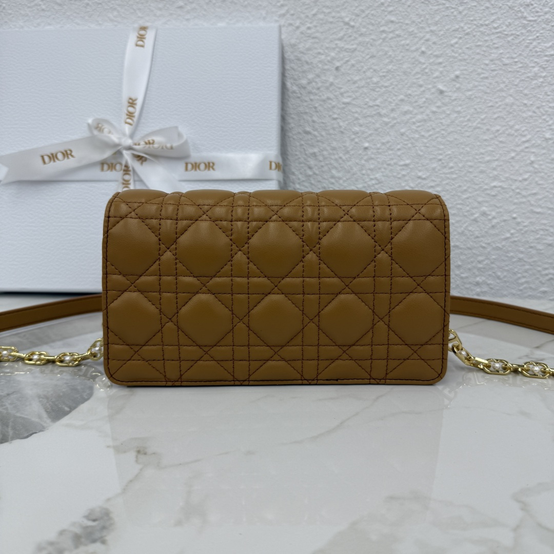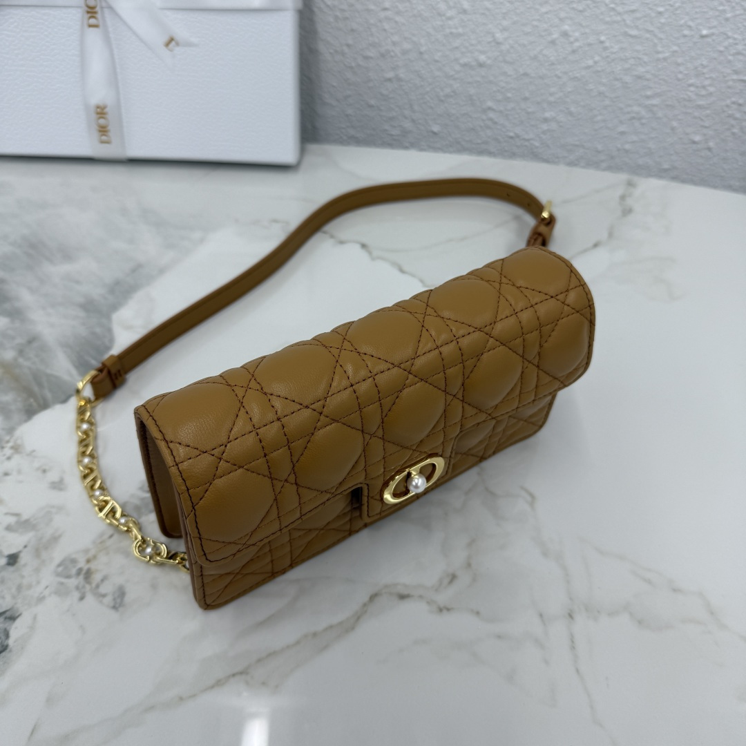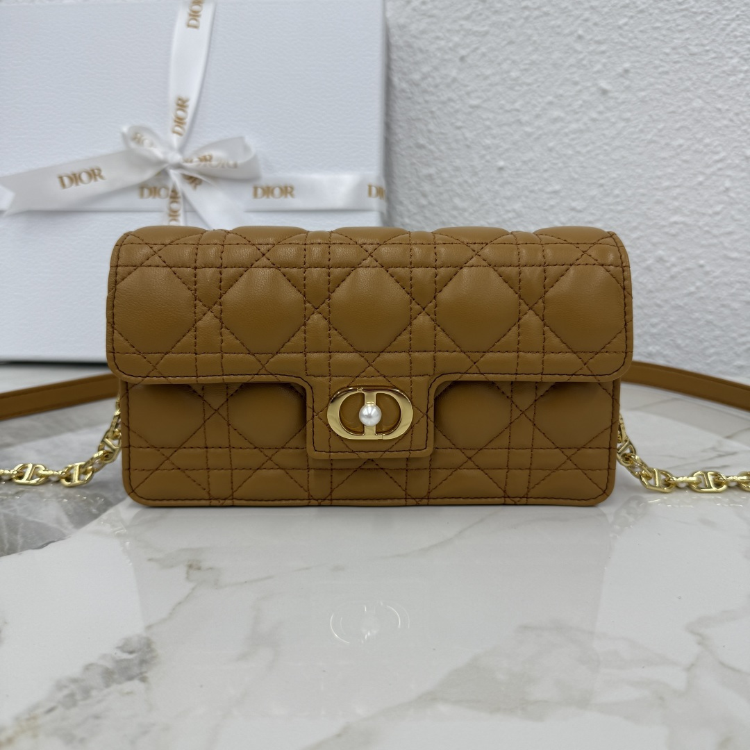 This Dior Jolie mini chain bag is a new ready-to-wear piece from the Fall/Winter 2025 collection, combining elegant style with practical functionality. It is meticulously crafted from brown lambskin leather and features a cannage stitch pattern. The flap is adorned with a vintage gold-finished metal CD logo embellished with white resin beads. Inside, there is one compartment to hold various essentials. The bag comes with an adjustable and detachable CD chain strap, also decorated with white resin beads and a leather strap, making it suitable for daily wear or evening outfits—comfortably carried by hand, on the shoulder, or across the body.