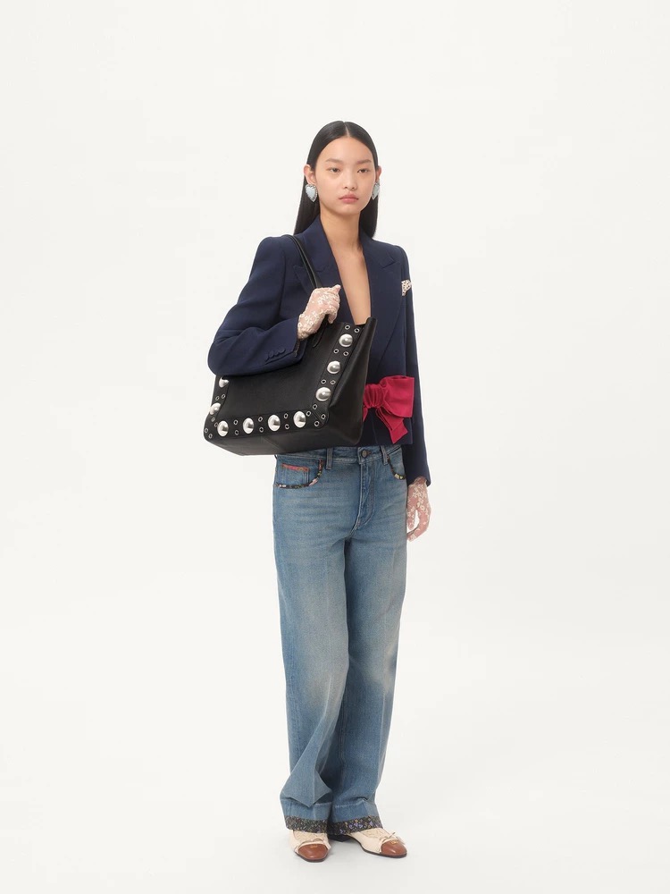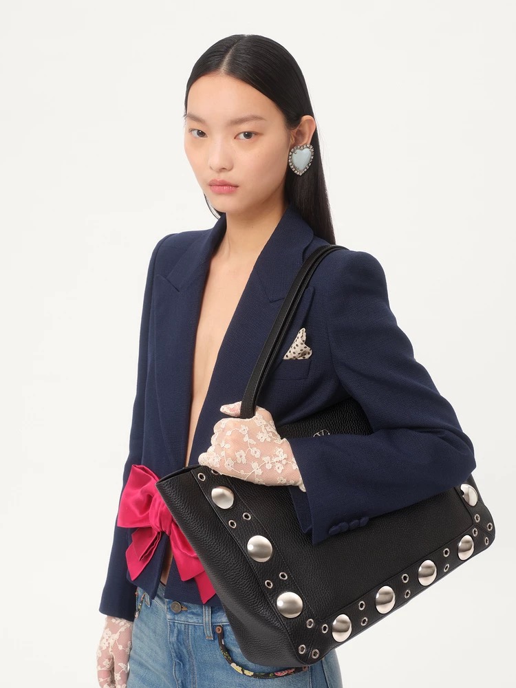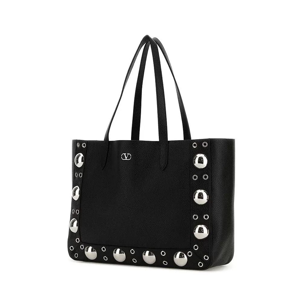 Medium tote bag, adorned with spherical studs and circular cut-out decorations. This bag can be carried by hand or comfortably worn over the shoulder via the handles.
