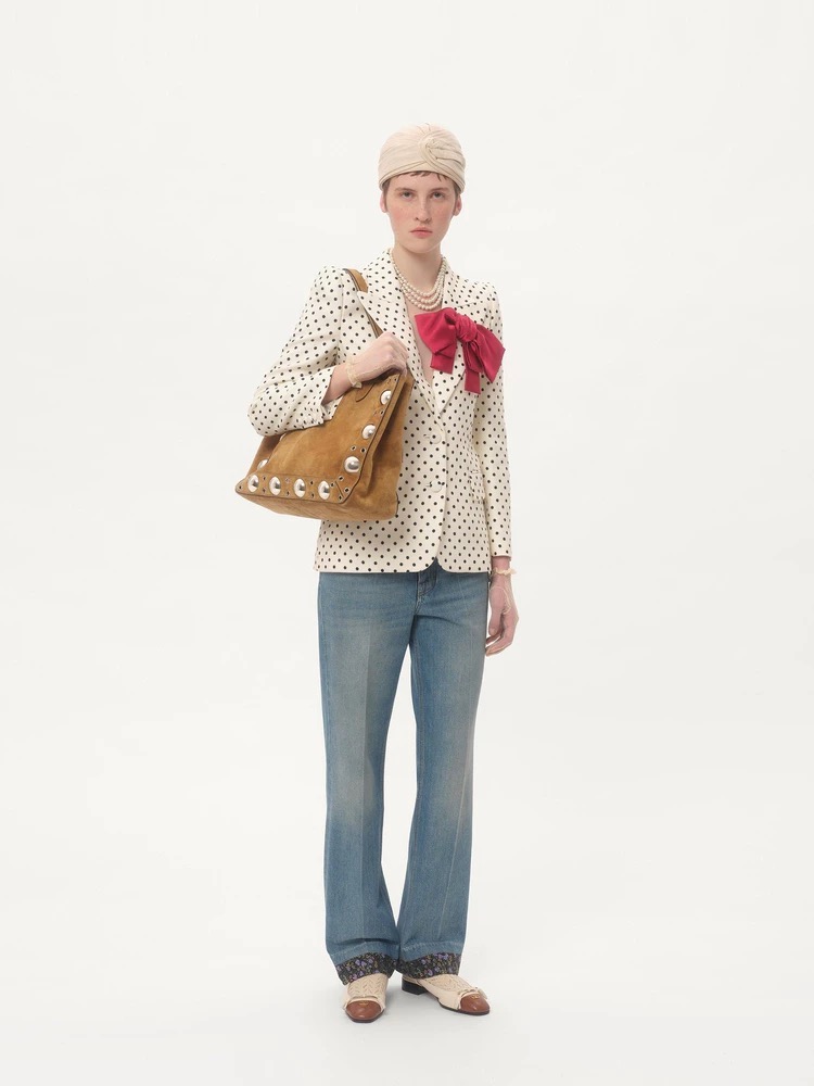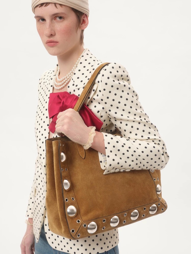 Medium tote bag, decorated with spherical studs and round cut-out details. This bag can be carried by hand or comfortably worn over the shoulder using the handles.