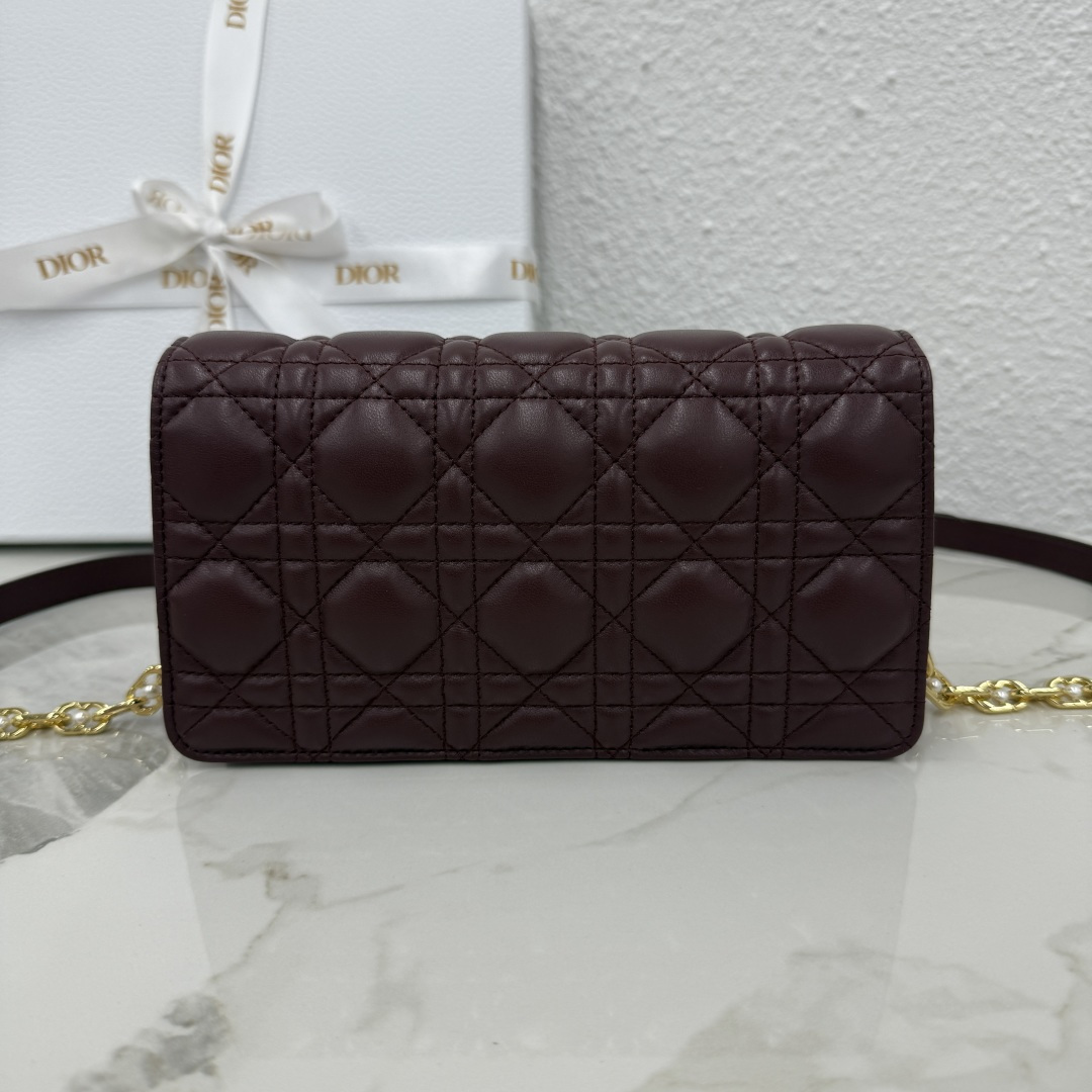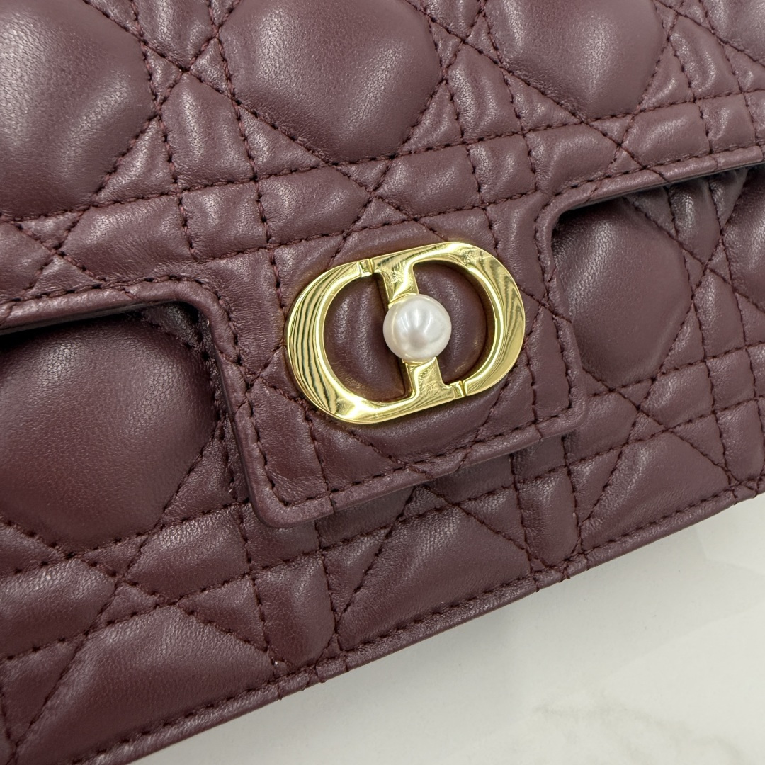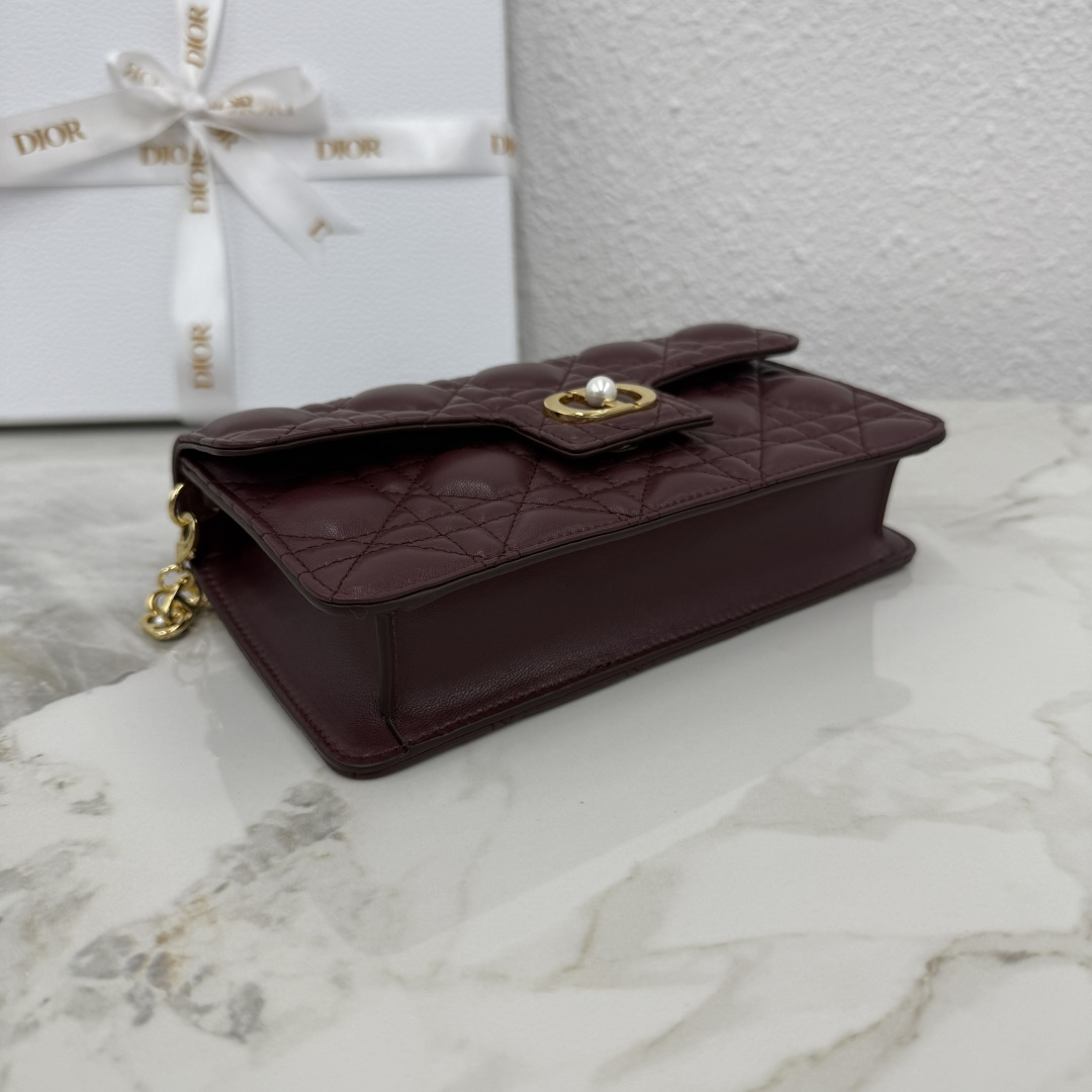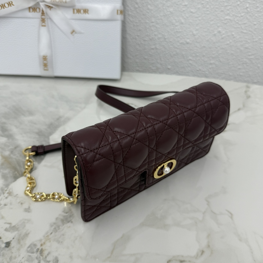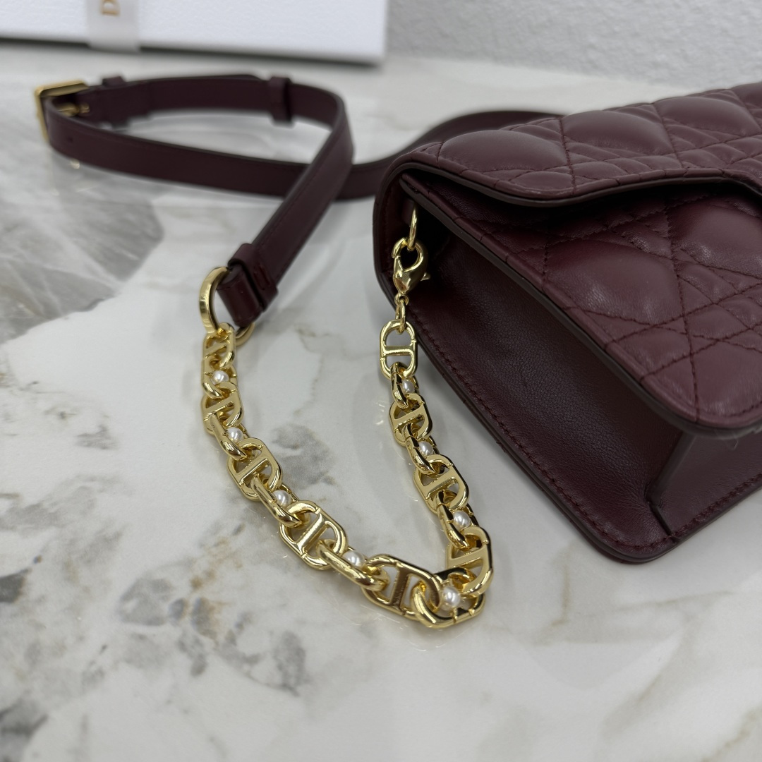 This Dior Jolie mini chain bag is a new addition to the 2025 autumn-winter ready-to-wear collection, combining elegant style with practical functionality. Meticulously crafted from burgundy lambskin, it features a cannage stitch pattern and a flap adorned with a vintage gold-finished metal CD logo embellished with white resin beads. Inside, there is one compartment to hold various essentials. The adjustable and detachable CD chain strap is interspersed with white resin beads and finished with a leather strap, allowing for comfortable hand-carry, shoulder wear, or cross-body styling with daily outfits or evening wear.