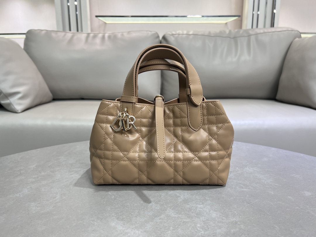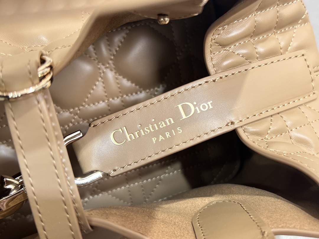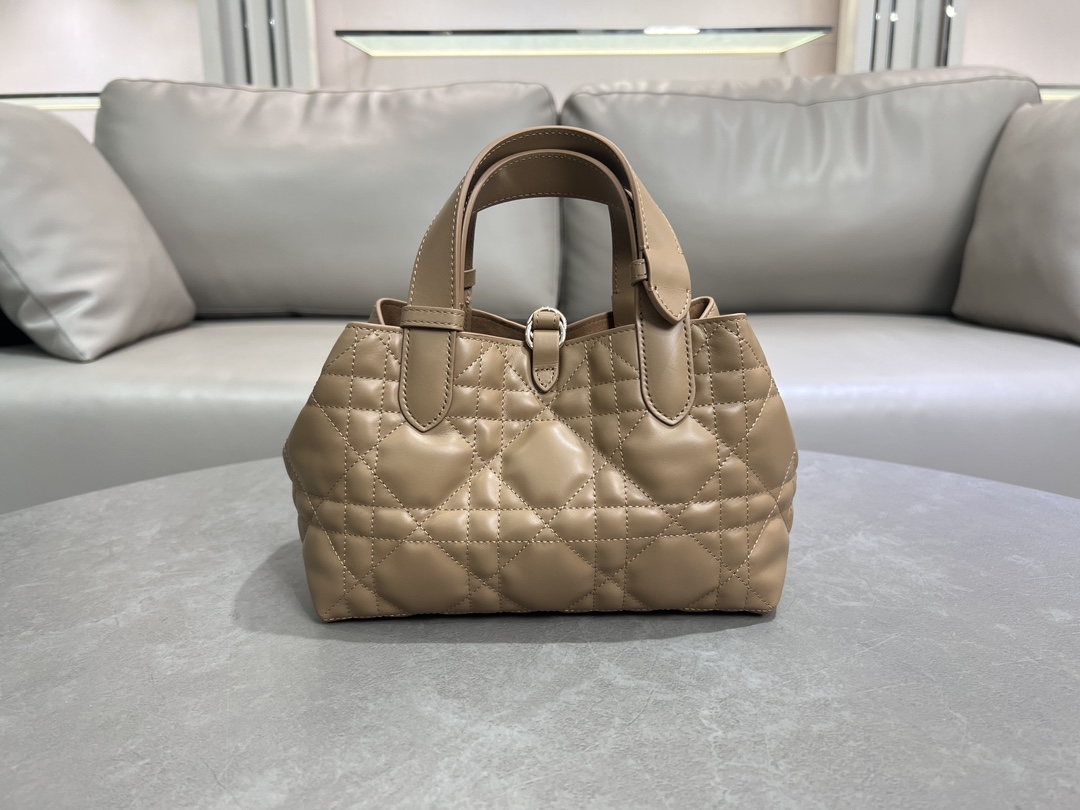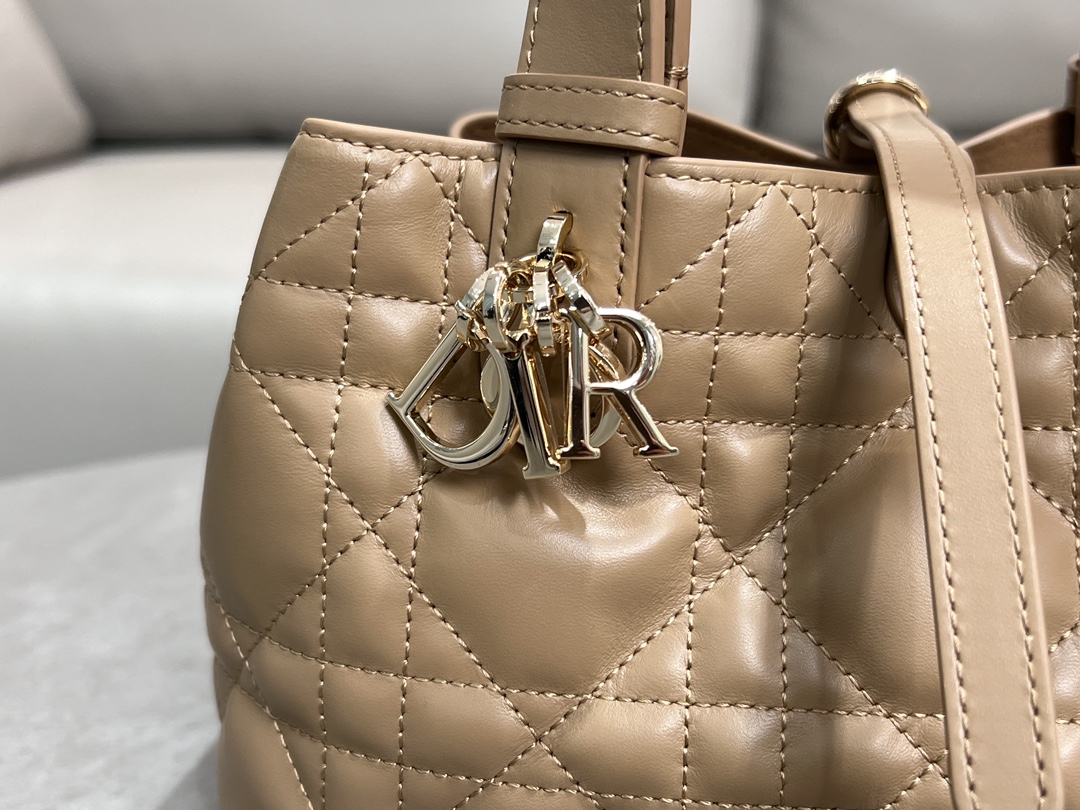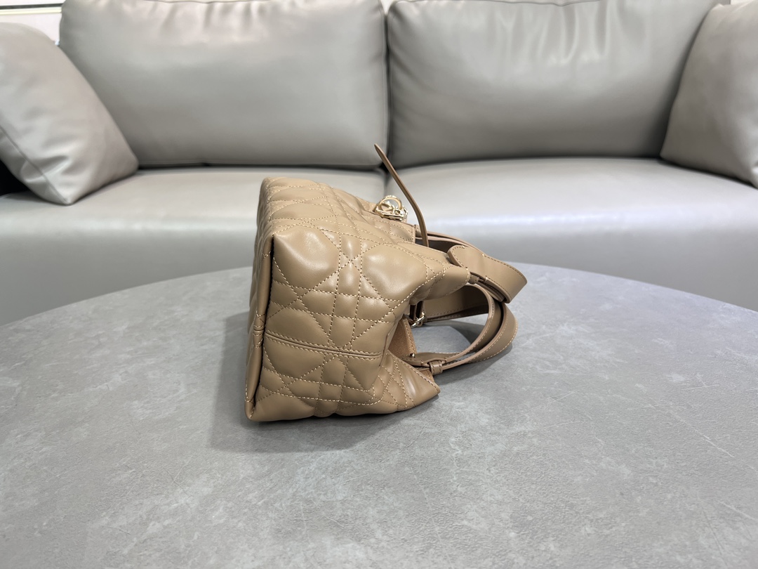 This Dior Toujours handbag made a stunning appearance in the Spring-Summer 2023 collection runway show, featuring a uniquely stylish, casual, and practical design. Meticulously crafted from caramel cowhide leather, it is adorned with oversized cannage stitching. The spacious interior compartment, along with a small pouch, allows for neat organization of various daily essentials. It features a leather tie closure for securely storing items, as well as a CD Lock with the letter 'D' knob closure. The sides are adjustable, enhancing its elegance. This small style comes with leather handles that have adjustable details, making it suitable for hand carry or shoulder wear.